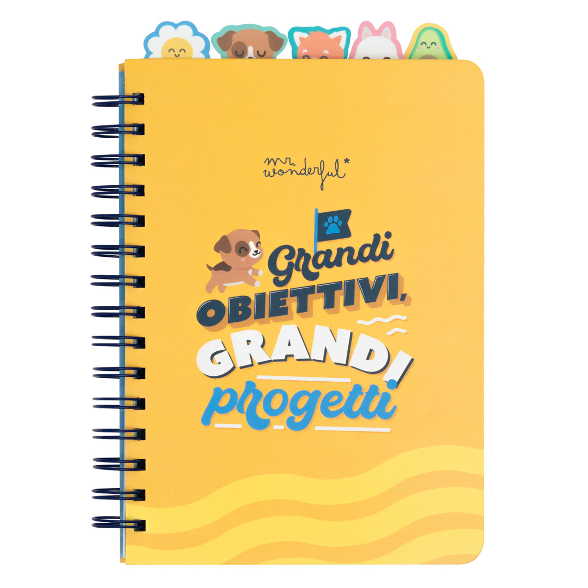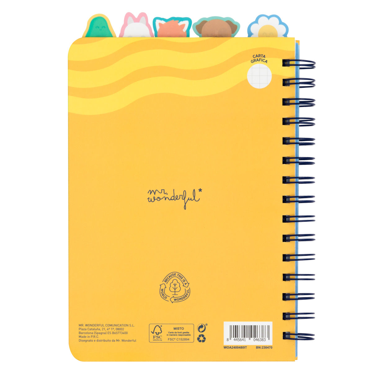Quaderno A5 a quadretti. Ha 5 divisori interni con linguette, ciascuno con un personaggio di Mr. Wonderful (margherita, cane, coniglio, panda rosso e avocado), il che lo rende ideale per essere diviso per materie o argomenti. Con 160 pagine.