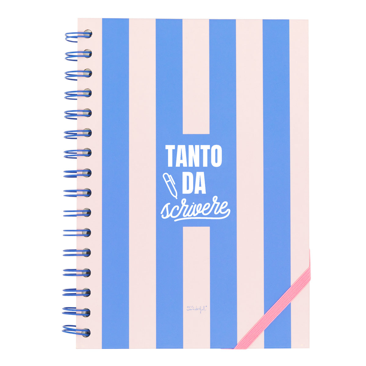 Quaderno rosa in formato A5, con copertina rigida e rilegatura a spirale. Con 125 fogli di carta da 90 gr. certificata FSC, che garantisce siano stati prodotti con carta proveniente da foreste gestite in modo responsabile, a righe e con gomma elastica per chiuderlo. Include un foglio di adesivi.
