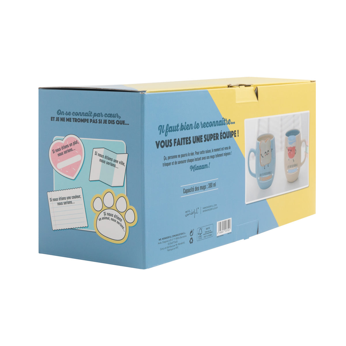 Ce set tellement original a un design avec des reliefs et représente n otre couple emblématique de la tartine et du pot de confiture Mr. Wonderful. Les couleurs et le st yle des mugs vont si bien ensemble qu’ils seront parfaits pour un délicieux petit-déjeuner parta gé sur la terrasse. En plus, sur l’arrière de la boîte, il y a une autre surprise : un texte à comp léter pour personnaliser le cadeau et le rendre encore plus beau.
