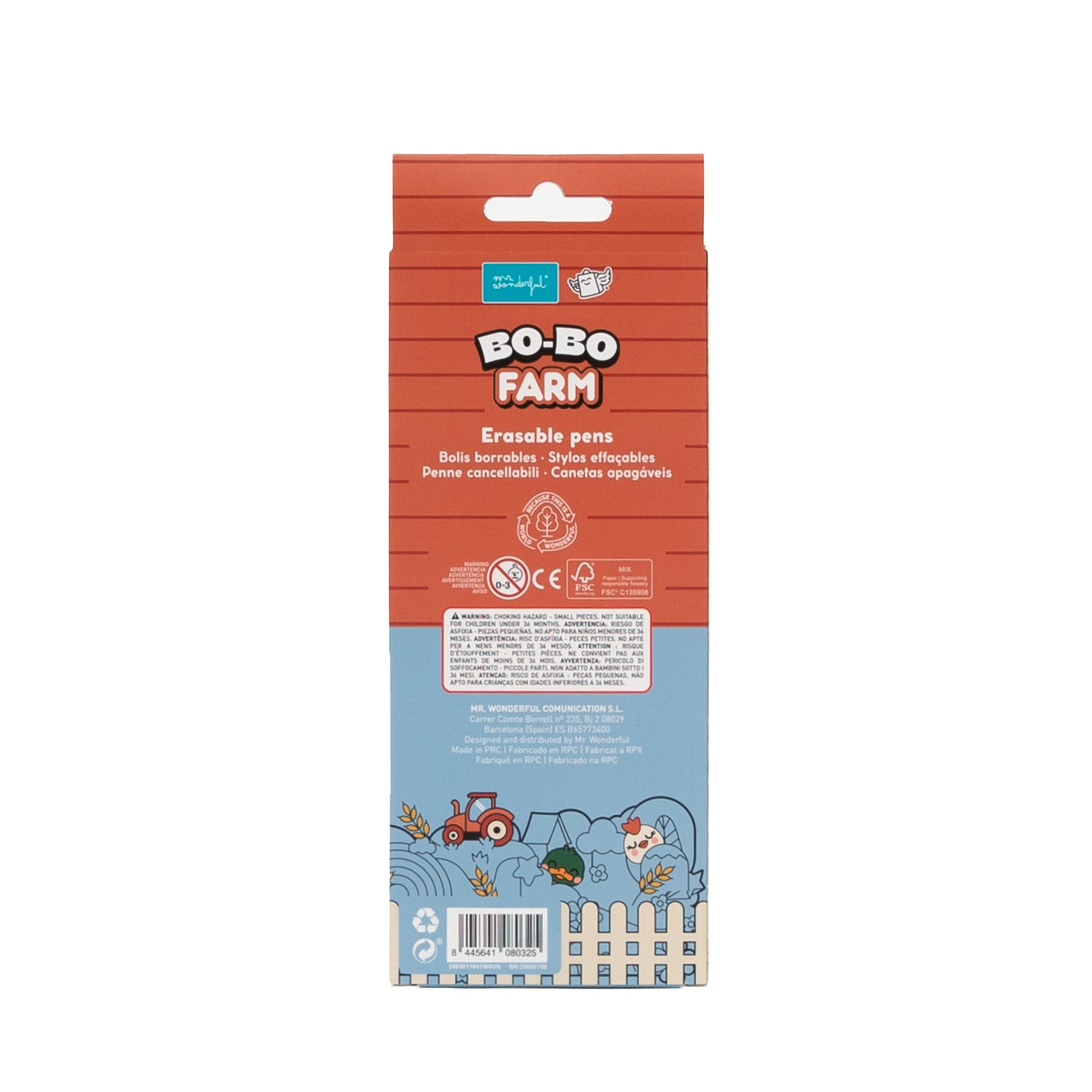 Set di 3 penne cancellabili Bo-Bo con 3 amici della collezione Fattoria a un’estremità. Colore dell’inchiostro: blu. Messaggi delle penne: