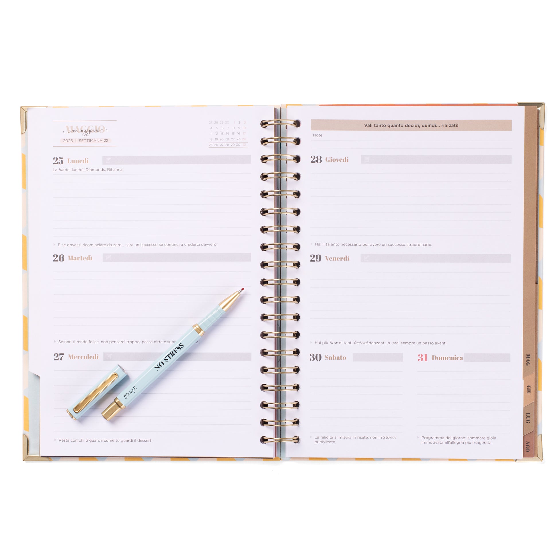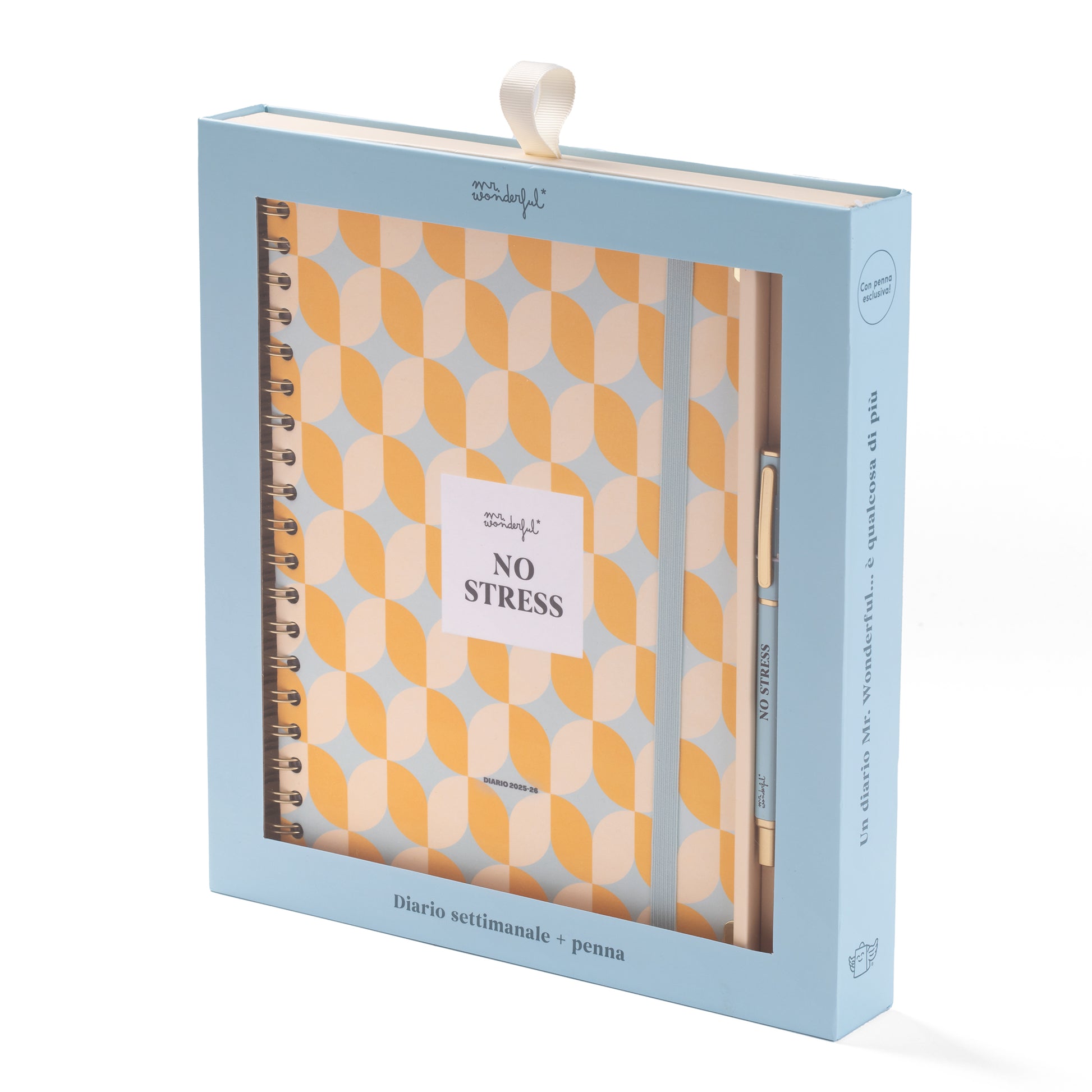 Set presentato in una bellissima confezione premium e composto da una penna di alta qualità, realizzata in metallo e con lo stesso messaggio del diario Office di Mr. Wonderful che la accompagna. Questo stile di design, già proposto in alcune edizioni precedenti, è un po’ più sobrio e contenuto rispetto al nostro stile classico, e piacerà a un pubblico leggermente più adulto. Con organizzazione settimanale, il diario va dalla fine di settembre 2025 alla fine di agosto 2026, ha un formato più grande rispetto agli altri modelli, il che lo rende perfetto per l’uso in ufficio, e contiene: