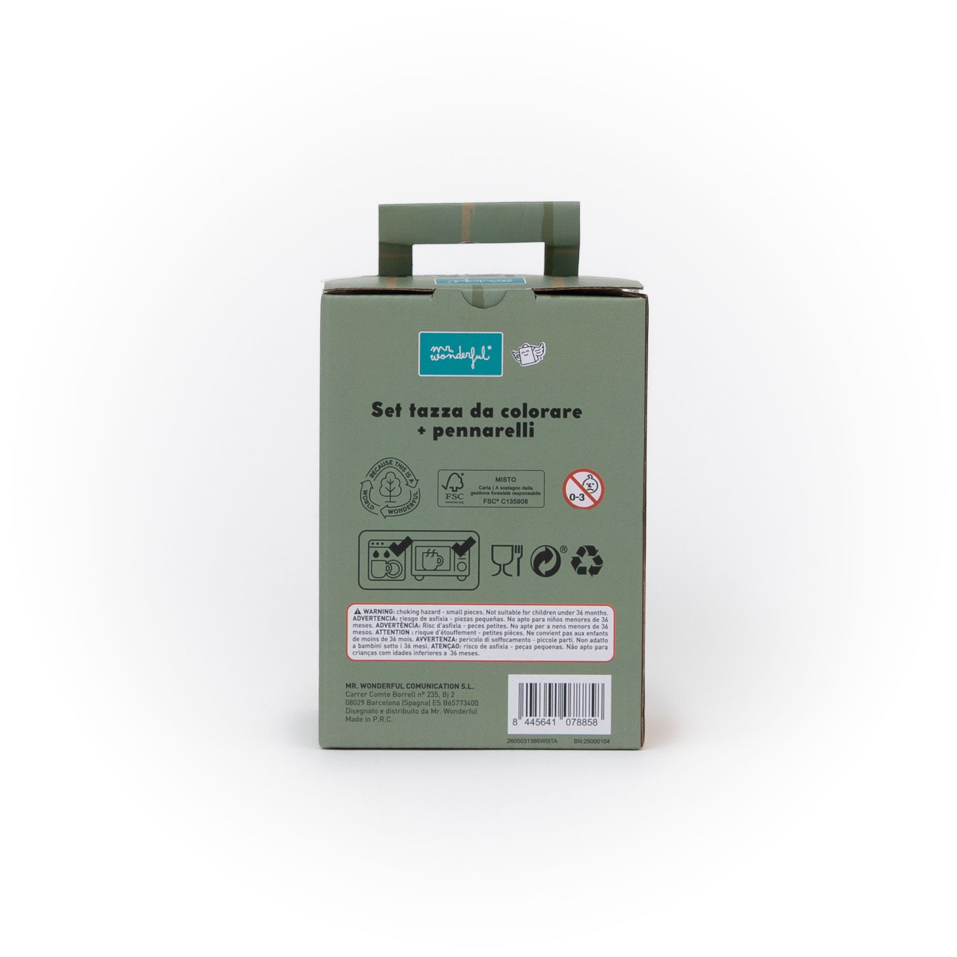 Set creativo di Mr. Wonderful che include una tazza bianca da colorare e 7 pennarelli colorati: arancione, giallo, rosso, lilla, blu, nero e verde. Ideale per personalizzare la tazza e creare un regalo unico e speciale.
