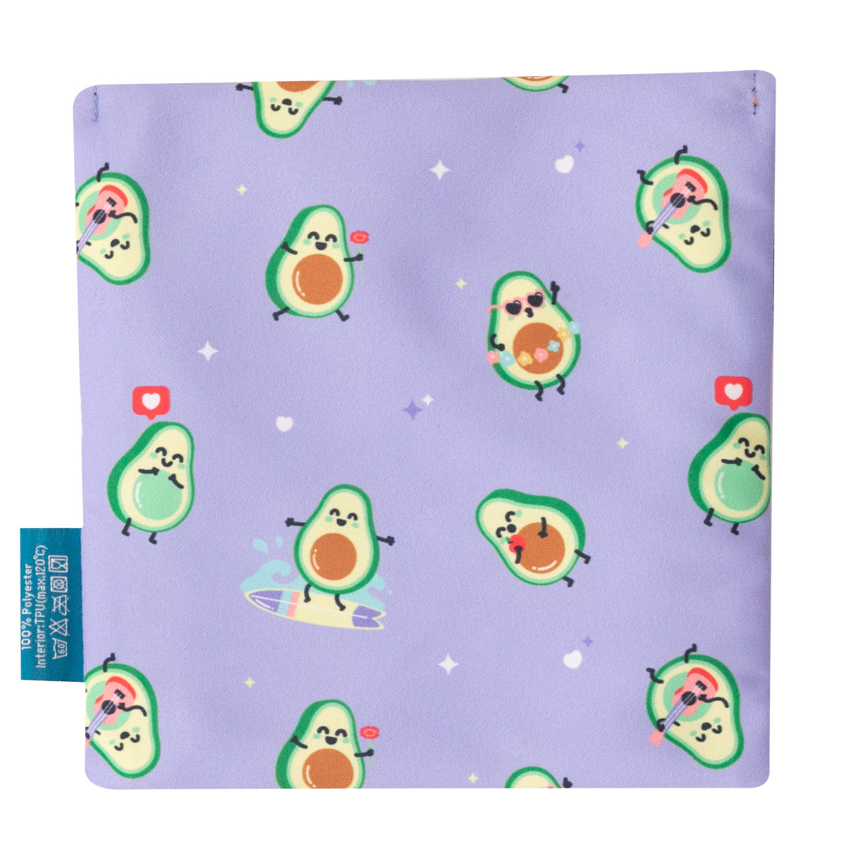 Porta snack reutilizable de Roll’eat, con diseño de aguacates Mr. Wonderful. Es lavable, reutilizable, plegable y ajustable, gracias a su práctico cierre de velcro.