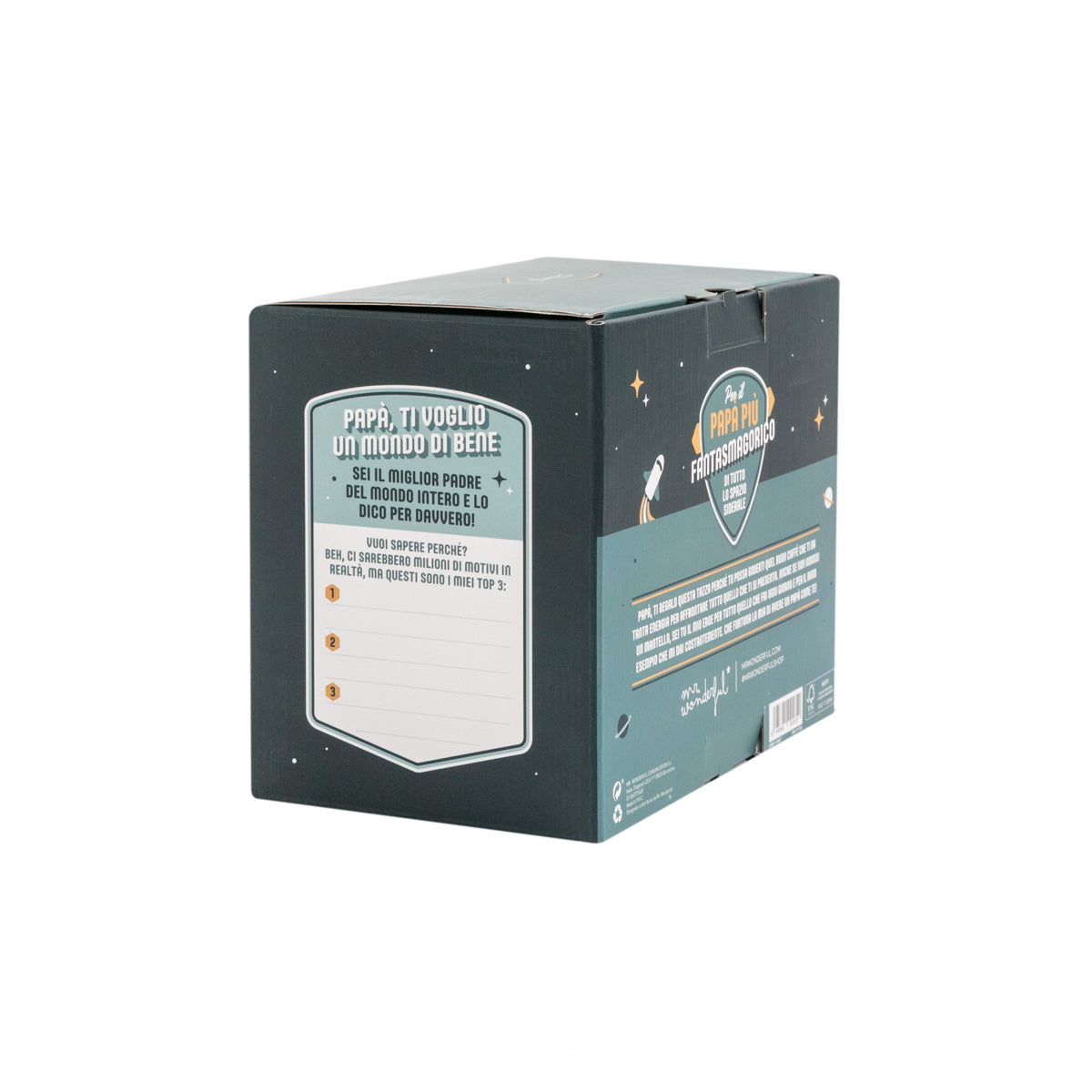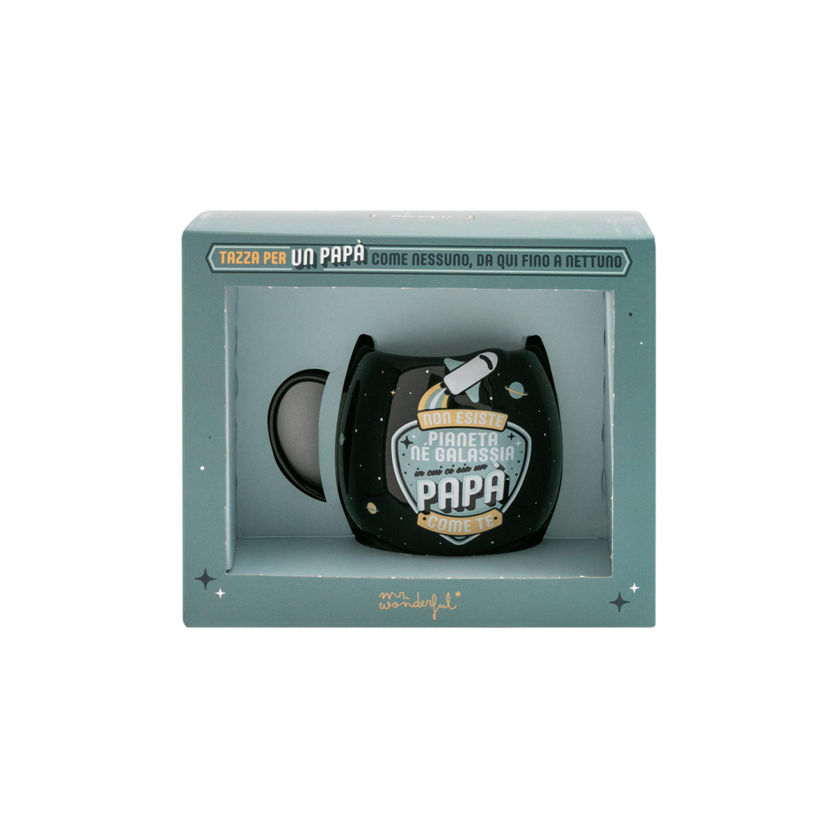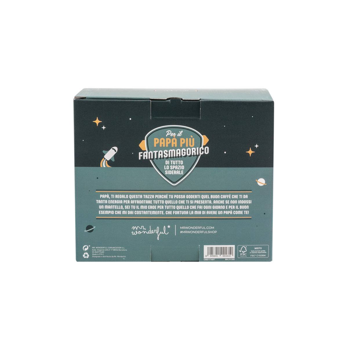 Non importa quanti giri farai intorno al Sistema Solare, non importa se lo farai a bordo di un velocissimo razzo o pilotando una navicella spaziale con un itinerario ricco di fermate. Sai che, ovunque tu vada, non troverai mai un papà migliore, più amorevole e meraviglioso del tuo. Sì, naturalmente! Ecco perché abbiamo voluto dedicargli una tazza per i papá che sia cool quasi quanto lui. Si tratta di una tazza Mr. Wonderful realizzata in ceramica e che gli permetterà di godersi il suo caffè, infuso o cioccolato e approfittare ancora di più quel poco tempo che ha per sè stesso. Una tazza con un messaggio che ha un aspetto molto divertente ed emotivo che dice: "Non esiste pianeta né galassia in cui ci sia un papà come te". Dai, una frase con cui siamo più che sicuri che conquisterai il cuore del tuo papà, riempiendolo di emozione e di amore vero. Inoltre, questa tazza ha una capacità di 330 ml ed è adatta sia per il riscaldamento nel microonde che per la pulizia in lavastoviglie. E, per finire, occhio al packaging, perché questa tazza molto capiente arriva in una scatola sul retro della quale c'è spazio per completare una scritta personalizzabile dedicata al tuo papà. Quindi sì, ricevi un regalo unico e fantastico!