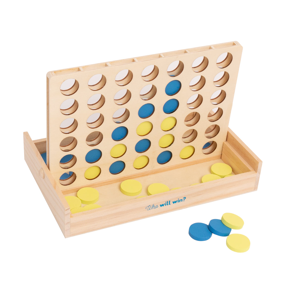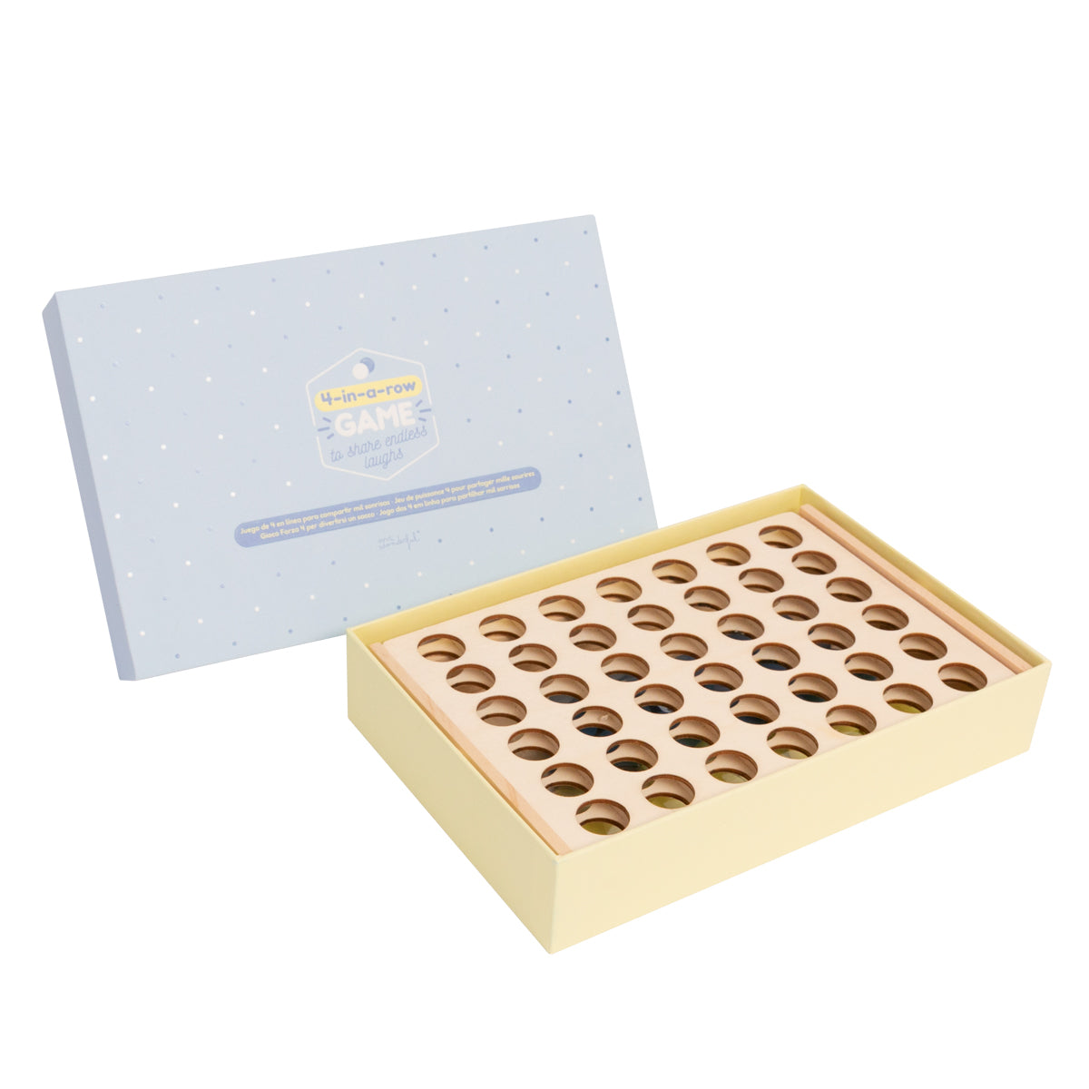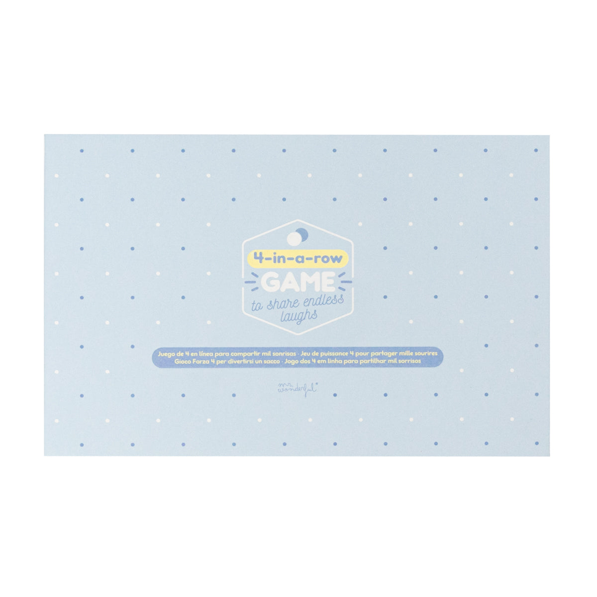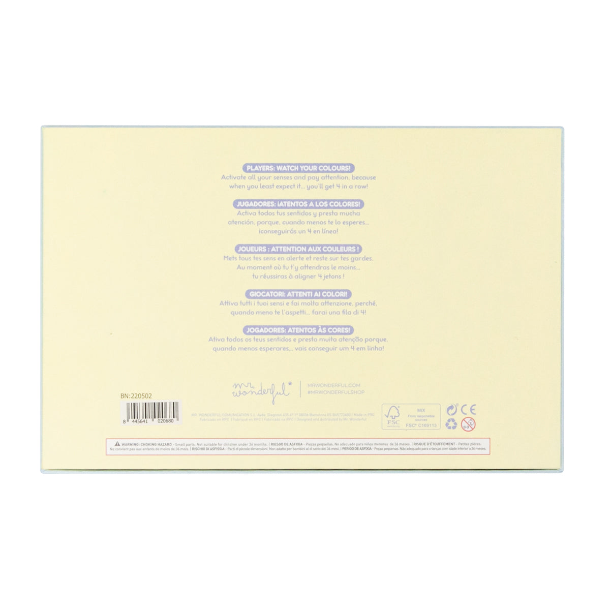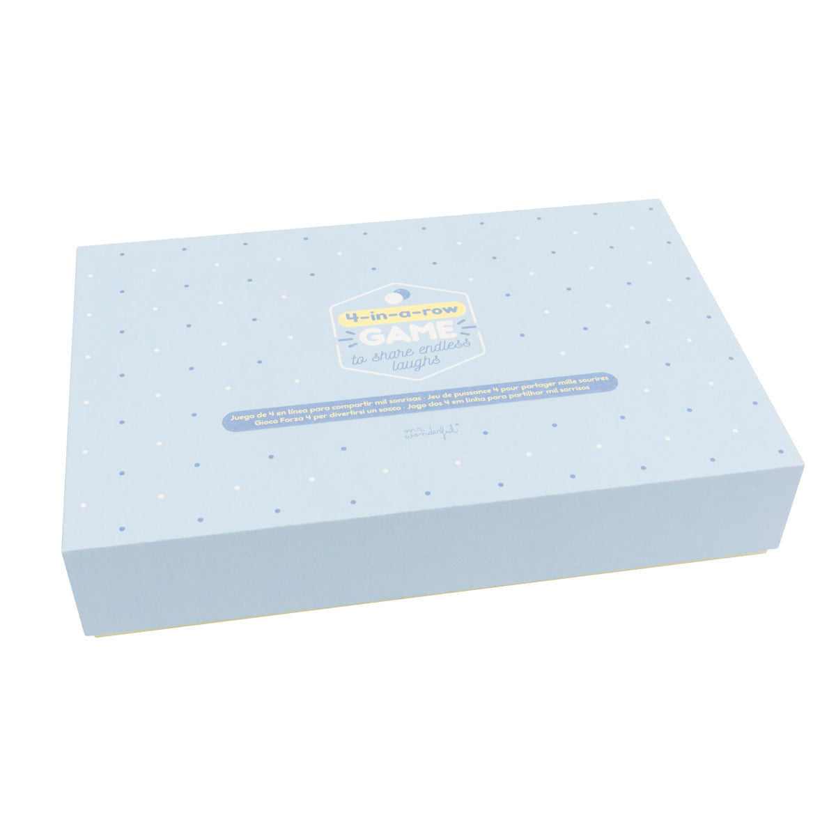 Tradicional juego de 4 en raya, con diseño adaptado al estilo Mr. Wonderful. Su packaging de cartón resulta muy premium, por lo que es perfecto para regalar. El tablero está realizado en madera y en su interior se pueden guardar las fichas, que también están realizadas en madera (21 fichas para cada jugador, de dos colores distintos).