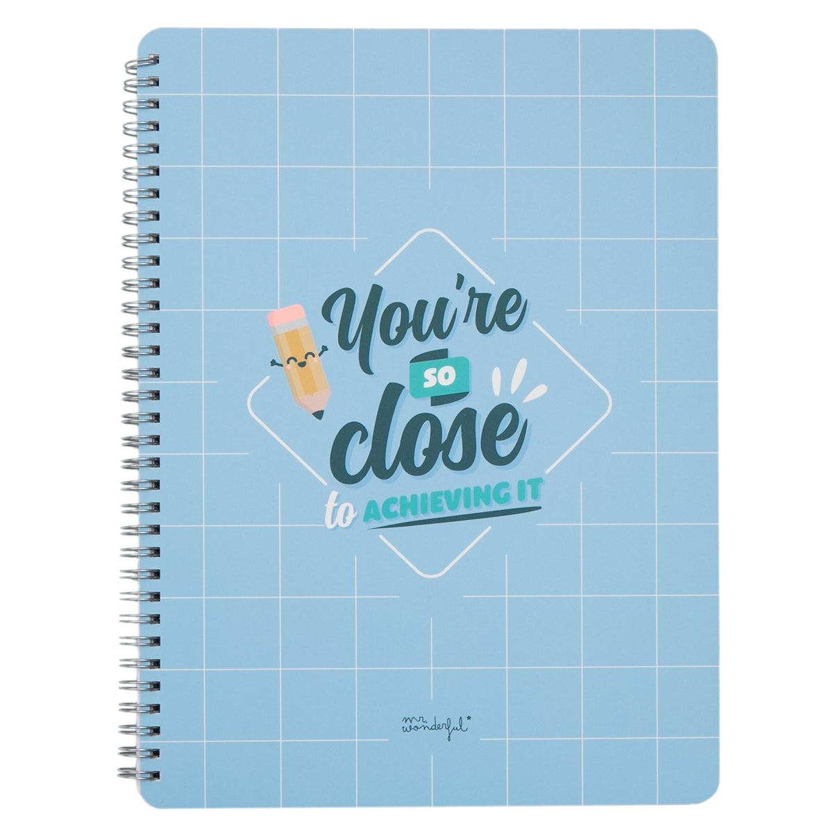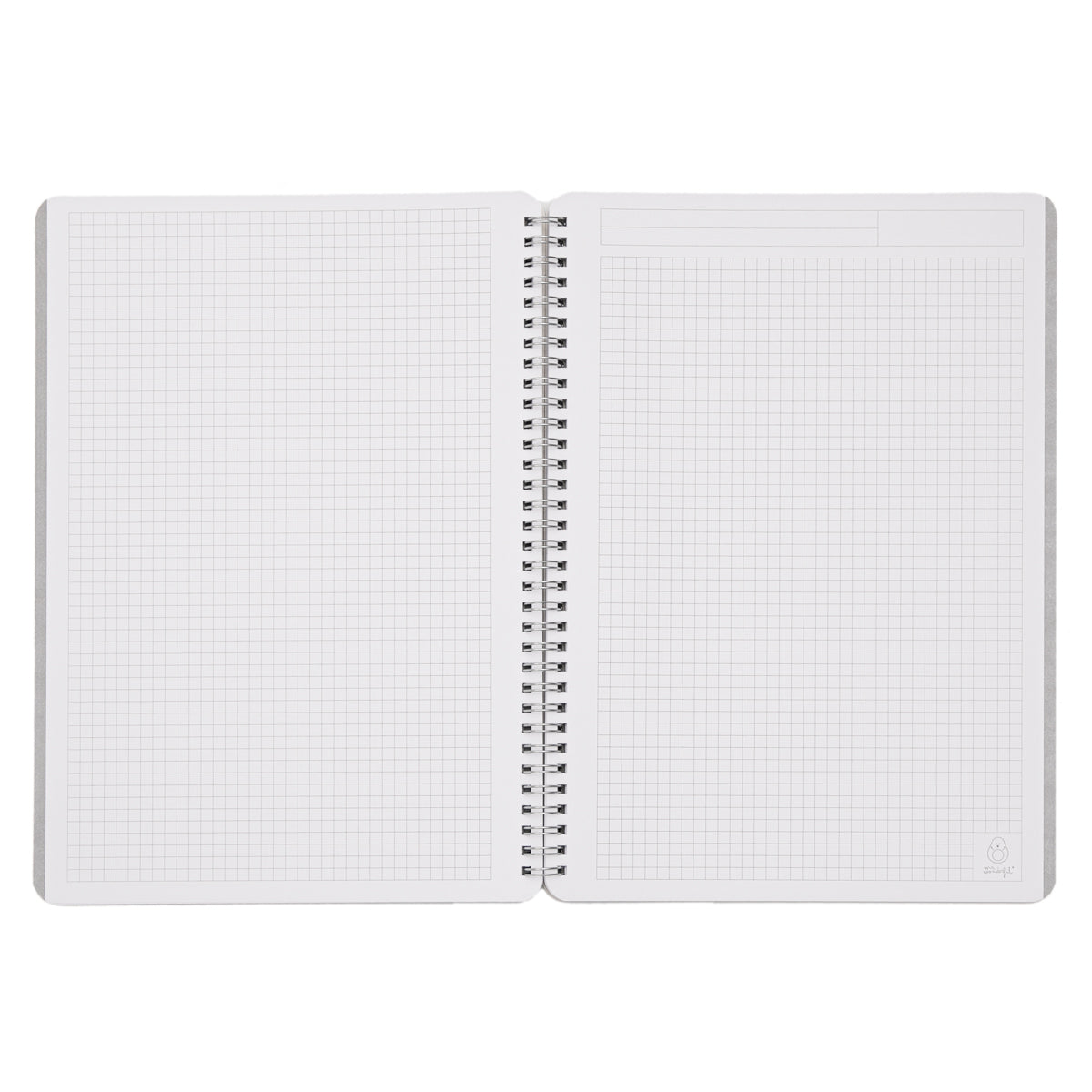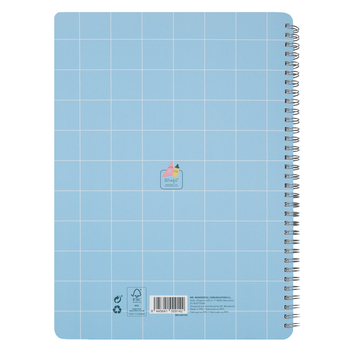 A4 size notebook, with spiral binding, hard cover and 80 squared sheets of 80g paper inside. In addition, it contains a sheet with fun stickers.
