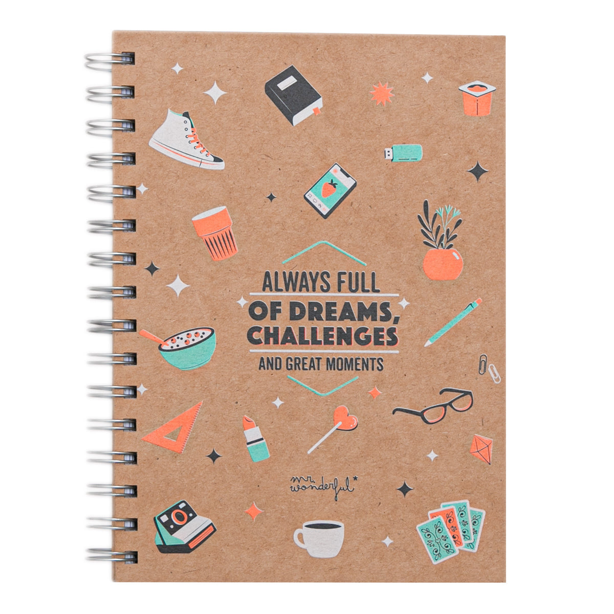 A5 size premium notebook, with spiral binding, hard cover and 100 sheets of 80g graph paper inside. In addition, it contains a sheet with fun stickers.