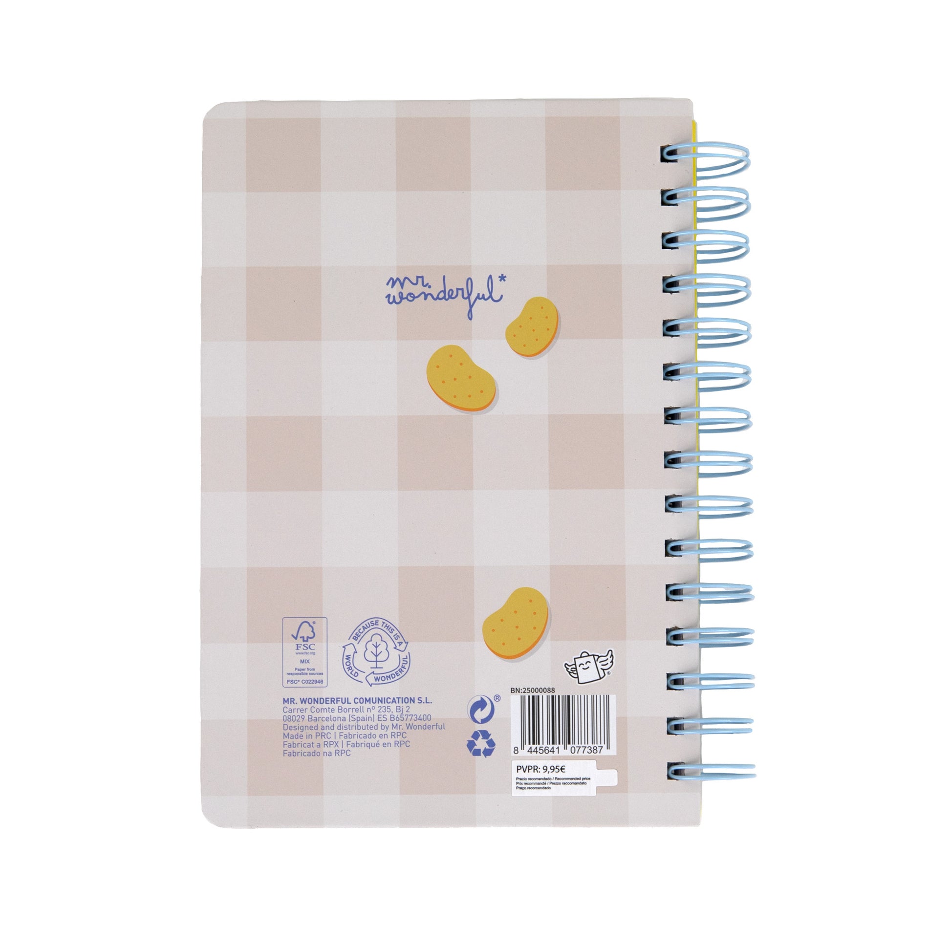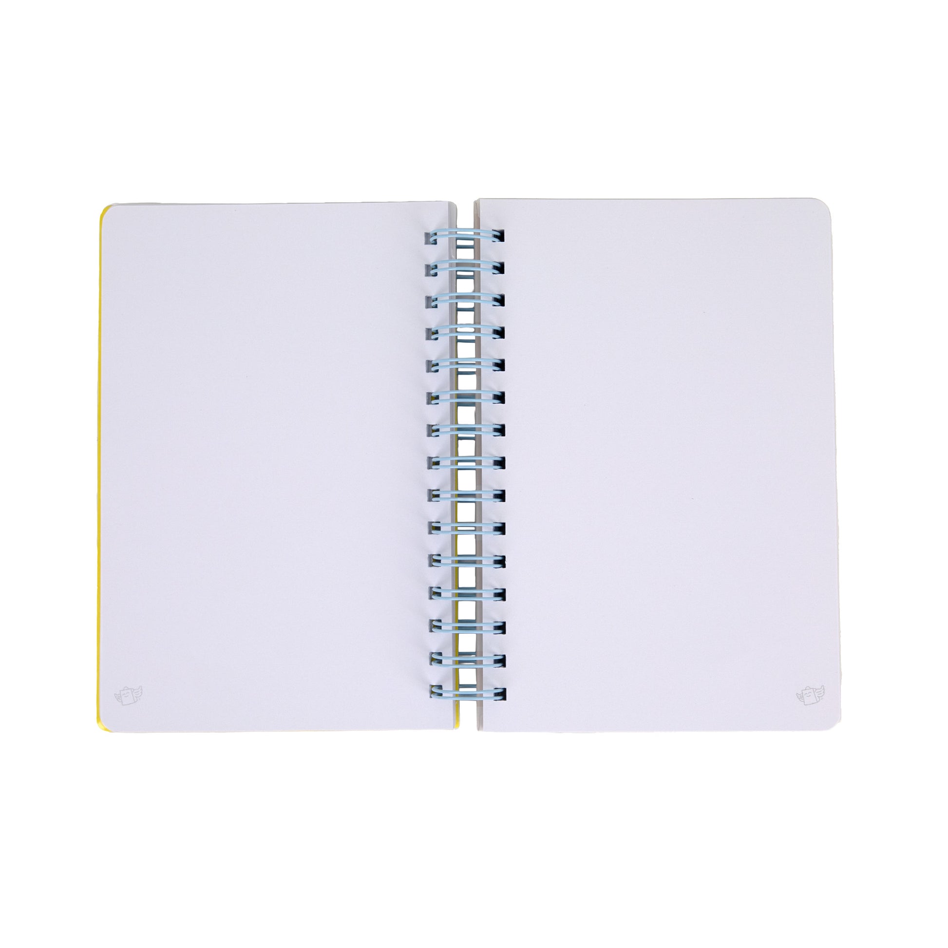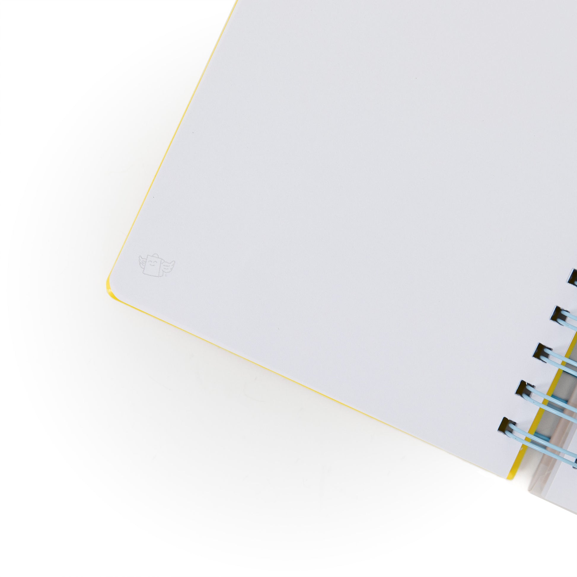 Libreta de tamaño A5 con encuadernación en espiral y 240 páginas blancas en su interior. En su portada incorpora una pieza del diseño con volumen, realizada con memory foam (antiestrés). Incluye una hoja de pegatinas.