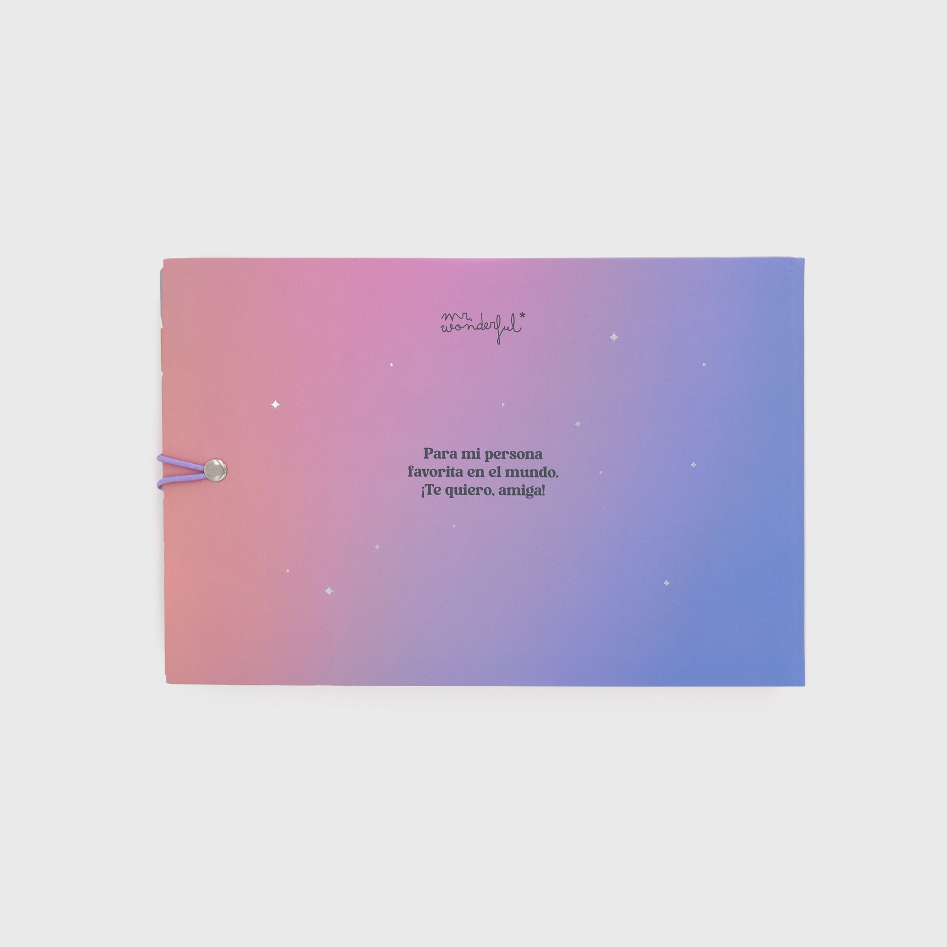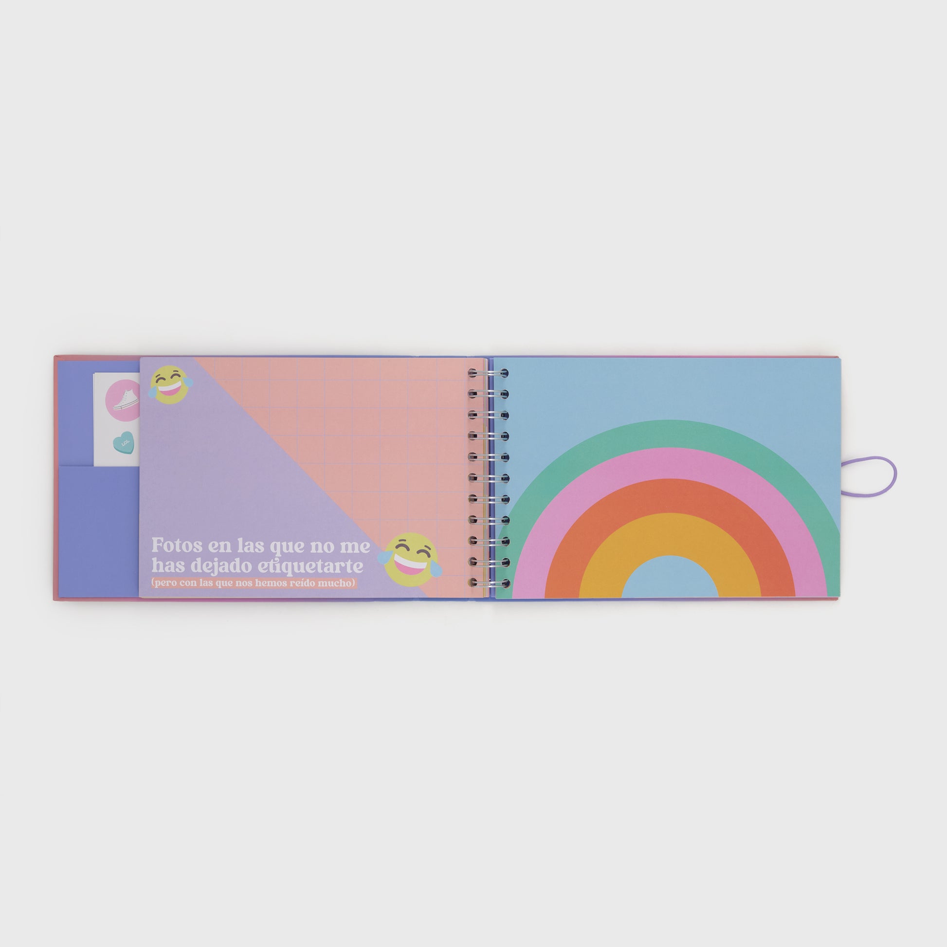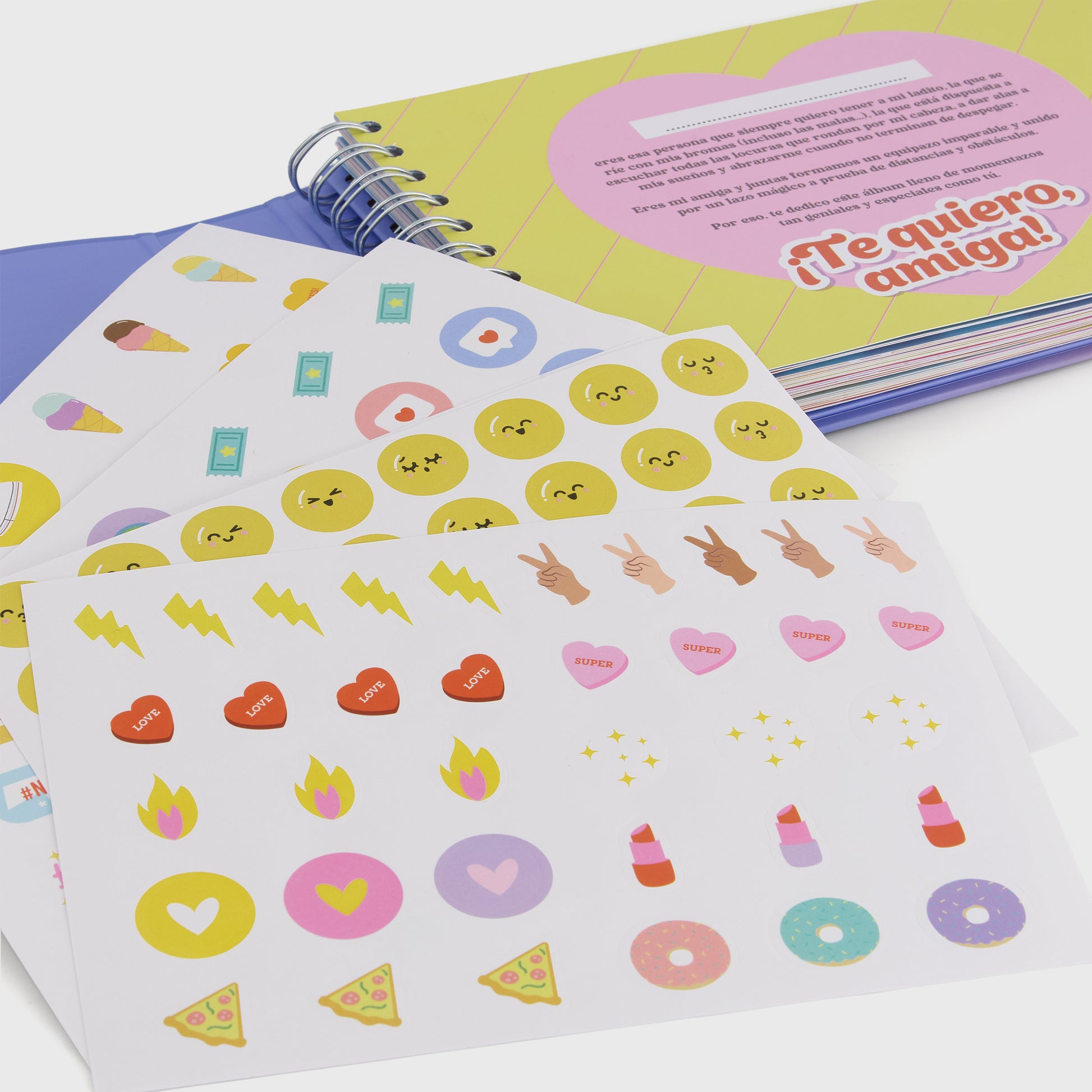 Álbum de fotos con temática de amistad, pensado para rellenarlo y ofrecerlo como regalo a una amiga. Con 64 páginas (algunas de ellas con mensajes para acompañar a las fotografías o con textitos para rellenar), 8 hojas de pegatinas para decorar y personalizar el álbum y un bolsillo interior para guardar recuerdos y papeles sueltos. Además, en la primera página encontramos un espacio para poner el nombre de la persona que recibirá el regalo, acompañado de un bonito texto dedicatoria.