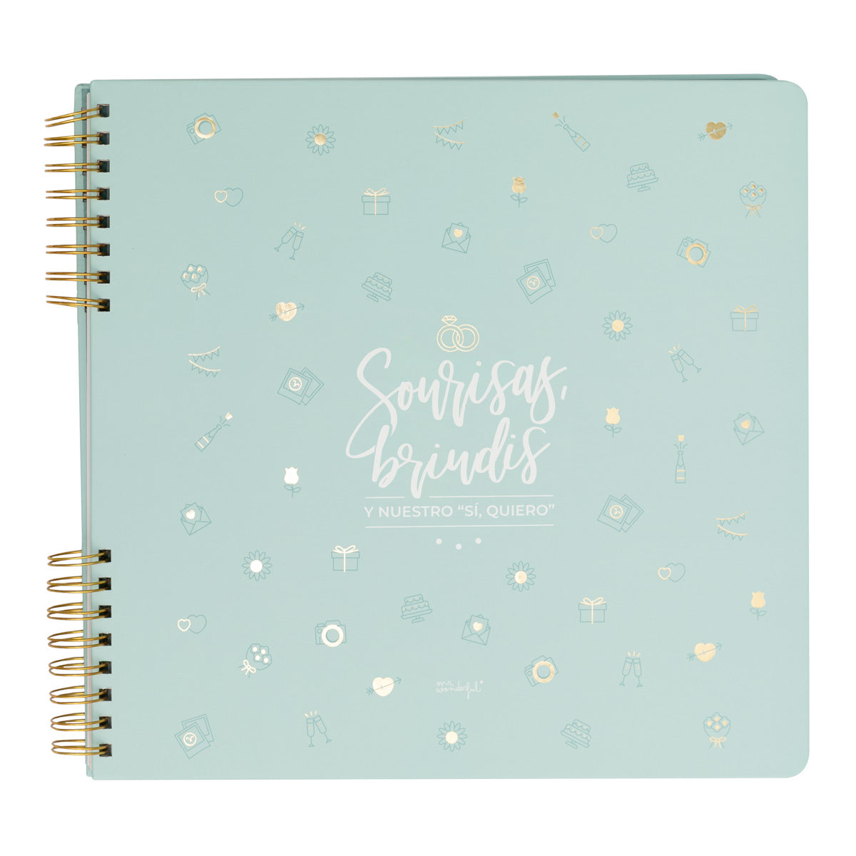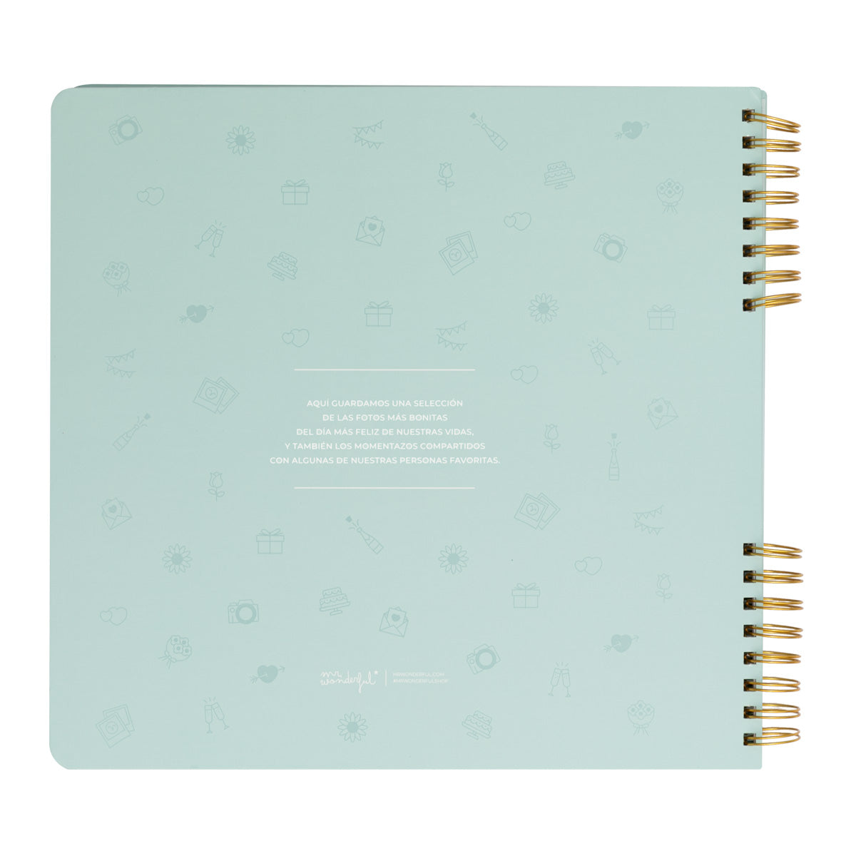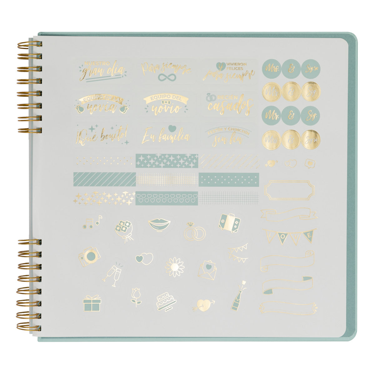 Álbum para las fotos de la boda, con encuadernación en espiral partida. Cuenta con 64 páginas en papel de 250 gr y su portada incorpora detalles en stamping dorado. Incluye una hoja de pegatinas.