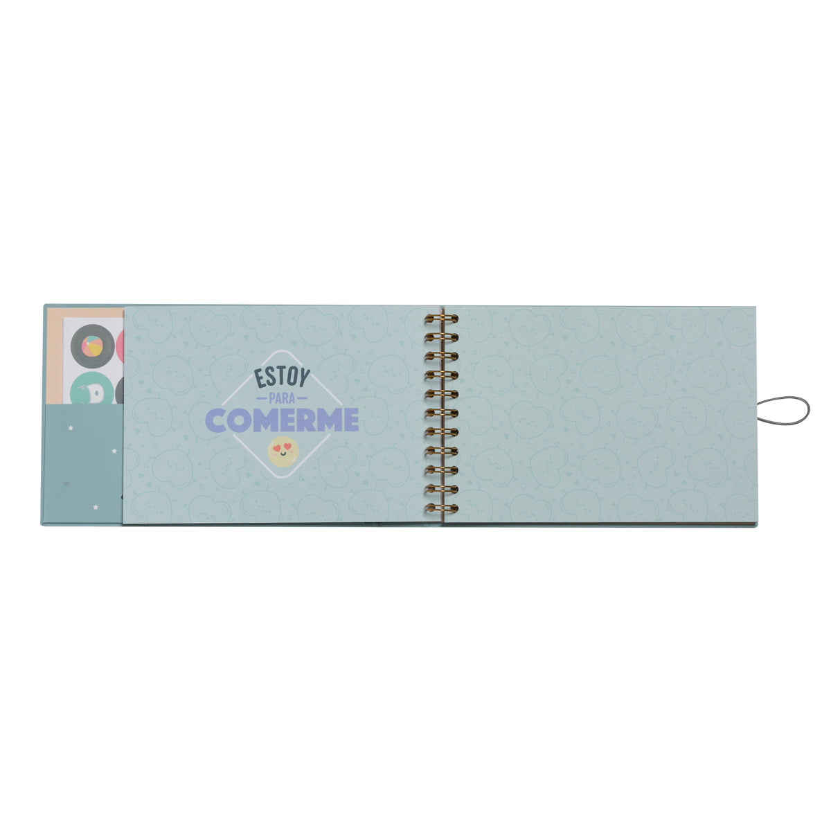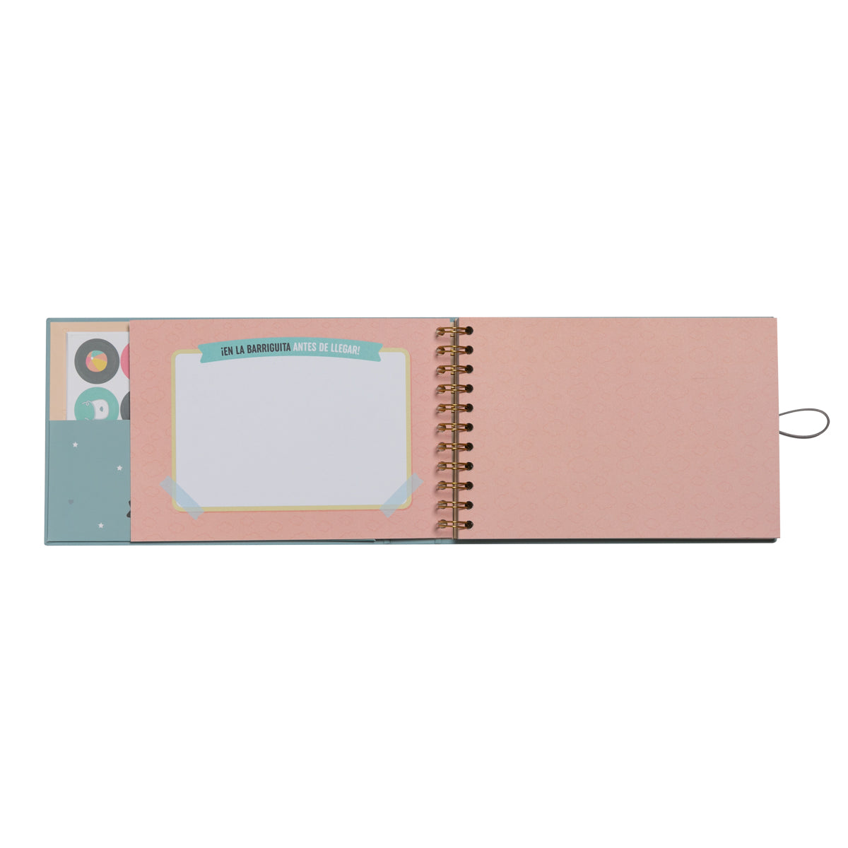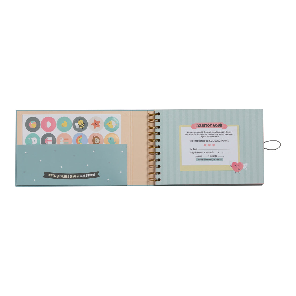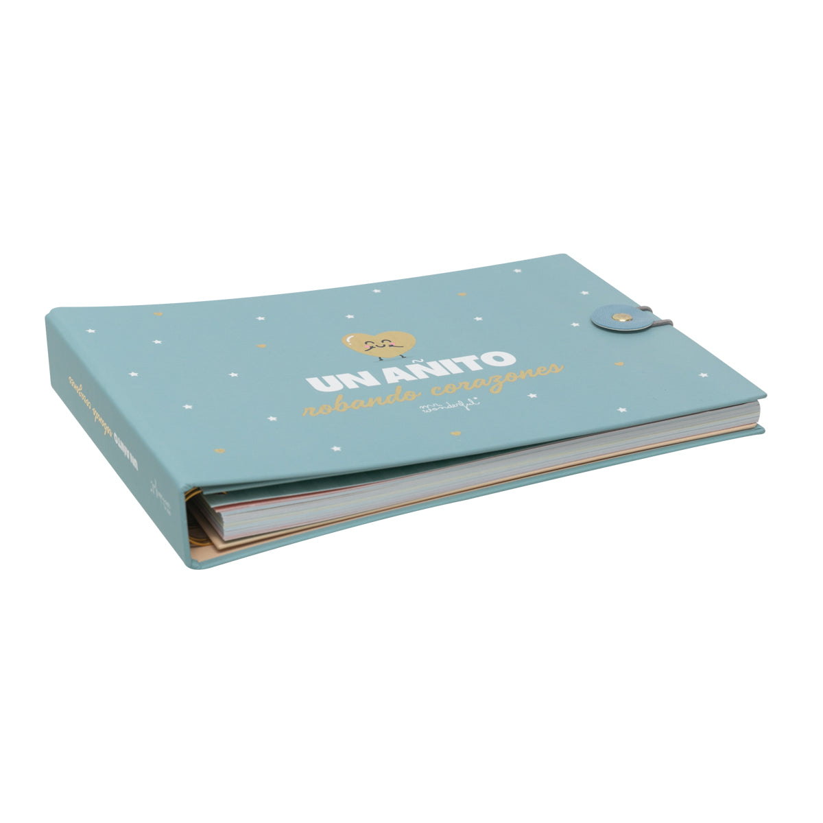 Álbum de fotos para guardar los mejores momentos del primer año de vida del bebé. Cuenta con 64 páginas a lo largo de las cuales encontraremos contenido pautado para ir completando los momentos más importantes de este primer año con las fotos del peque que los ilustran. Además, incluye 8 hojas de pegatinas temáticas y un sobre para guardar papeles o elementos sueltos, como ecografías. Cuenta con la certificación FSC, que garantiza que ha sido fabricado con papel obtenido de bosques gestionados de forma responsable.