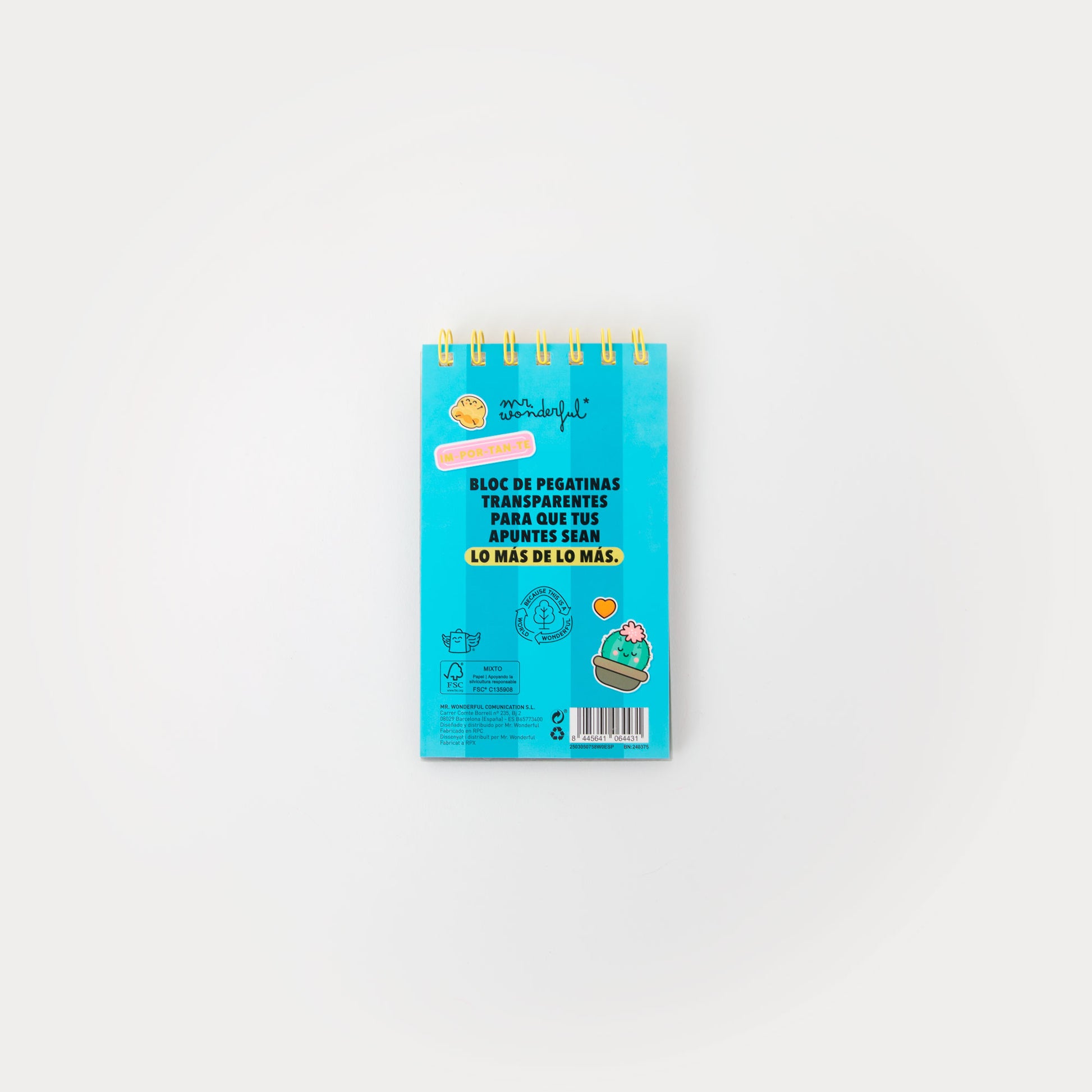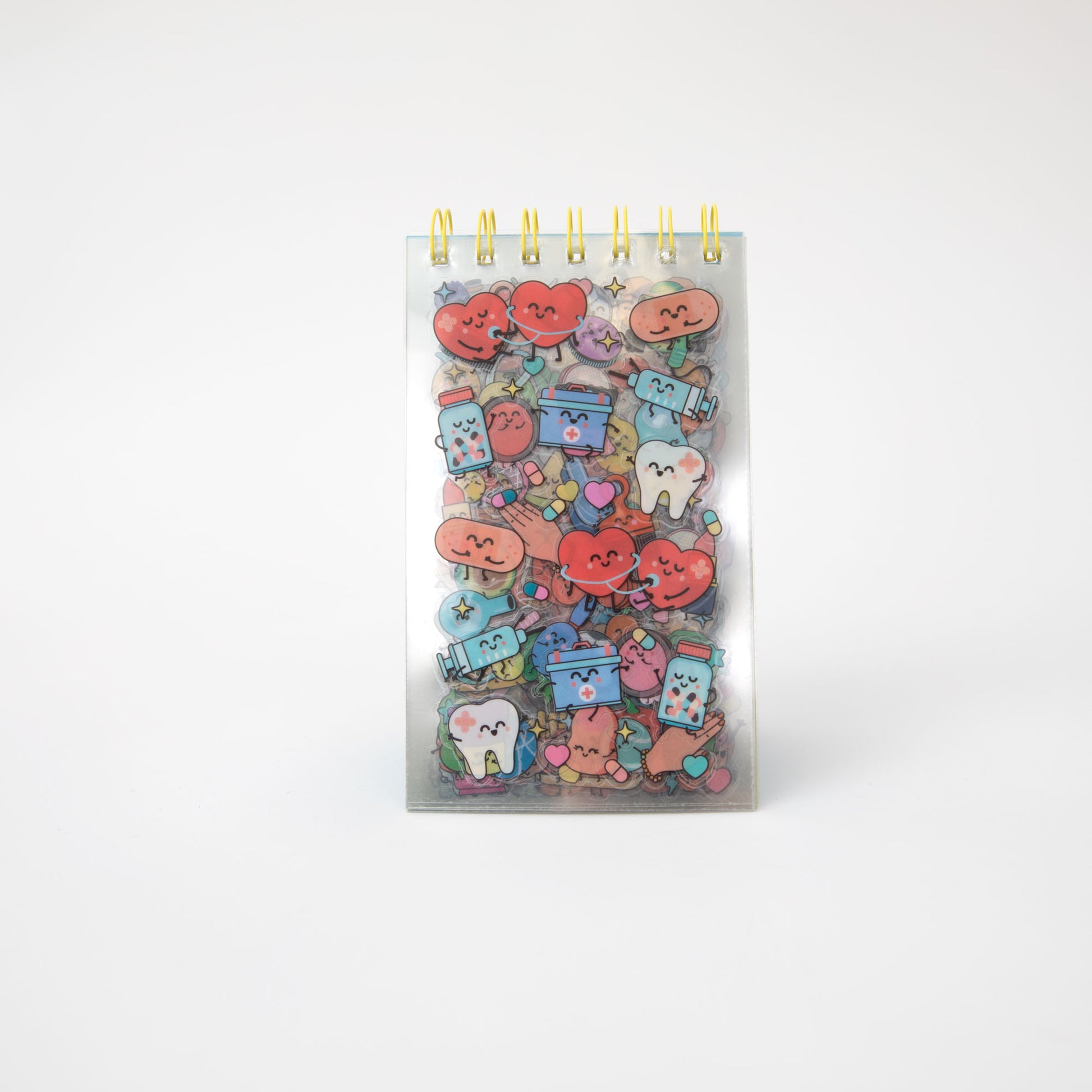 Pequeño cuaderno con encuadernación en espiral, contiene 910 pegatinas en su interior, todas ellas con formato transparente.