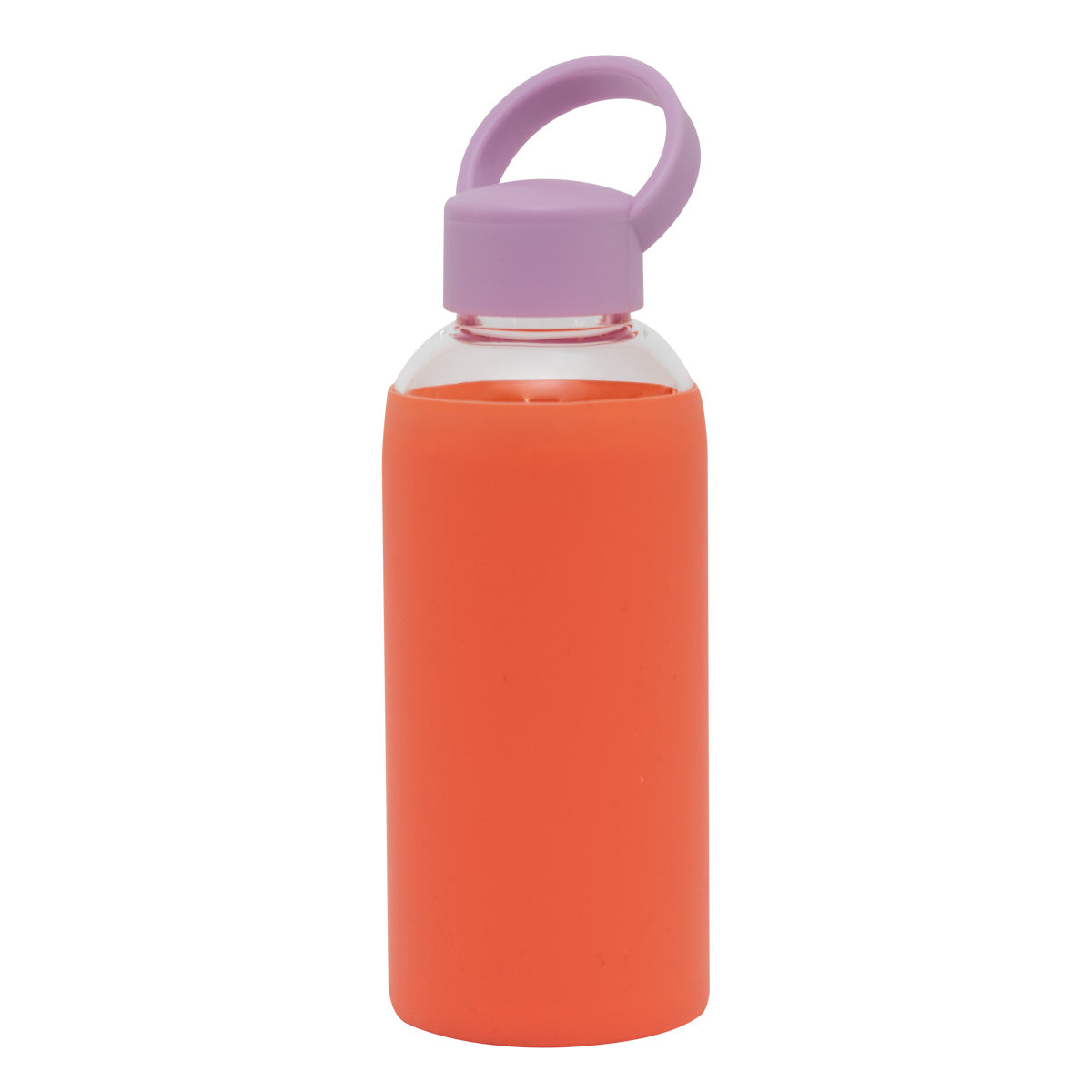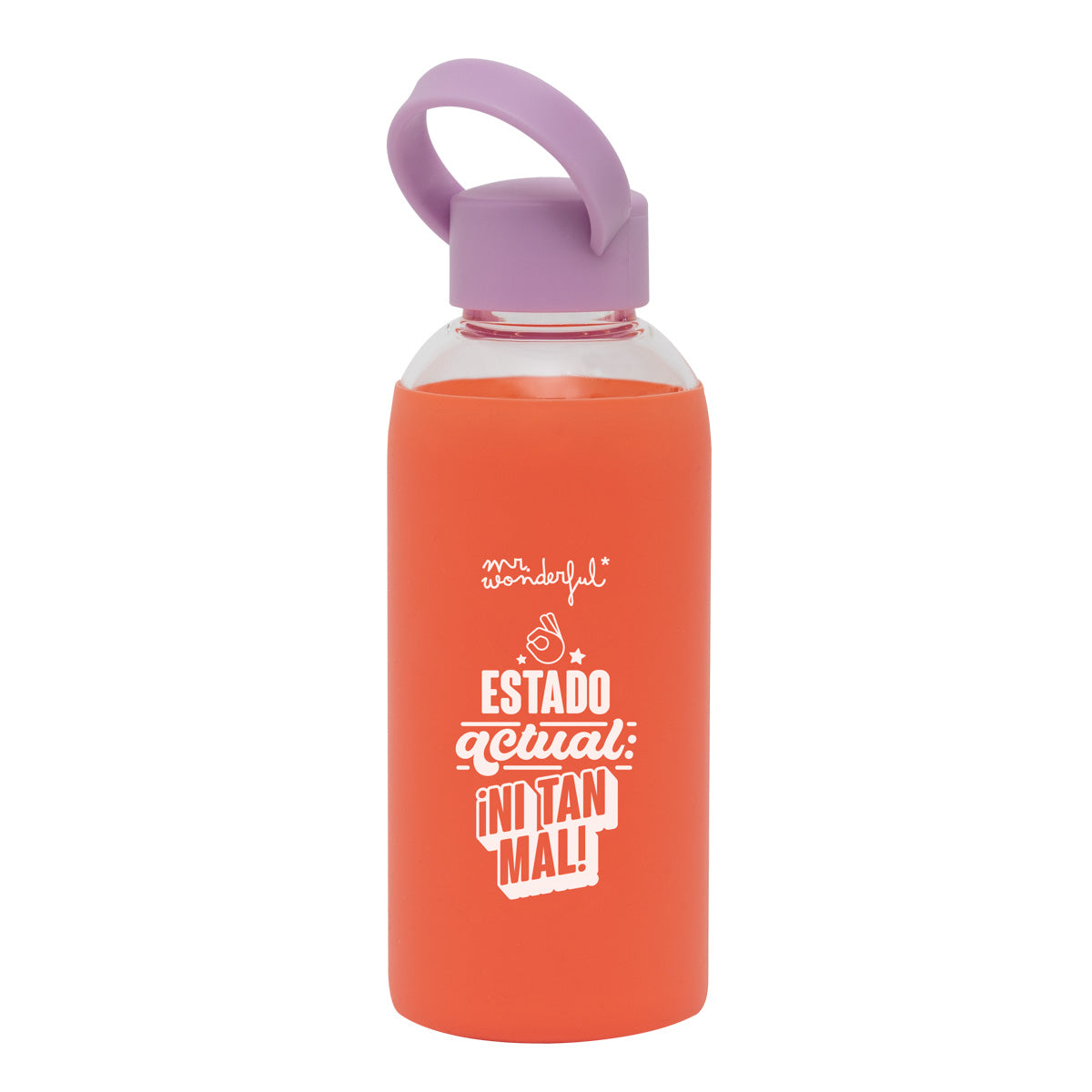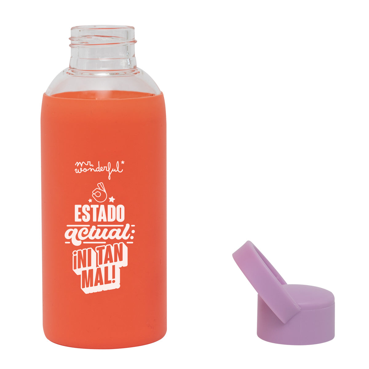 Botella de?cristal con?tapón de?plástico libre de?BPA y?faja de?silicona alrededor, con mensaje divertido. La faja de?silicona evita que?la?botella resbale y?facilita su?agarre. Capacidad: 470 ml.