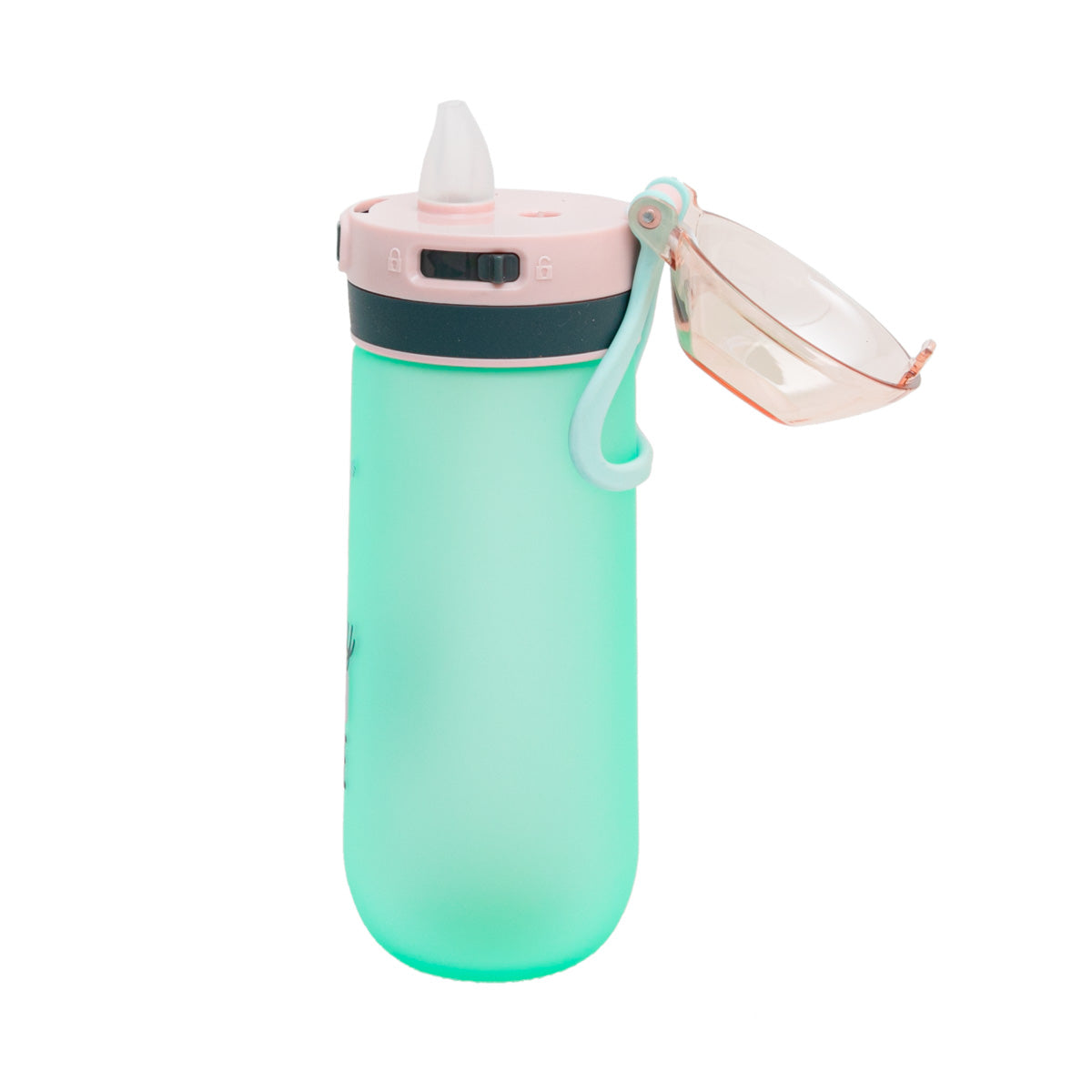 Botella con asa de silicona y capacidad de 650 ml, realizada en plástico libre de BPA y de ftalatos. Cuenta con un cierre de seguridad y con un botón que evita que la botella se abra en la mochila y facilita su uso a los más pequeños.