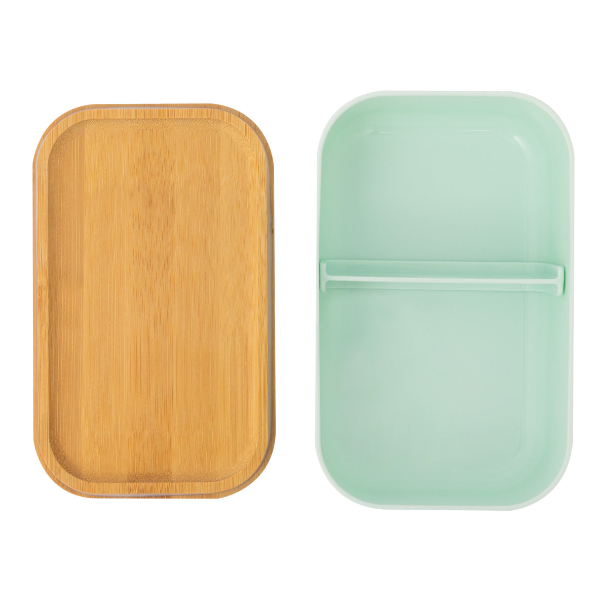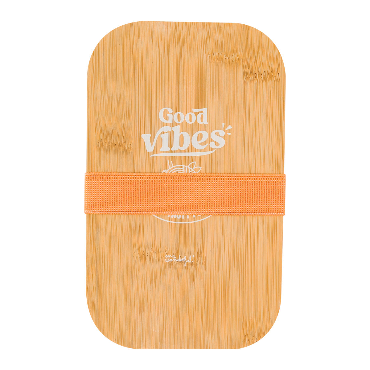Táper de plástico con tapa de bambú y un divertido mensaje en inglés. Cierra con una goma elástica en un bonito color verde lo que, además de práctico, resulta muy estético.