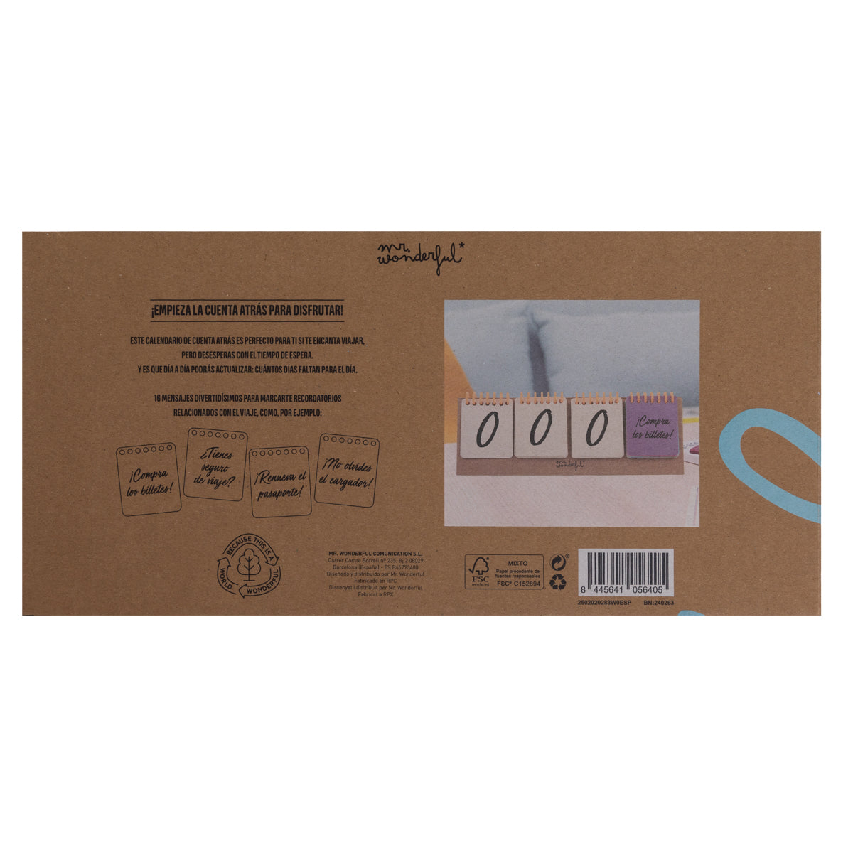 Calendario para llevar la cuenta atrás para ese viaje tan esperado. Tiene el formato del clásico calendario perpetuo, con base con encuadernación en espiral y varias filas de tarjetones que se deben ir cambiado día a día, pero está pensado para llevar una cuenta atrás a un año vista.