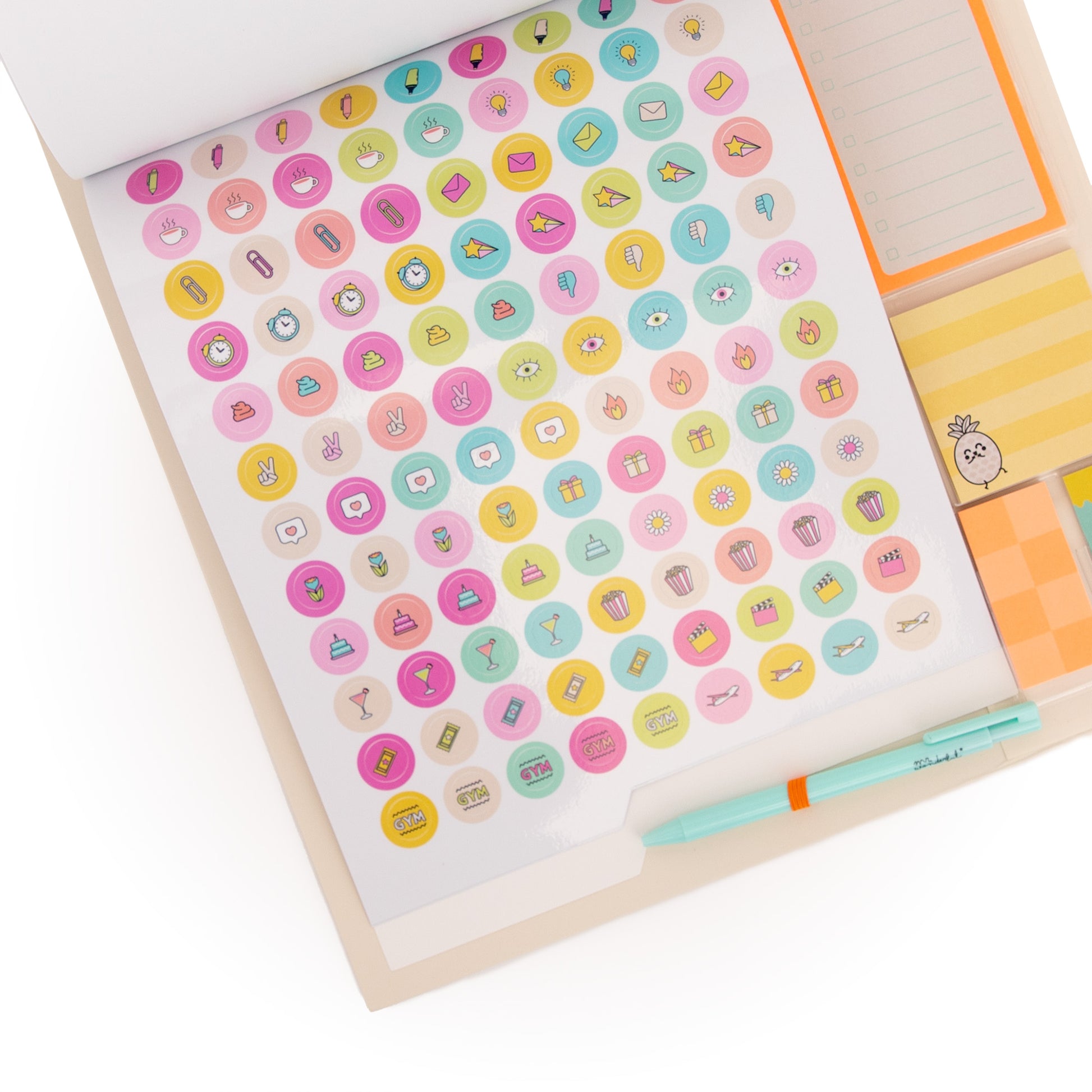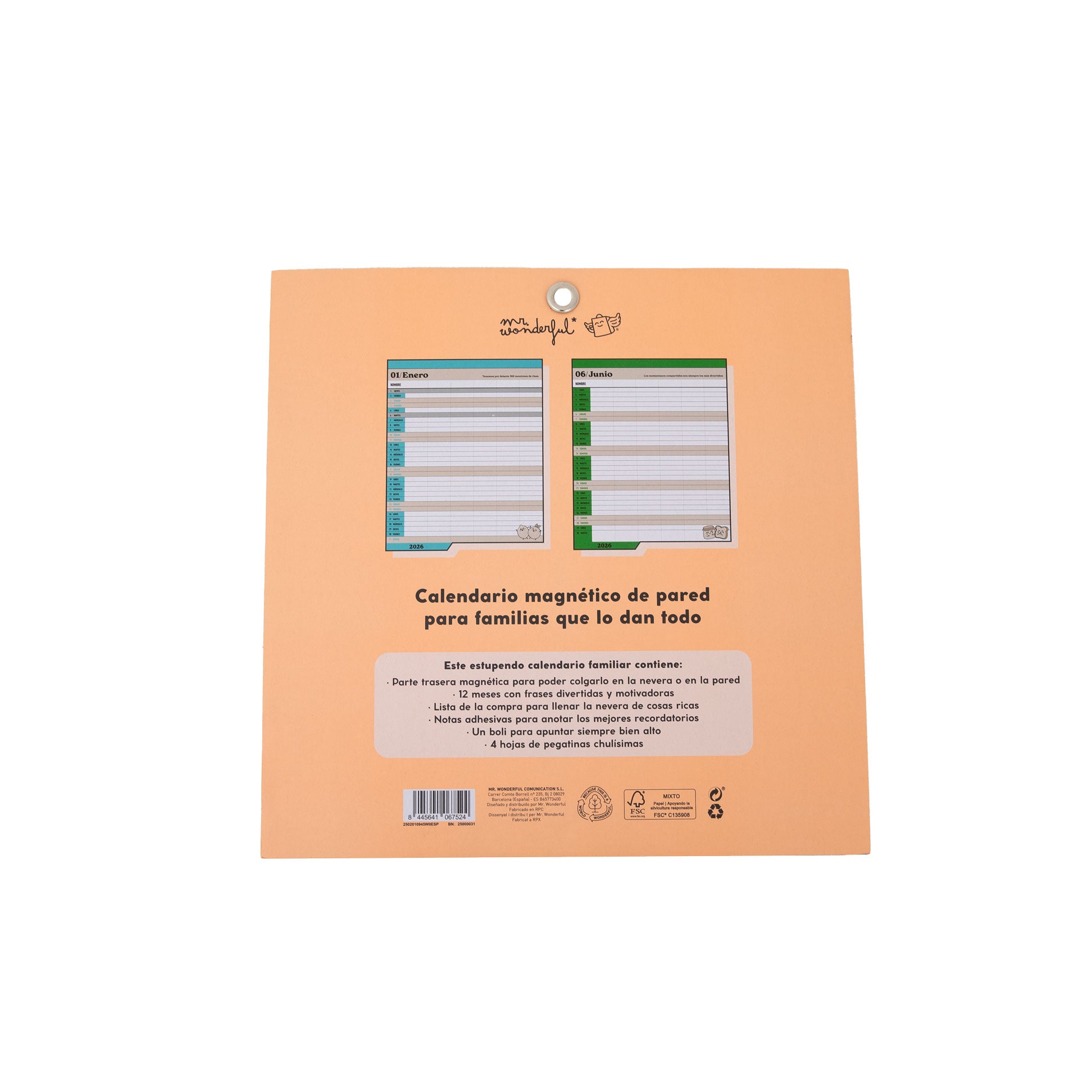Calendario familiar de pared o de nevera, ya que su parte trasera es magnética y permite colgarlo en la puerta del frigorífico, o bien en la pared. Con columnas en cada uno de los meses para anotar arriba el nombre de cada miembro de la familia e ir indicando debajo las tareas o citas de cada uno de ellos, incluye también una frase motivadora para cada mes del año, 4 hojas de pegatinas, 1 bolígrafo, 1 bloc de notas adhesivas y 1 bloc de notas para la lista de la compra.