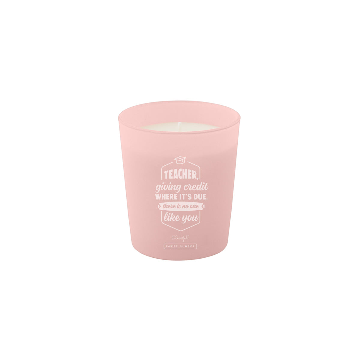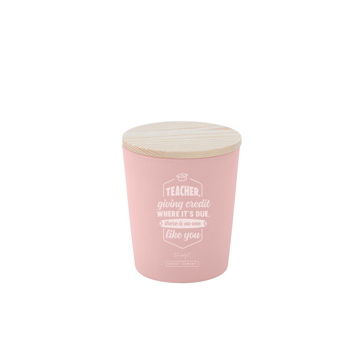 Scented candle with message for teachers. The scent of the candle is Sweet Sunset. It is made with 100% vegetable wax, it comes in a glass container and includes a wooden lid. On the back of the packaging you can find a fillable text, to personalise and further enhance the gift-giving experience.