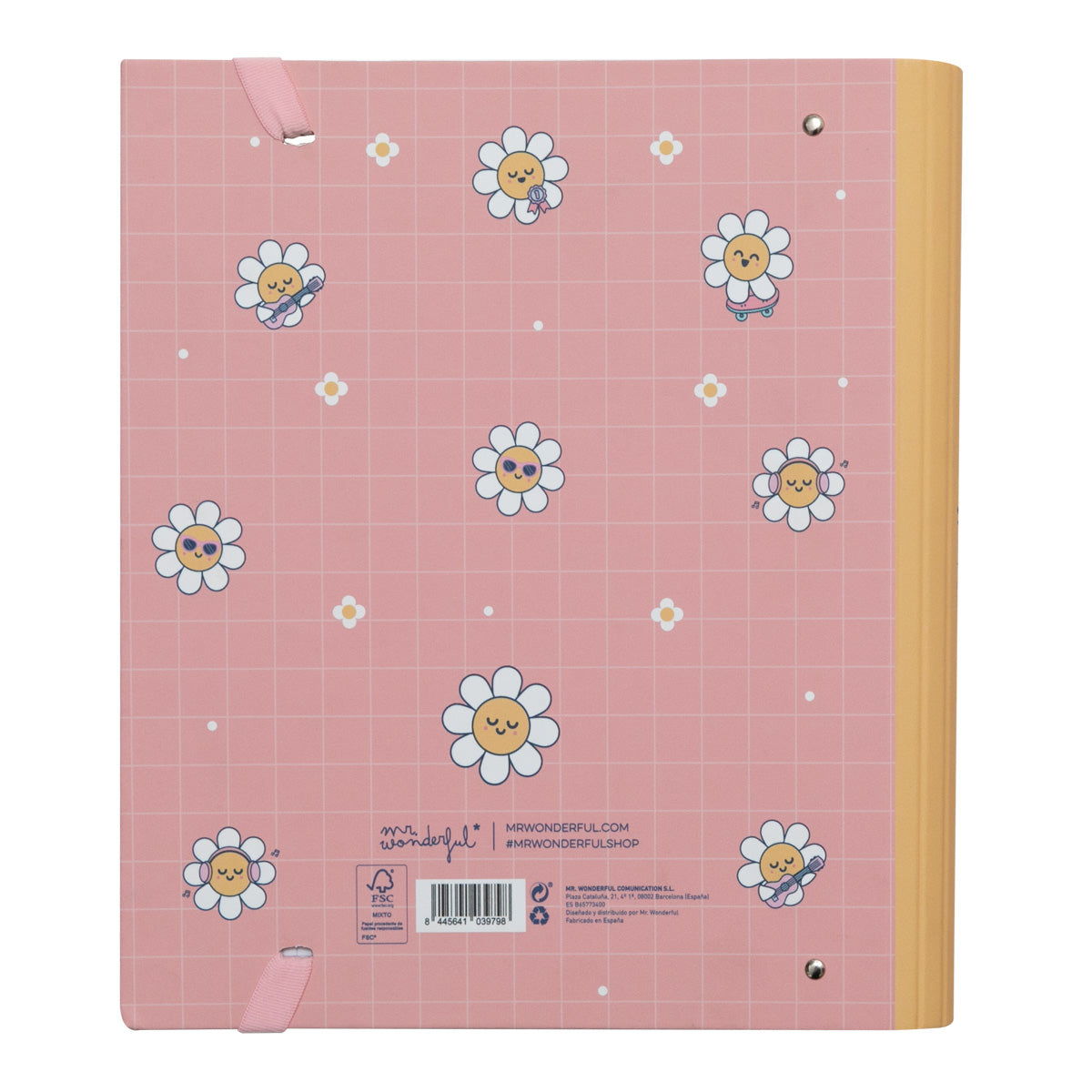 Carpeta con anillas con nuestra margarita Wonder. Incluye 120 hojas cuadriculadas. Cierre con goma elástica. Se entrega retractilada. Cuenta con la certificación FSC, que garantiza que ha sido fabricada con papel obtenido de bosques gestionados de forma responsable.