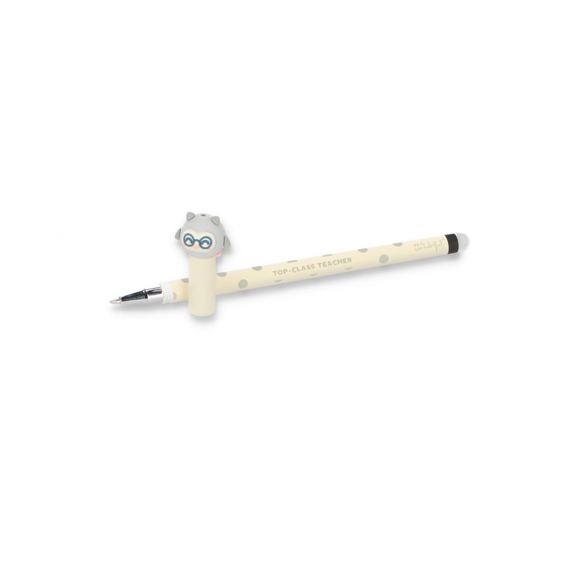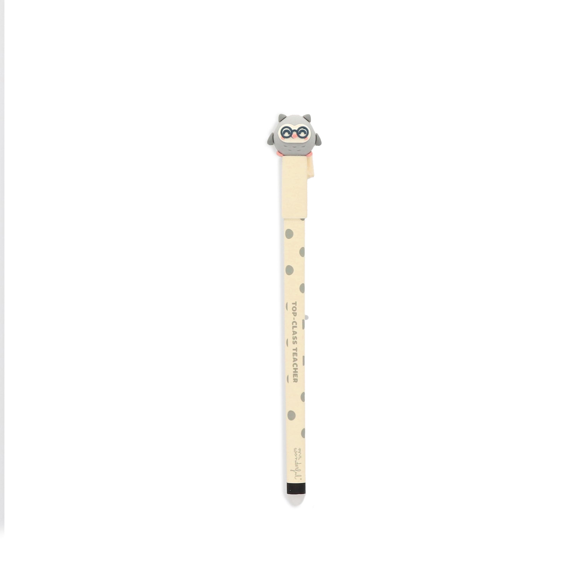 Bolígrafo de tinta borrable con mensaje para profesores o profesoras, con un divertido búho en uno de sus extremos. Tinta negra.