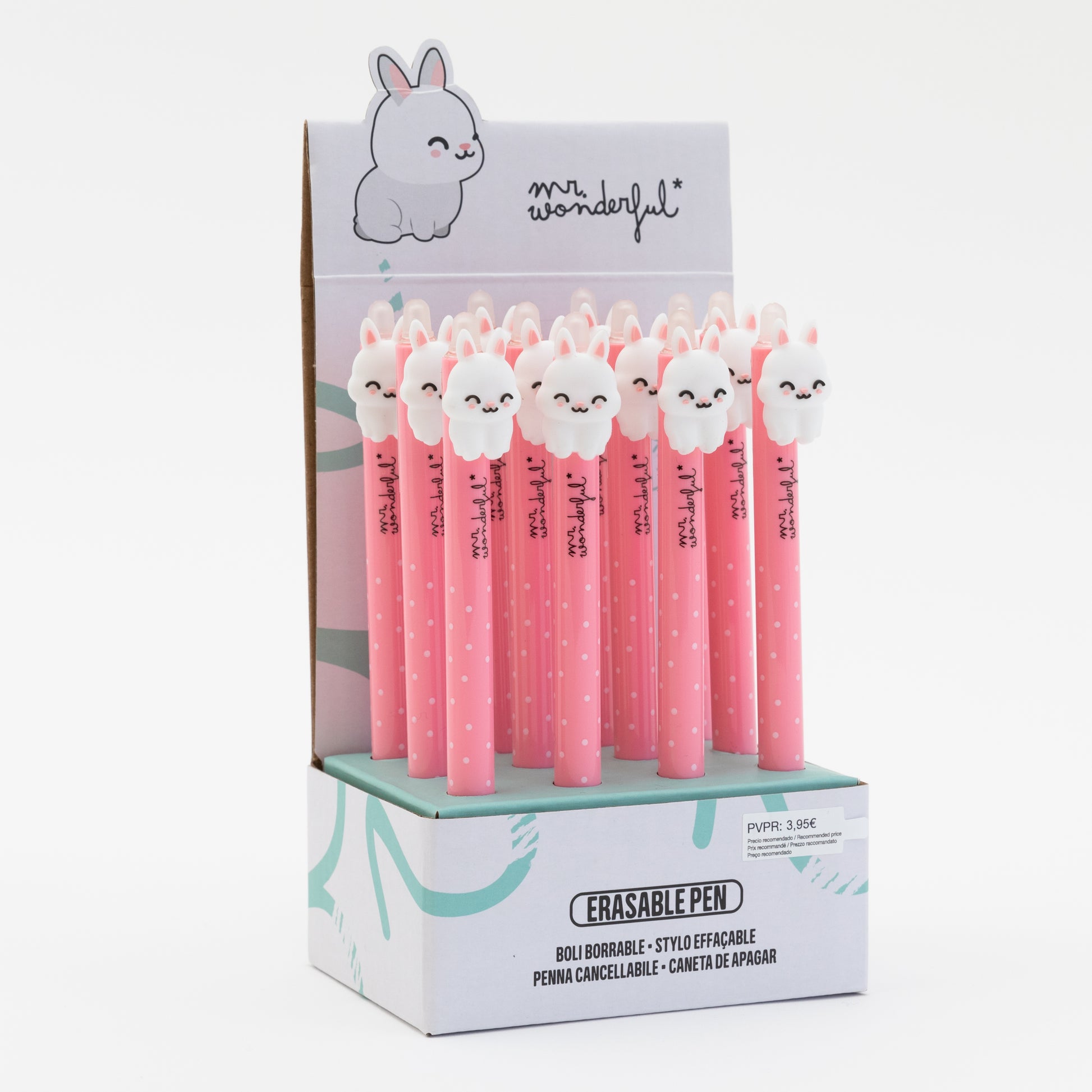 Bolígrafo con tinta borrable, cuenta con un personaje Mr. Wonderful en uno de sus extremos. El color de la tinta es negro.
