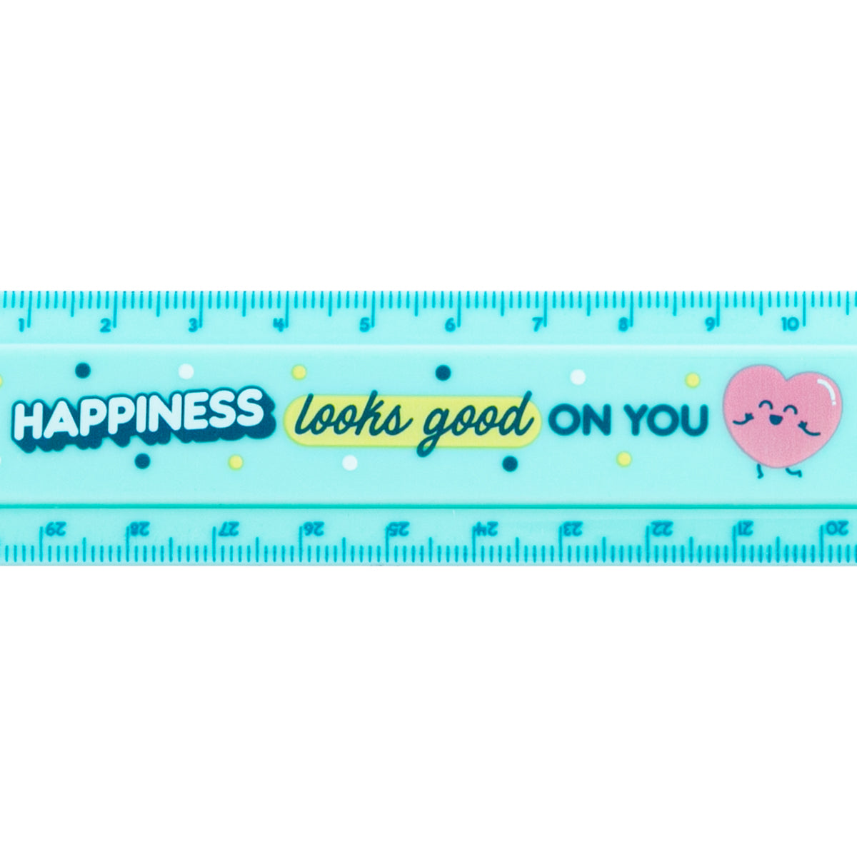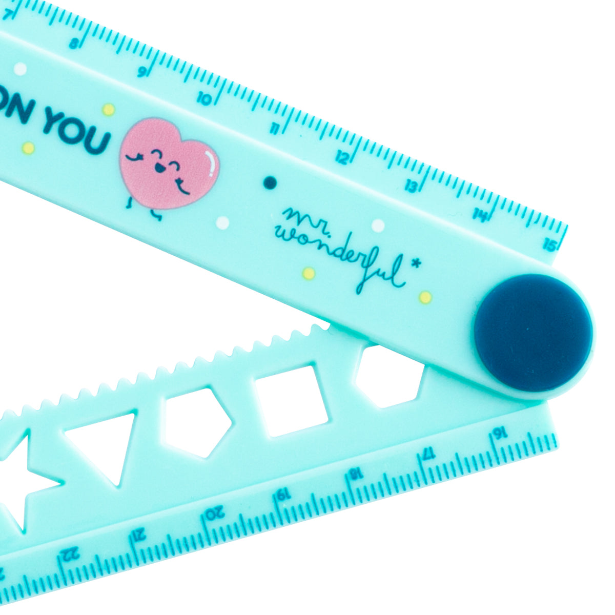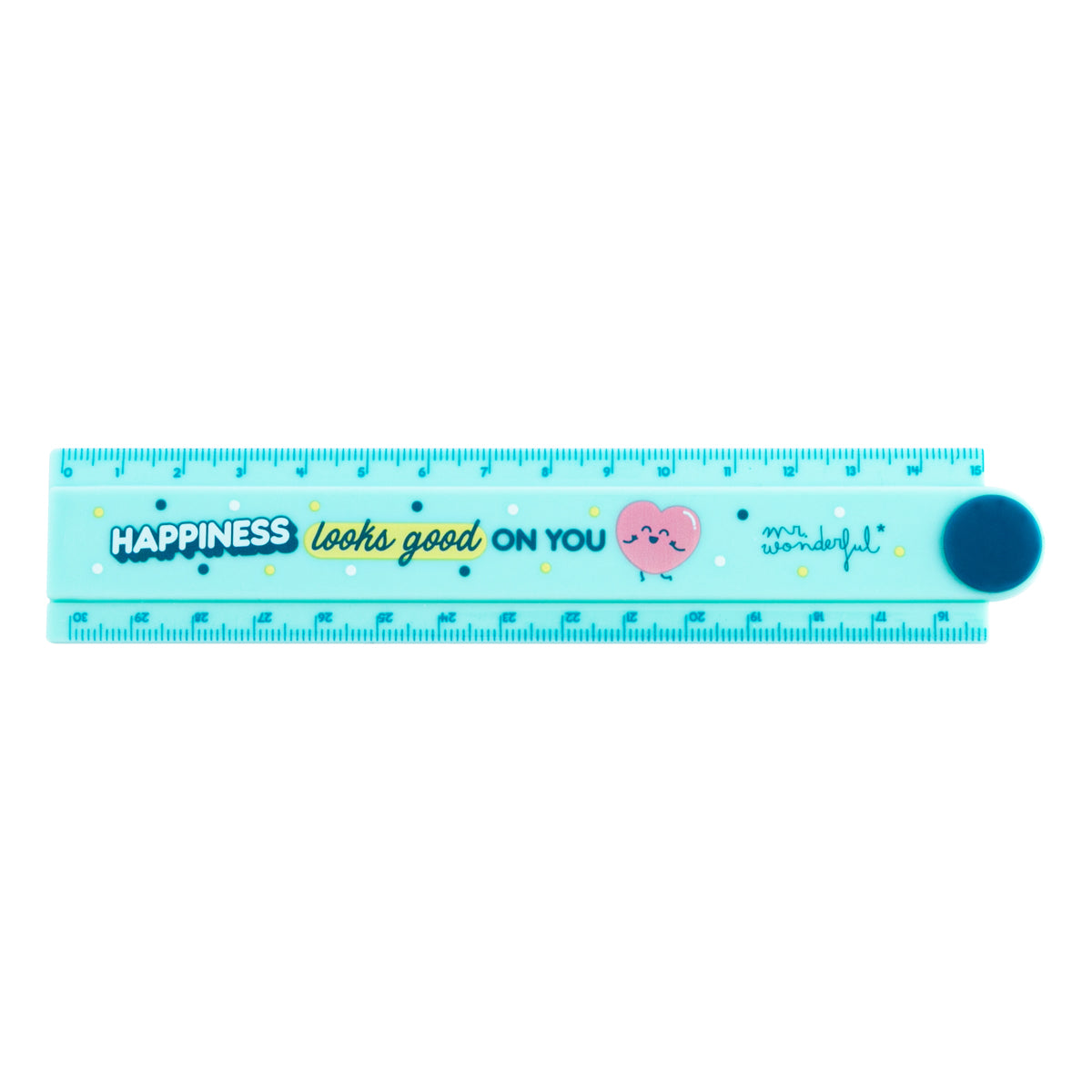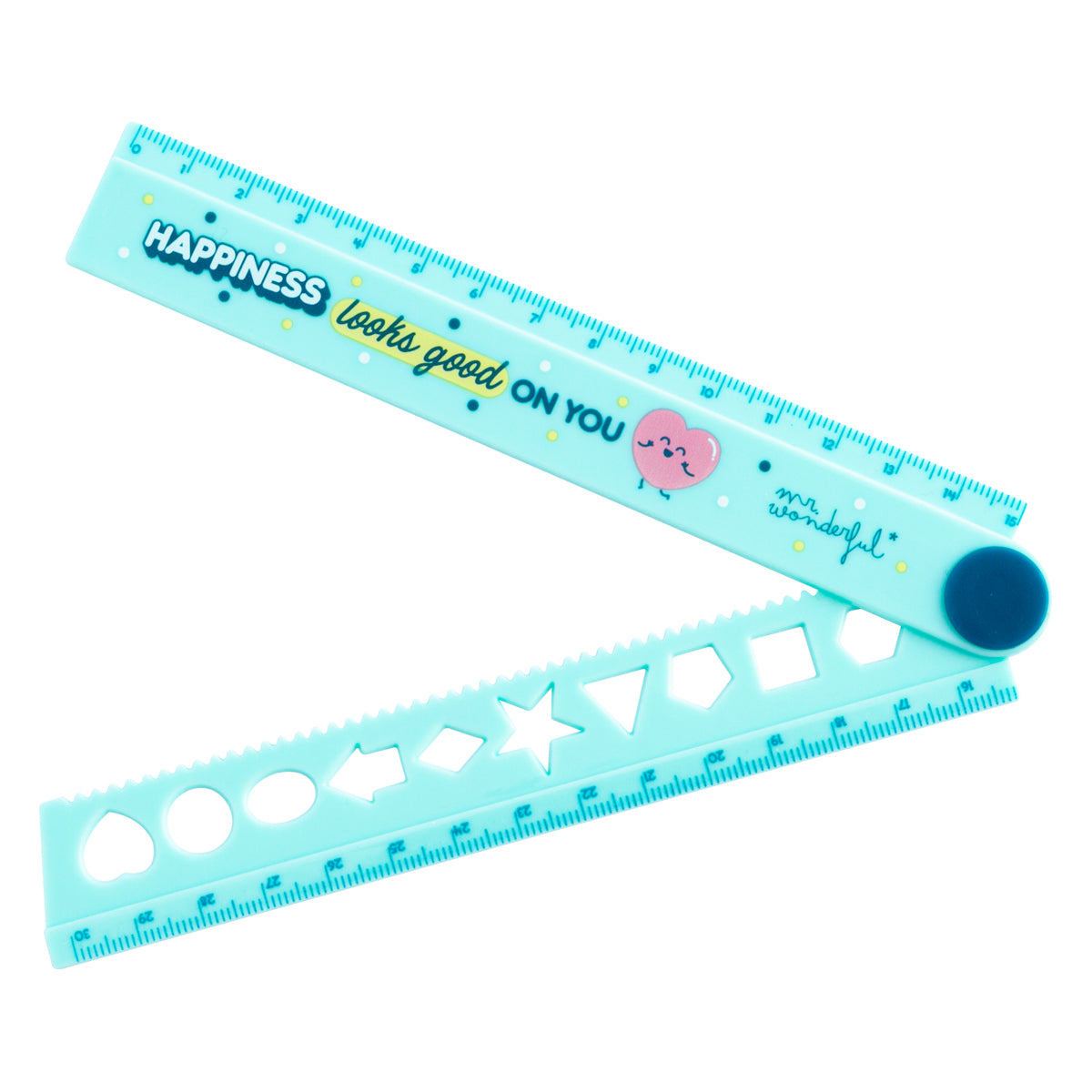 Regla desplegable con mensaje impreso en ella. Una vez abierta, mide 30 cm.
