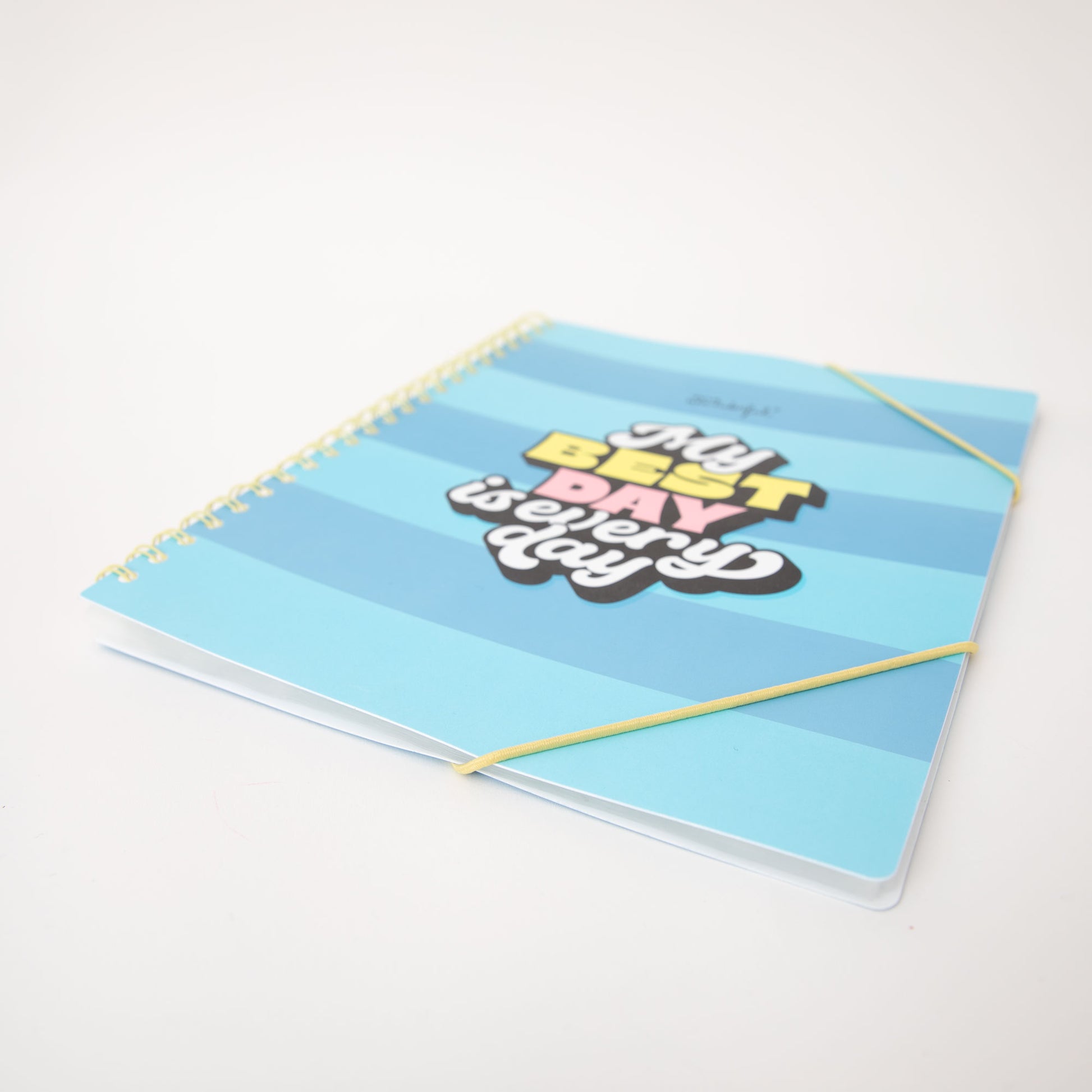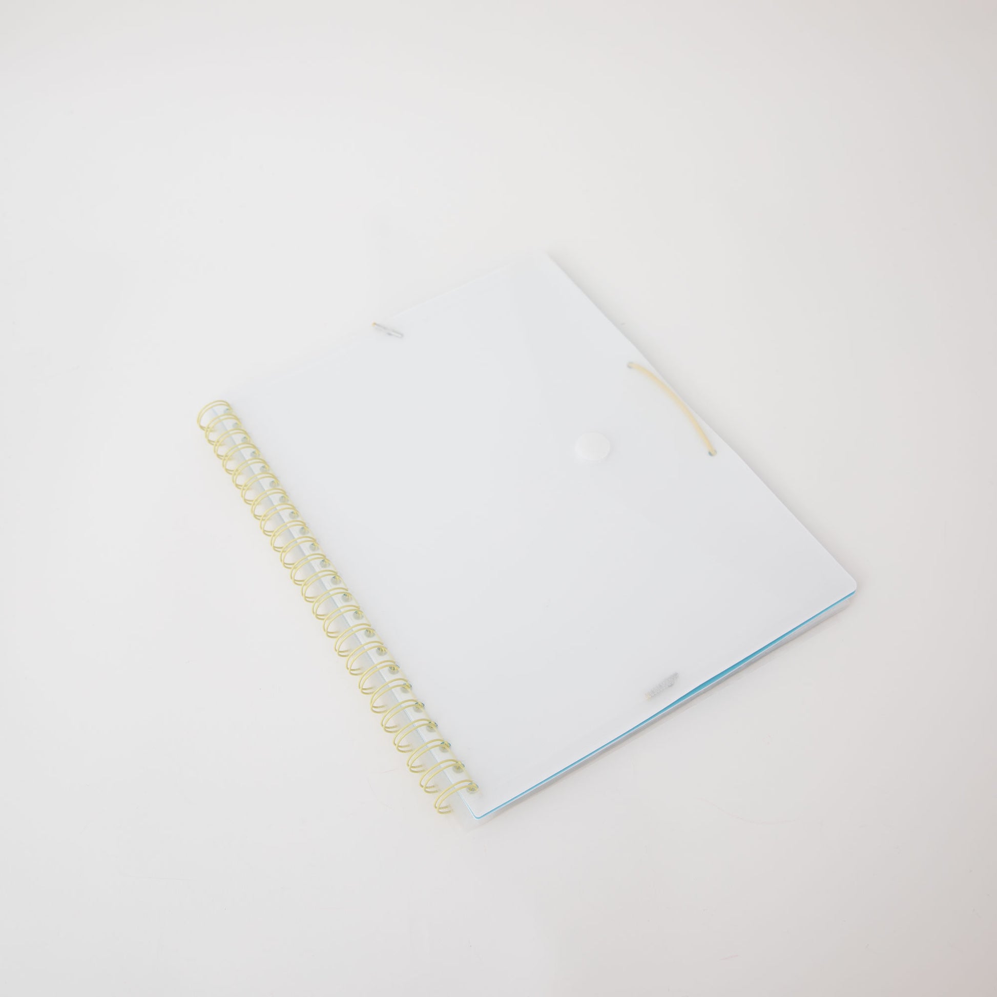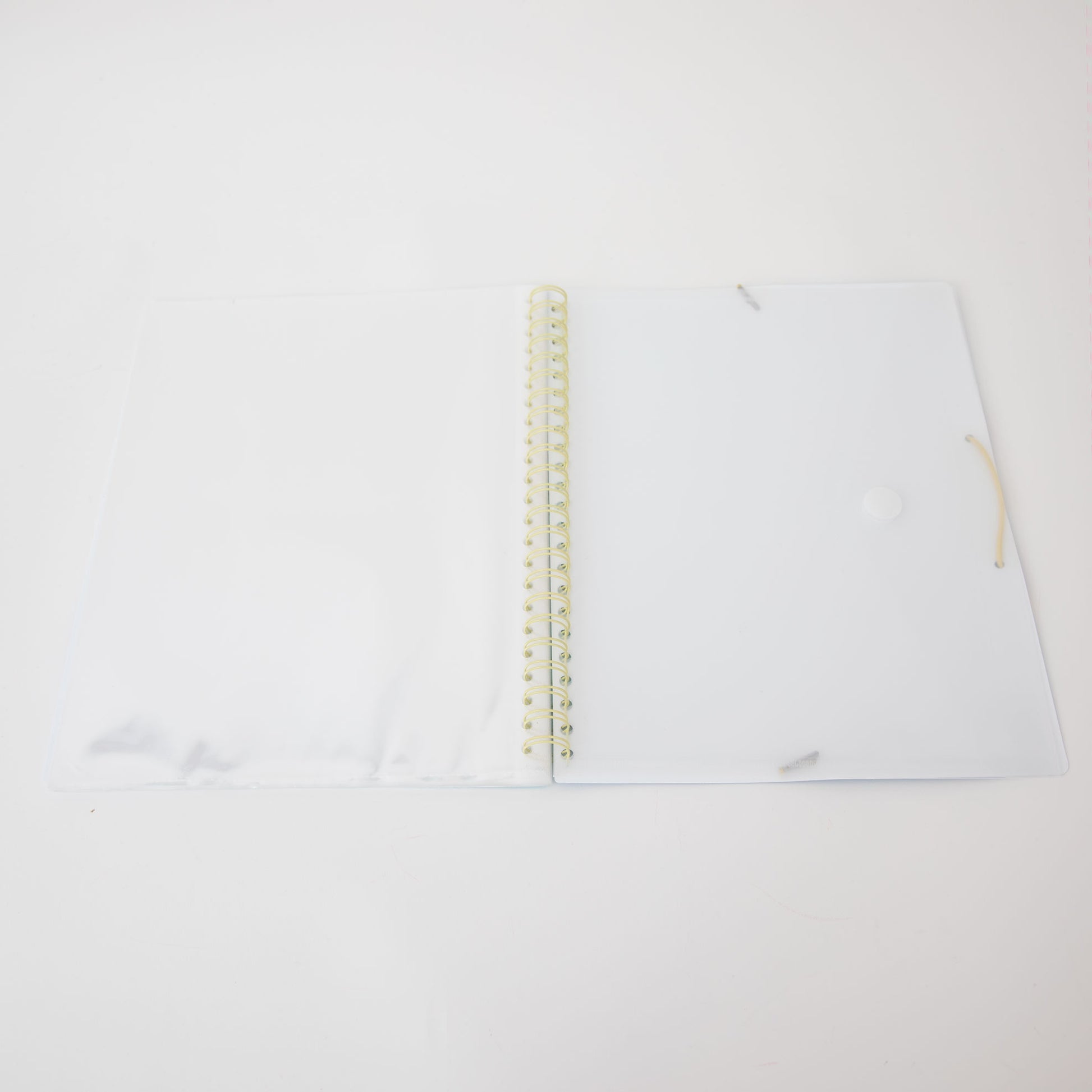 Carpeta con gomas elásticas para el cierre, realizada en plástico. Con encuadernación en espiral, lo que hace que su uso sea aún más cómodo.