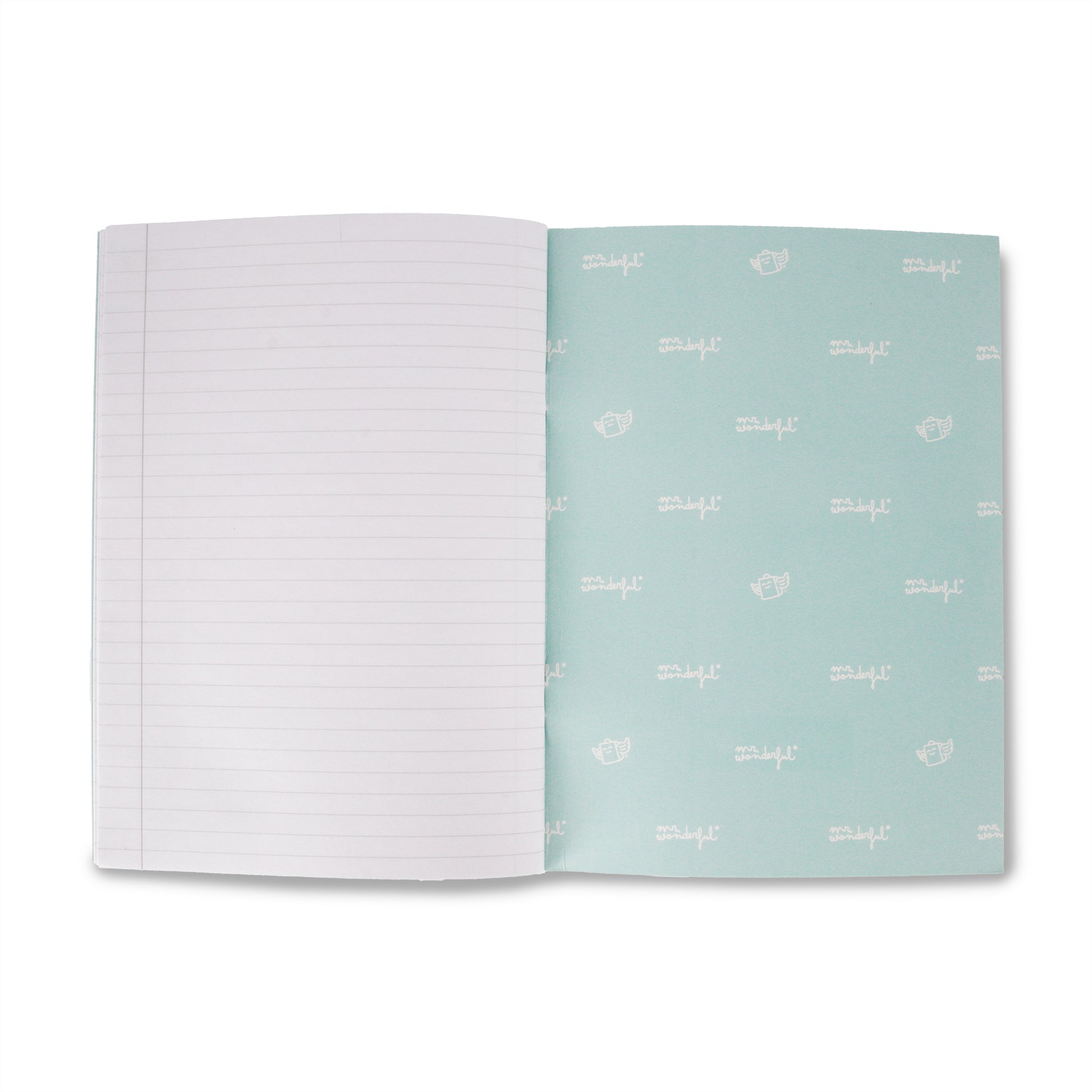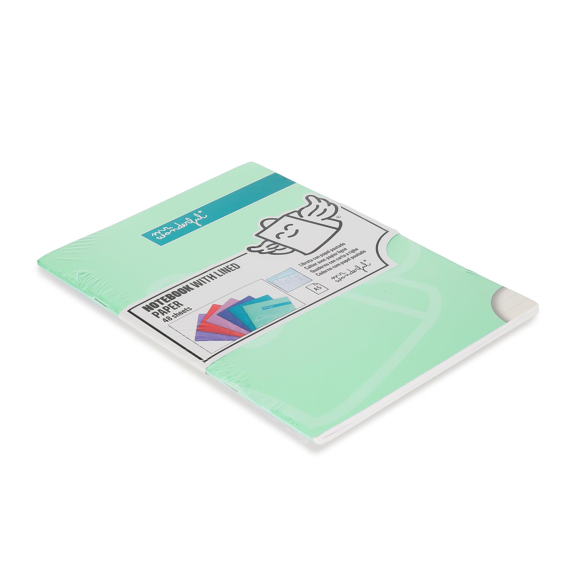 Libreta A5 con tapa blanda y encuadernación grapada, con páginas rayadas en su interior.