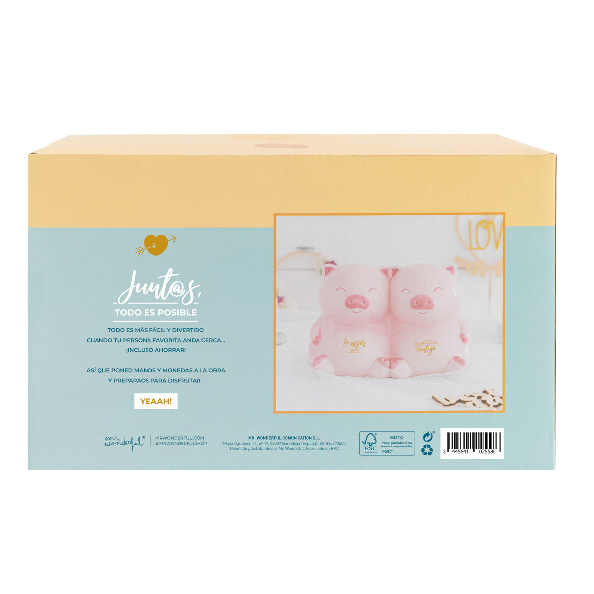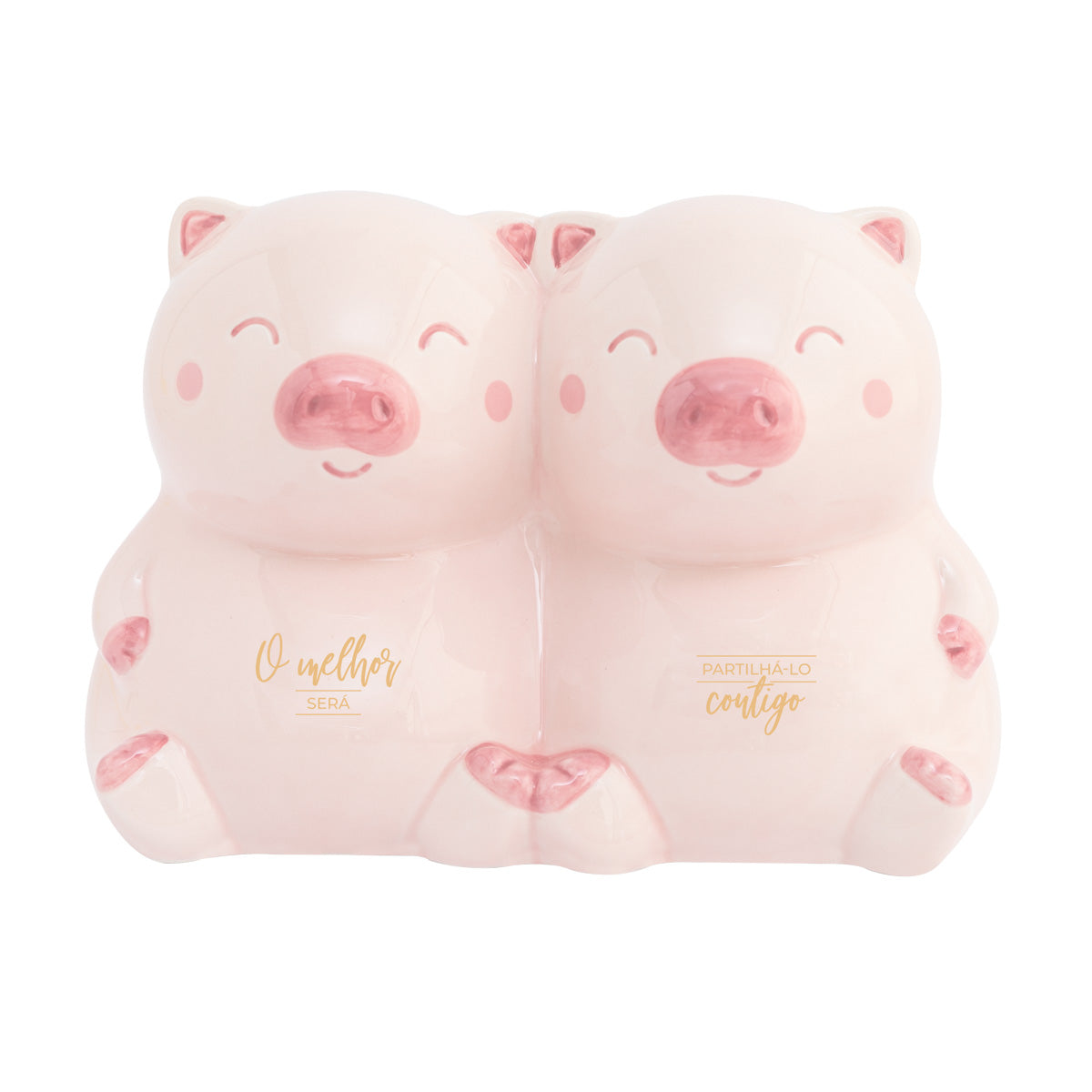 Hucha realizada en cerámica, en lugar de tener forma del típico cerdito de las huchas, en este caso se trata de una pareja de dos cerditos, lo que le aporta originalidad al producto. Cuenta con un tapón en su parte inferior para poder acceder al dinero ahorrado.