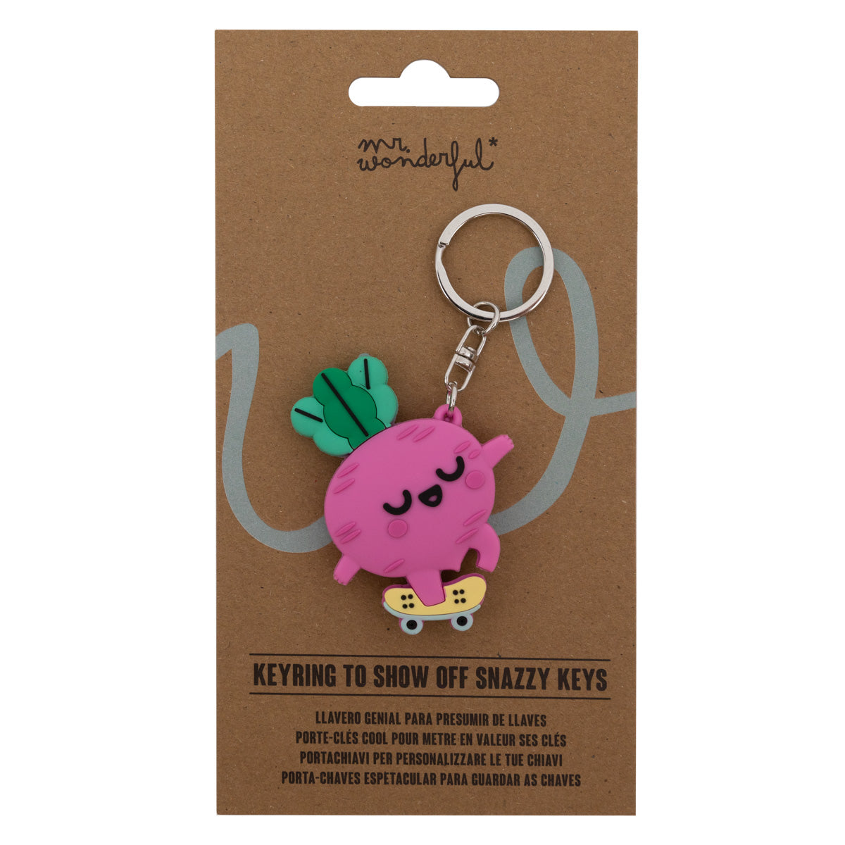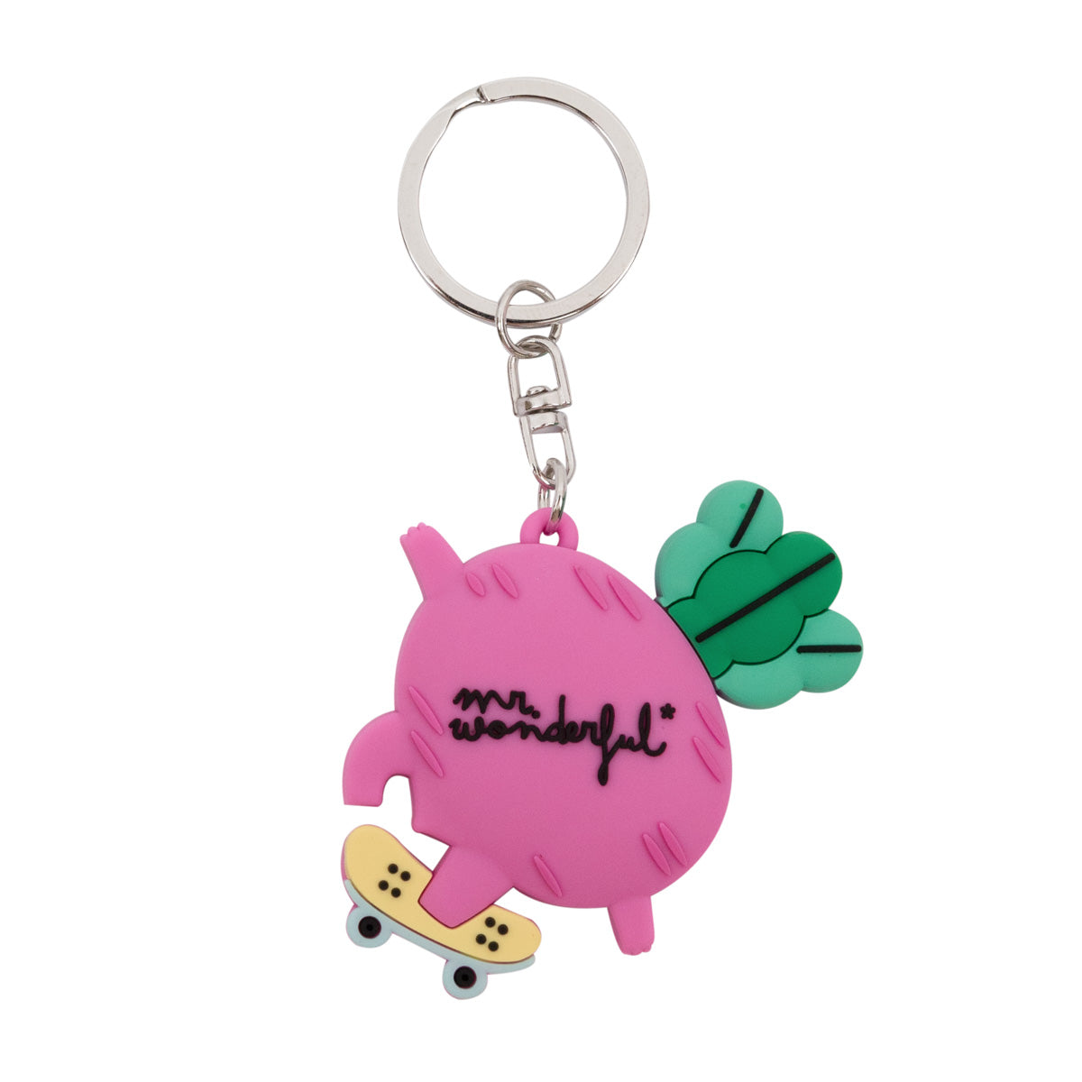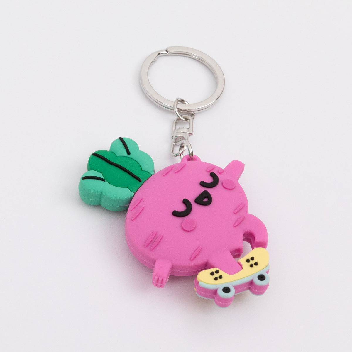 Llavero realizado en caucho, que representa a nuestra querida remolacha Natasha montada en un monopatín.