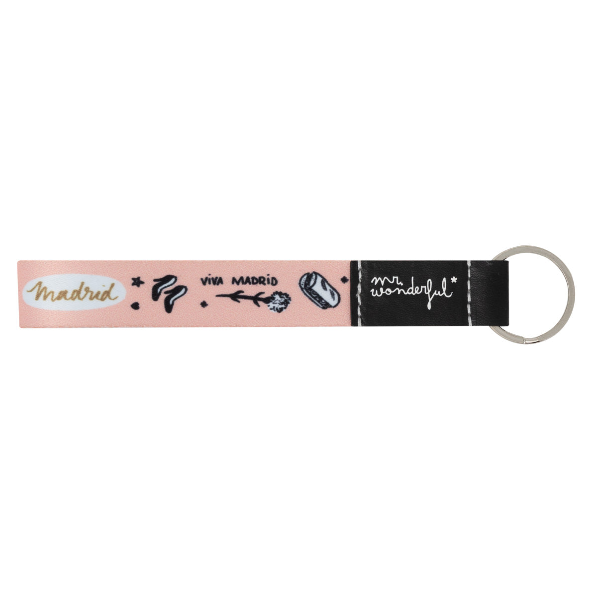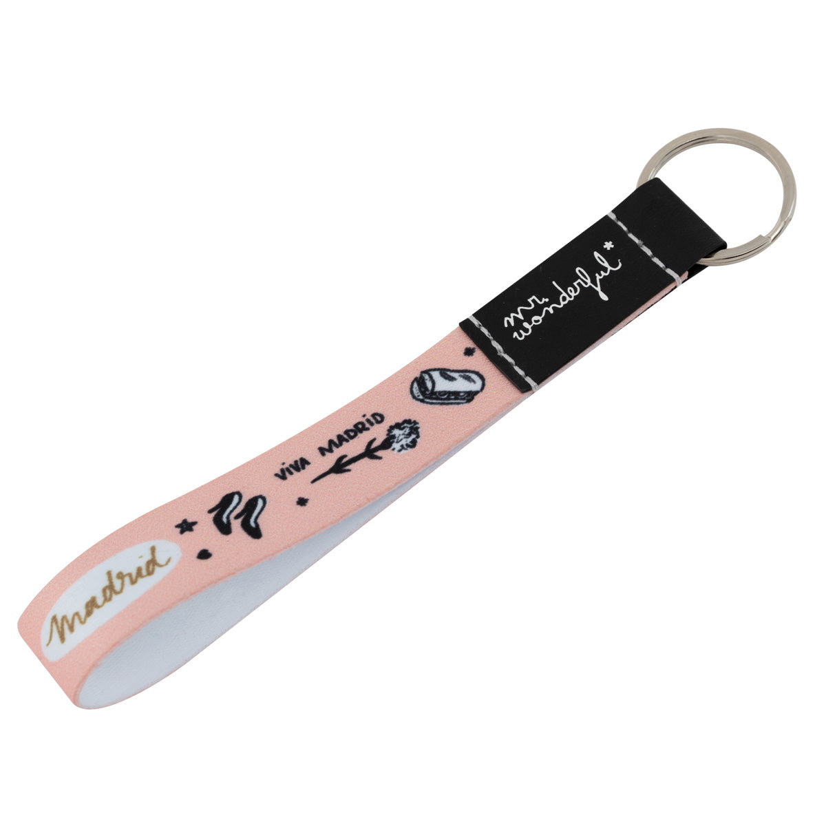 Llavero con una cinta colgante decorada con un diseño sobre la ciudad de Madrid.