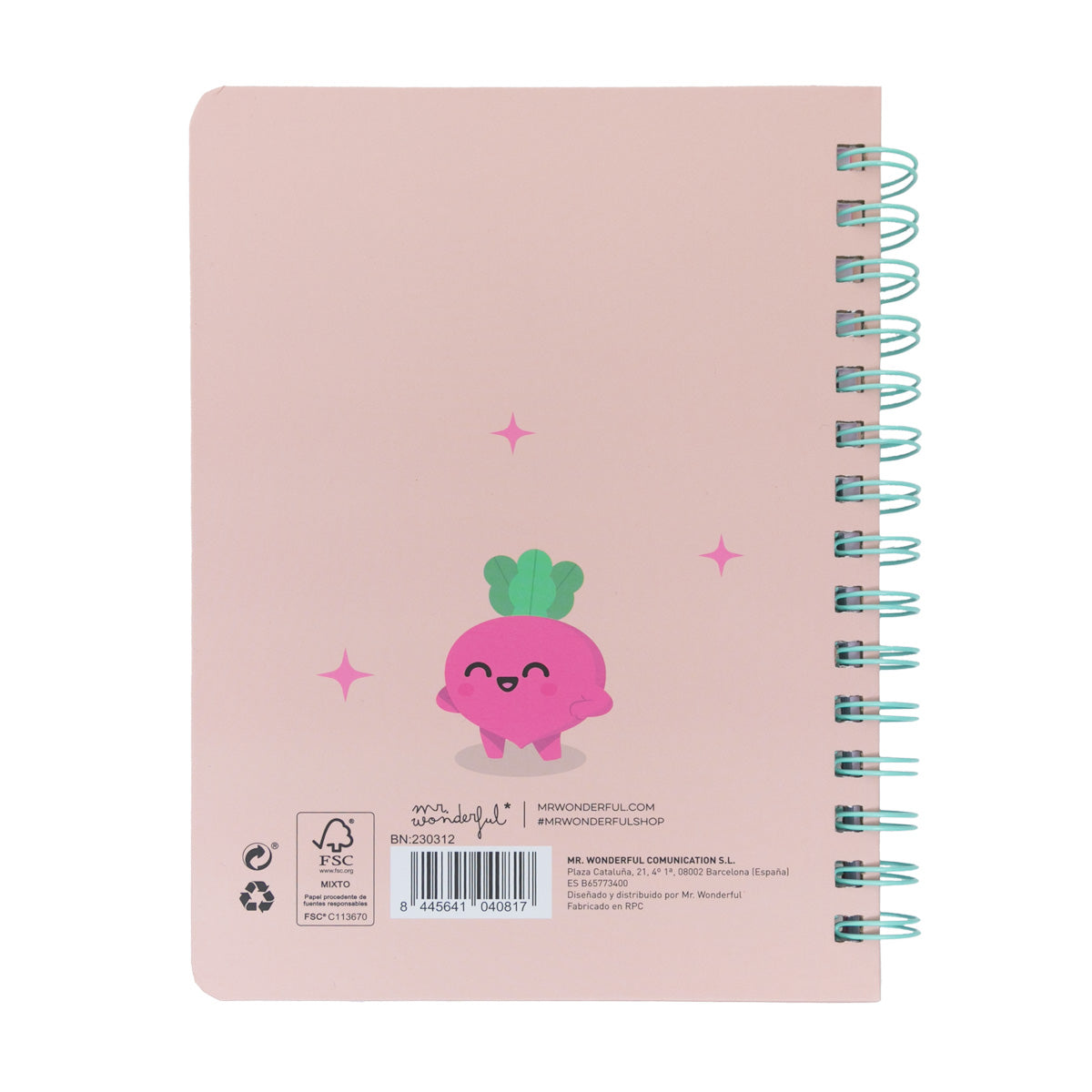 Libreta A5 con encuadernación en espiral y 160 páginas blancas de papel de 90 gr. Cuenta con el certificado FSC, que garantiza que ha sido fabricado con papel proveniente de bosques gestionados de manera responsable. En su portada encontramos una remolacha Wonder en relieve, acompañada de un divertido mensaje.