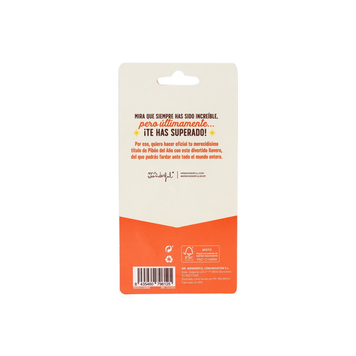 Aunque hay un montón de pibones repartidos por el mundo, solo hay uno que merece el título de Pibón del Año y, como en Mr. Wonderful sabemos que tienes un gusto excelente, estamos convencidos de que se lo vas a conceder a la persona adecuada. Por eso, ponemos en tus manos este pedazo de llavero con mensaje, para confiarte la tarea de hacerle llegar este gran premio a quien se lo ha ganado gracias a su estilazo. Ya sabes de quién estamos hablando, ¿verdad? ¡Claro que sí! Nos referimos a ese pibonazo arrasador que consigue atrapar todas las miradas por donde pasa. ¡Ya verás qué ilusión le va a hacer recibir el ansiado galardón! Sería genial organizar una ceremonia de entrega con alfombra roja y todo, como esas en las que las celebrities lucen sus mejores galas. ¿Te imaginas qué subidón? Bueno, tal vez sea excesivo montar ese show, pero seguro que, si pones en marcha esa cabecita, se te ocurre algún plan fantástico para que el momento de dárselo sea inolvidable. Nosotros te proponemos que le dediques una canción que comience diciendo: “Se ha ganado este llavero Mr. Wonderful el mayor pibón del mundo entero”. Ahora te toca a ti continuar con la letra y que sea muy guay, ¿eh?