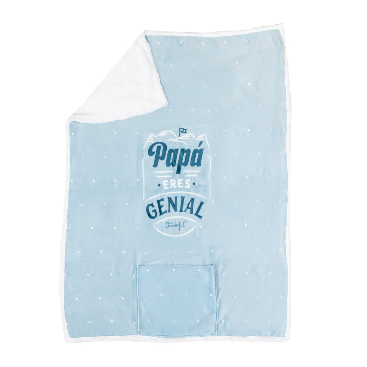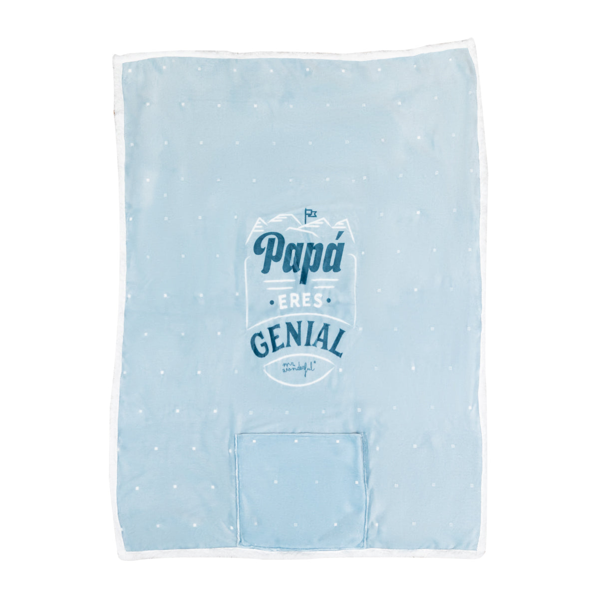 Manta con mensaje para padres realizada en poliéster de 220 gr, de tipo polar, con tacto muy suave. La manta se dobla sobre sí misma en su propio bolsillo, quedando como un cojín.