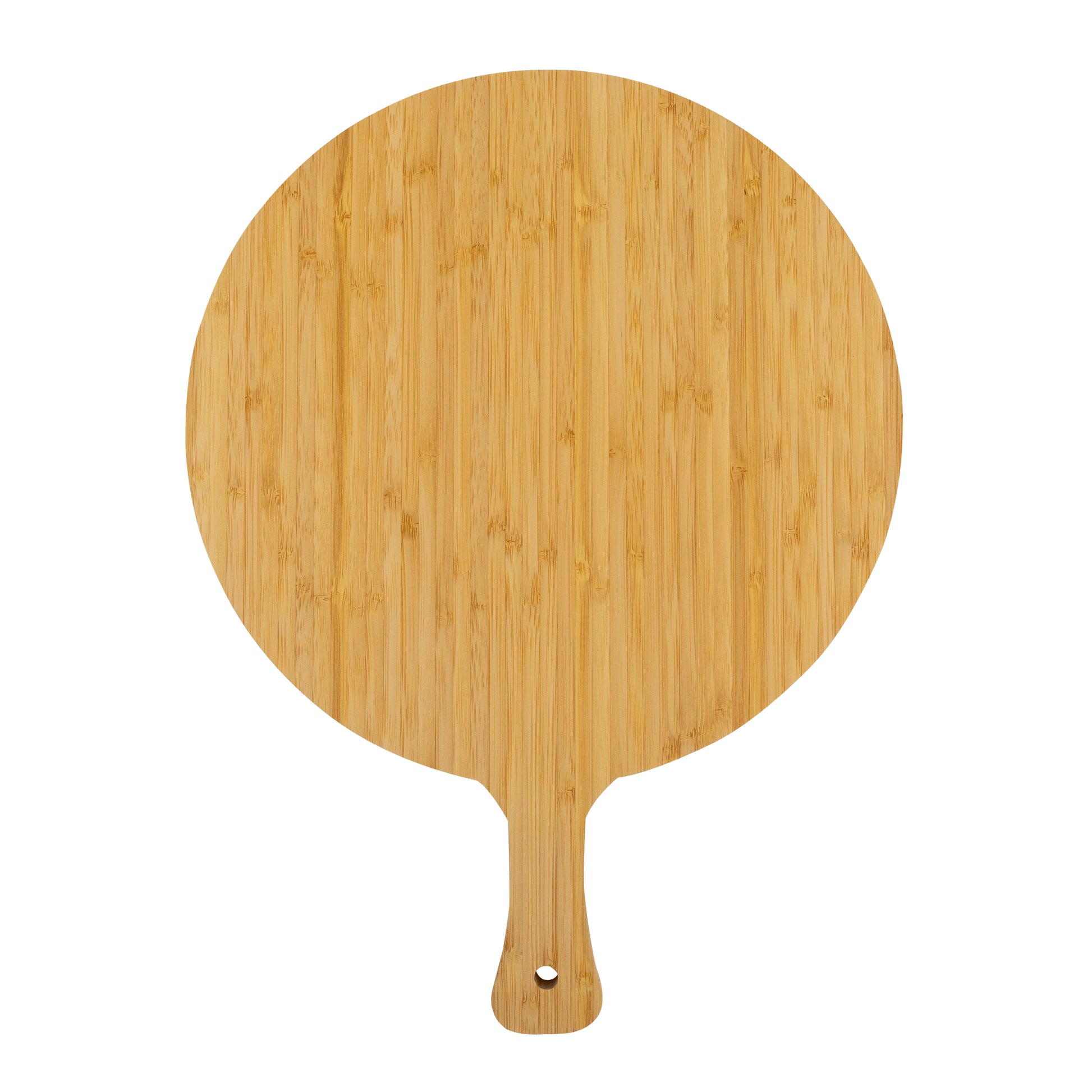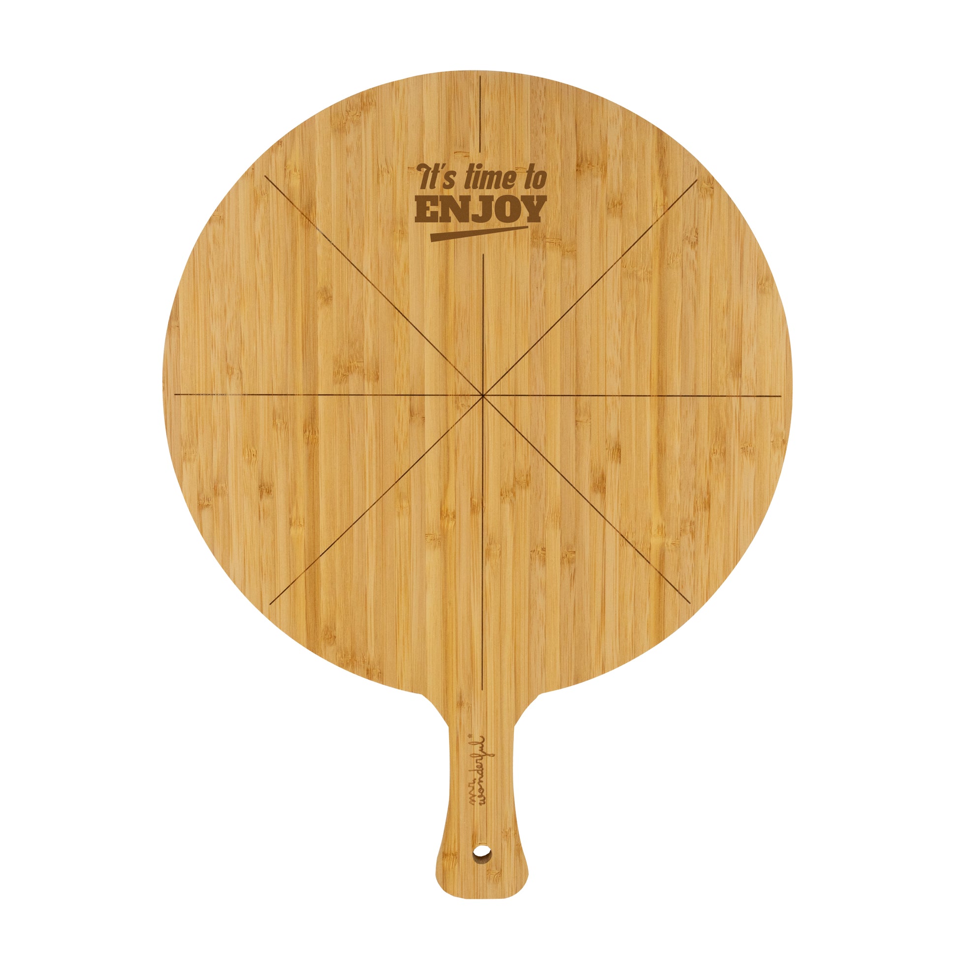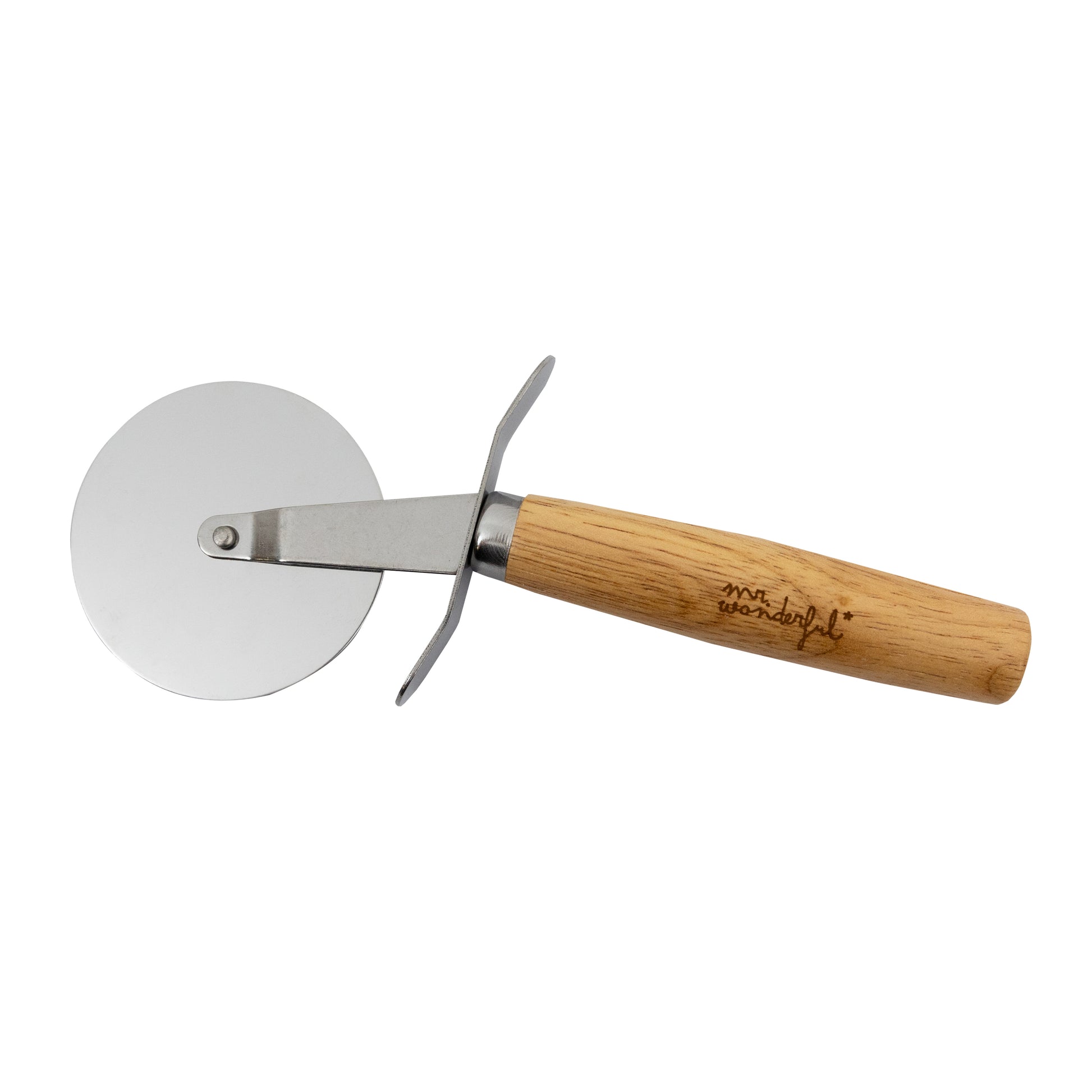 Set para servir pizzas, formado por una tabla de madera circular en la que servir y cortar la pizza, de 30 cm, y un cortapizzas metálico con mango de madera de 10 cm de longitud.