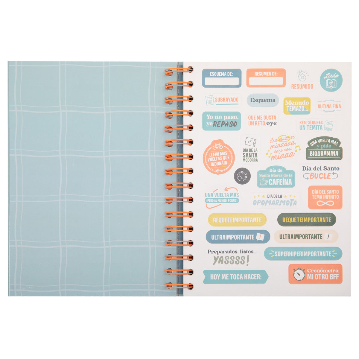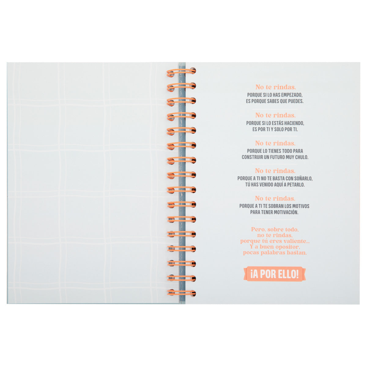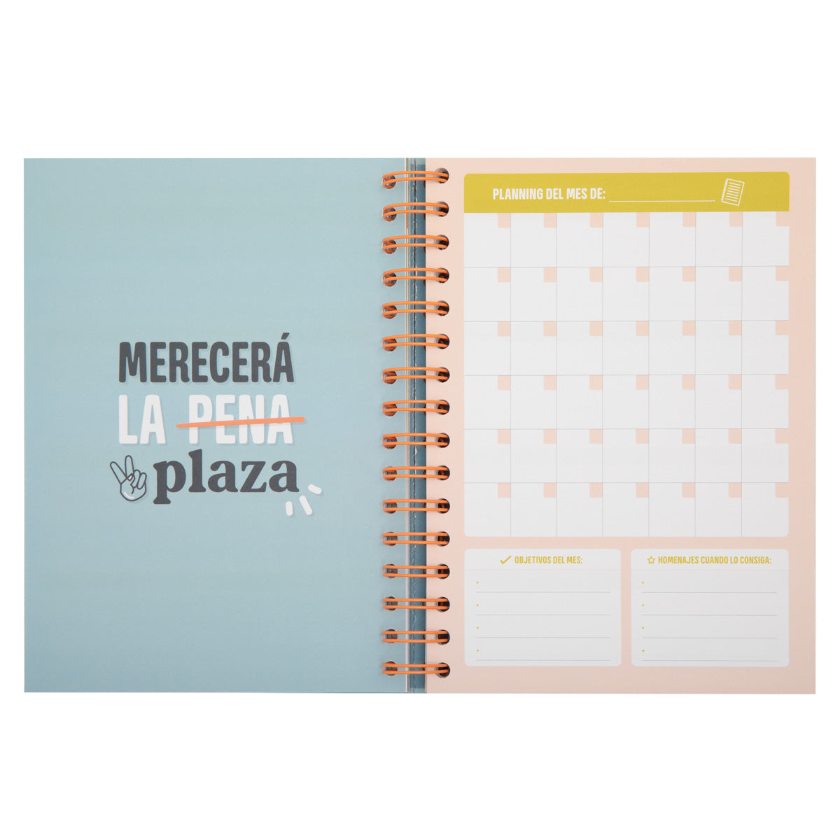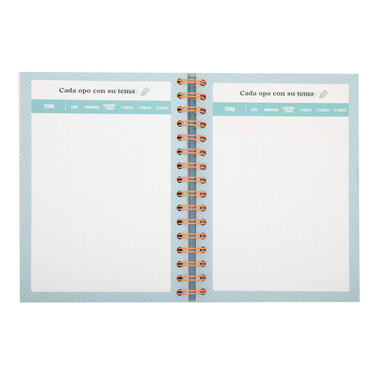 Planificador de organización semanal con contenido interior específico para opositores: páginas de habit trackers, de dudas para el preparador, técnicas de estudio, frases diarias motivadoras y pegatinas temáticas?