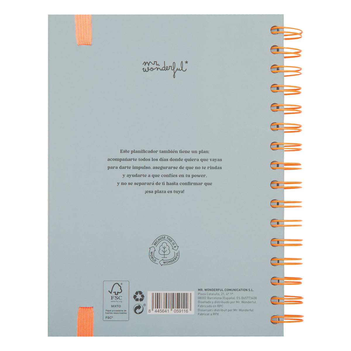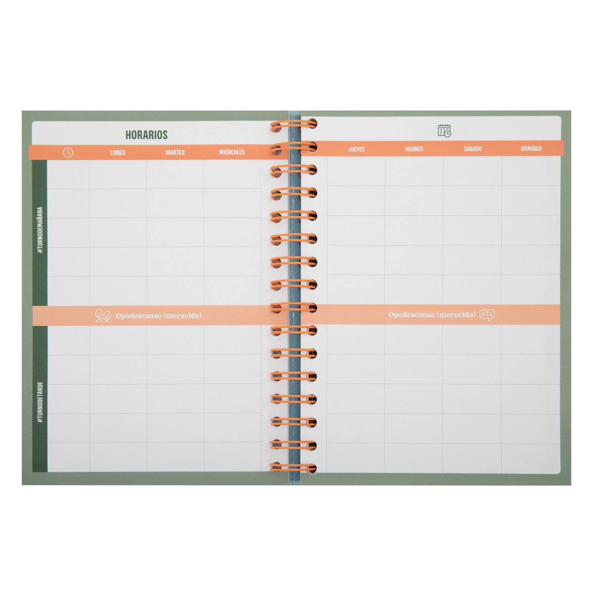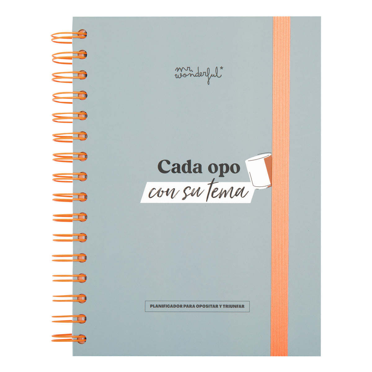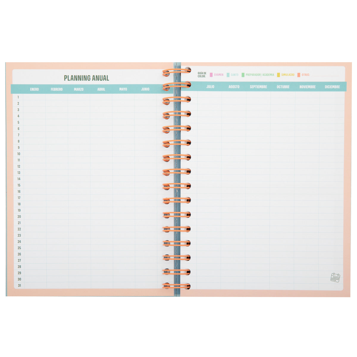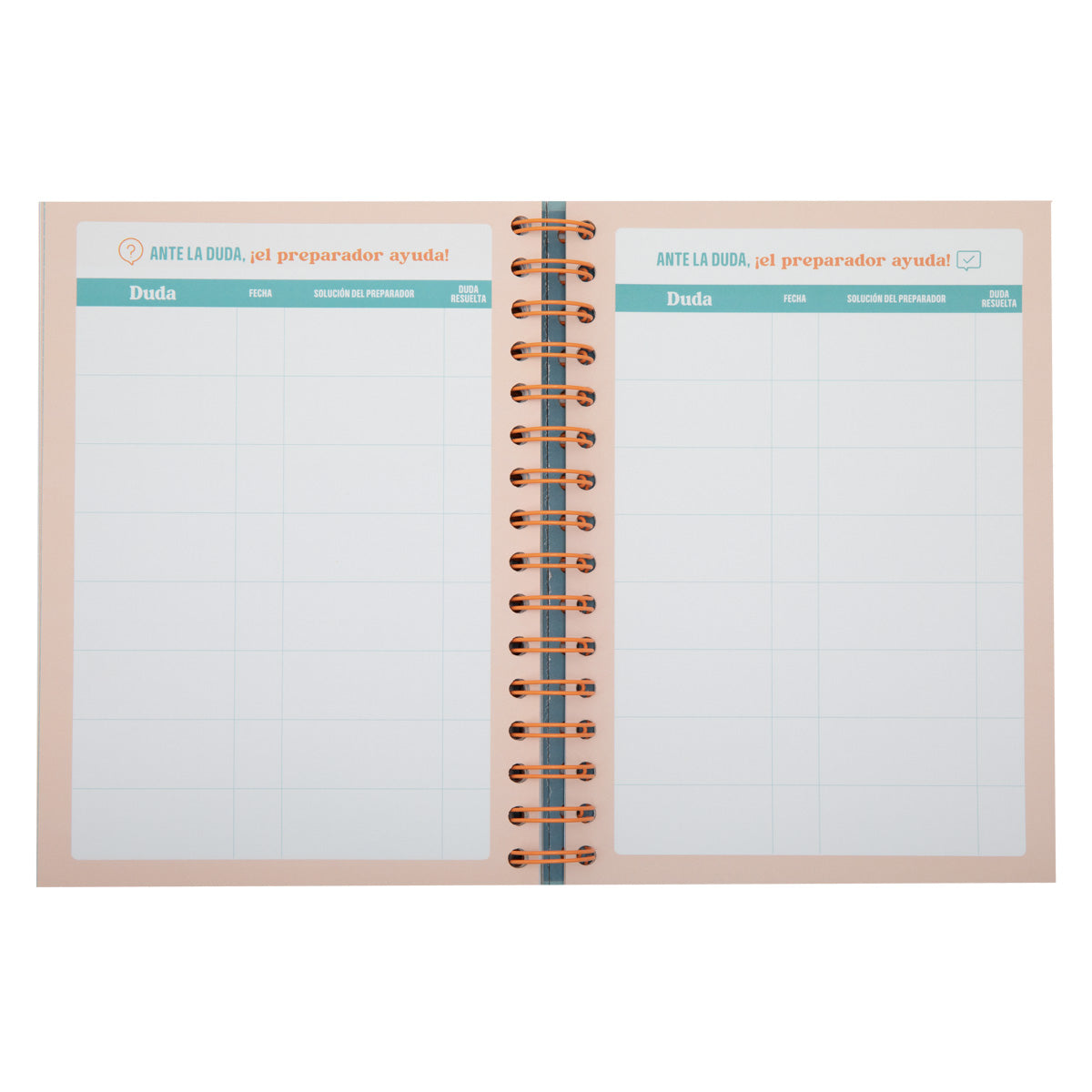 Planificador de organización semanal con contenido interior específico para opositores: páginas de habit trackers, de dudas para el preparador, técnicas de estudio, frases diarias motivadoras y pegatinas temáticas?