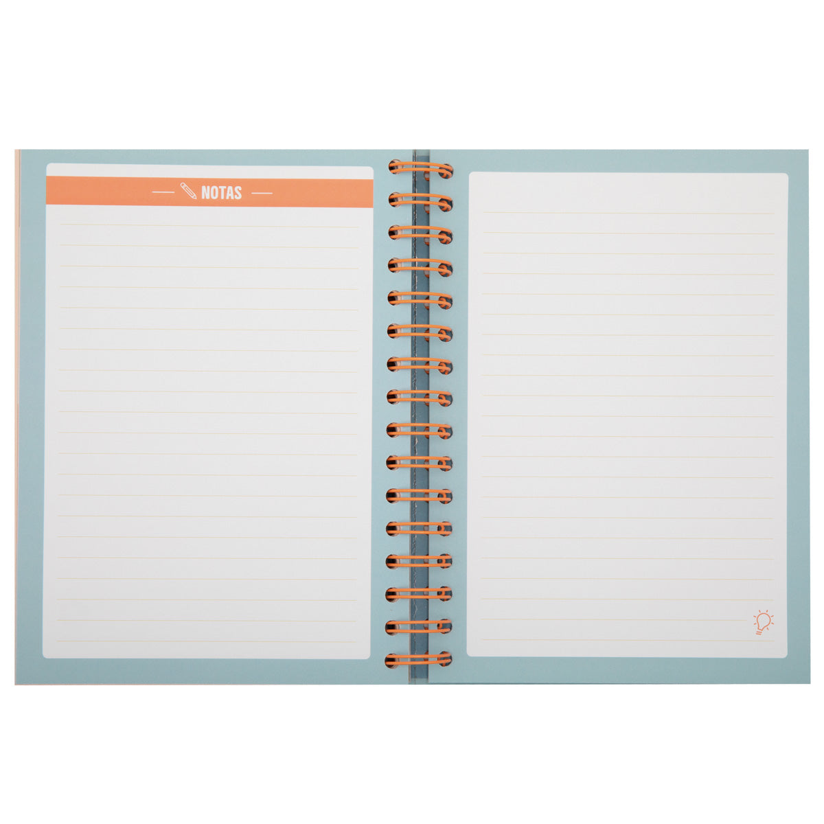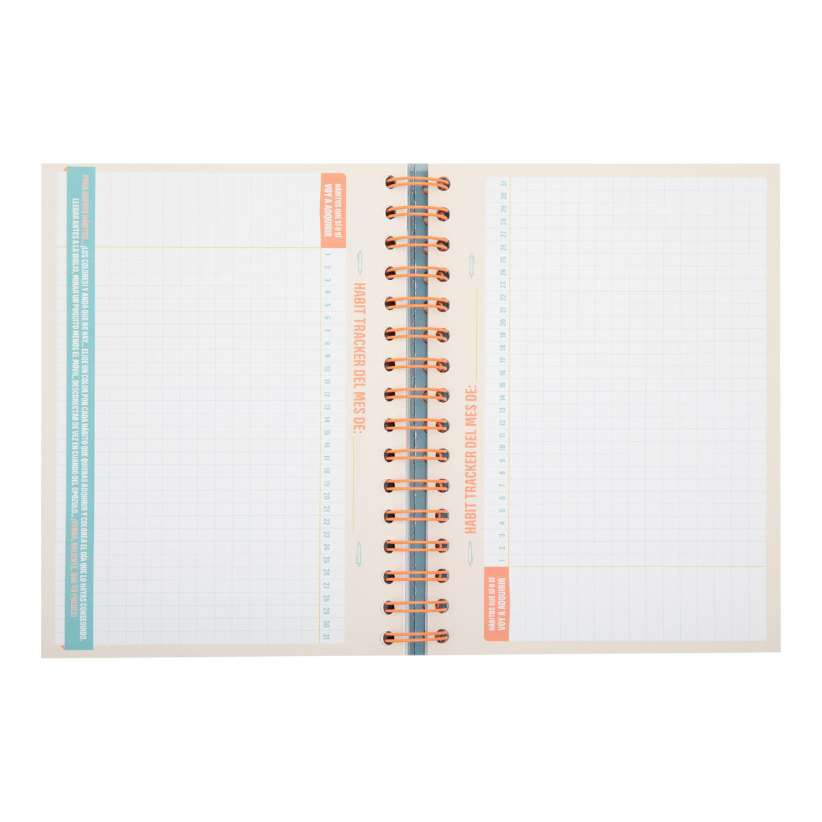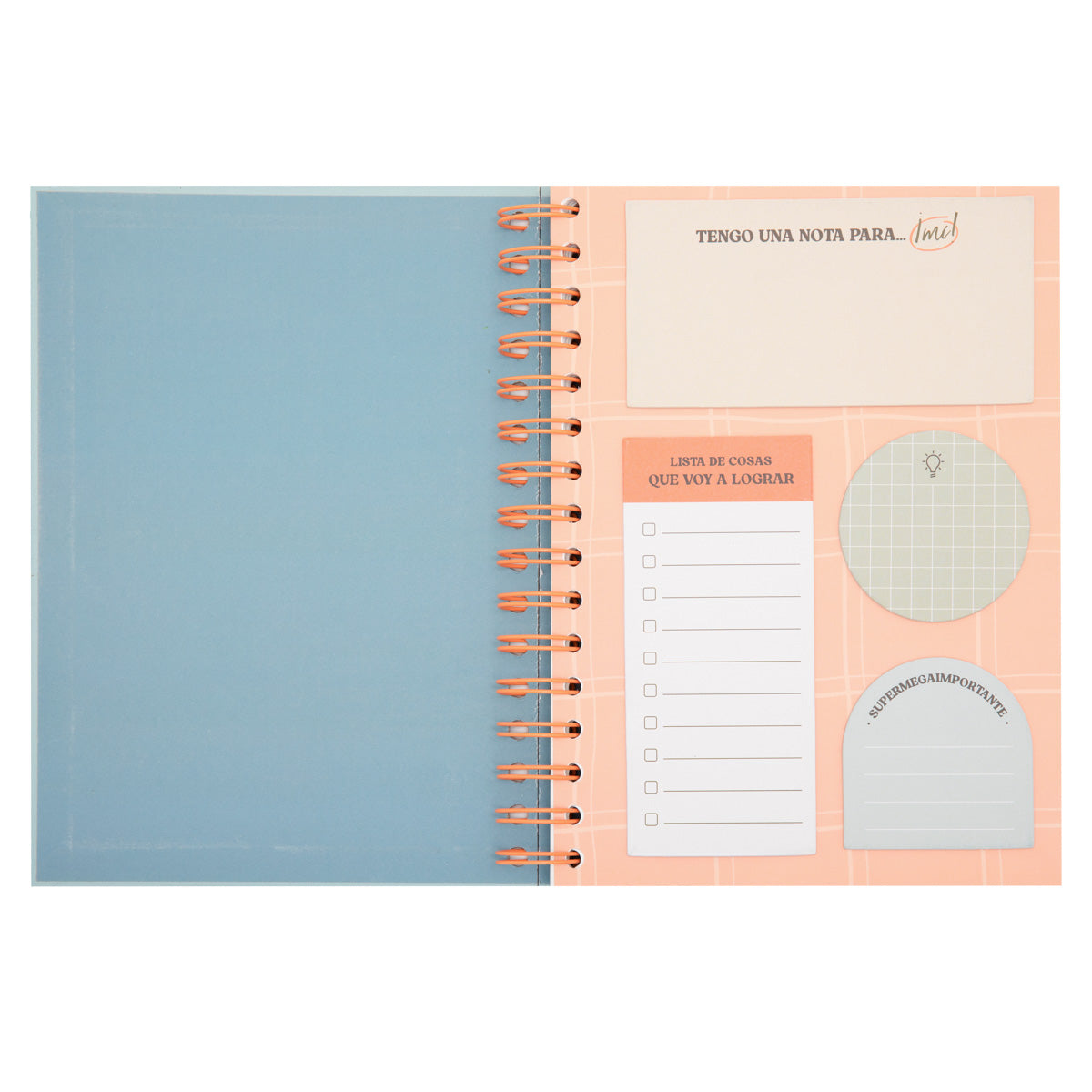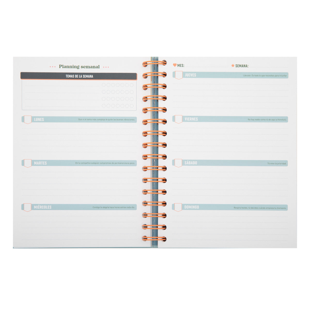 Planificador de organización semanal con contenido interior específico para opositores: páginas de habit trackers, de dudas para el preparador, técnicas de estudio, frases diarias motivadoras y pegatinas temáticas?