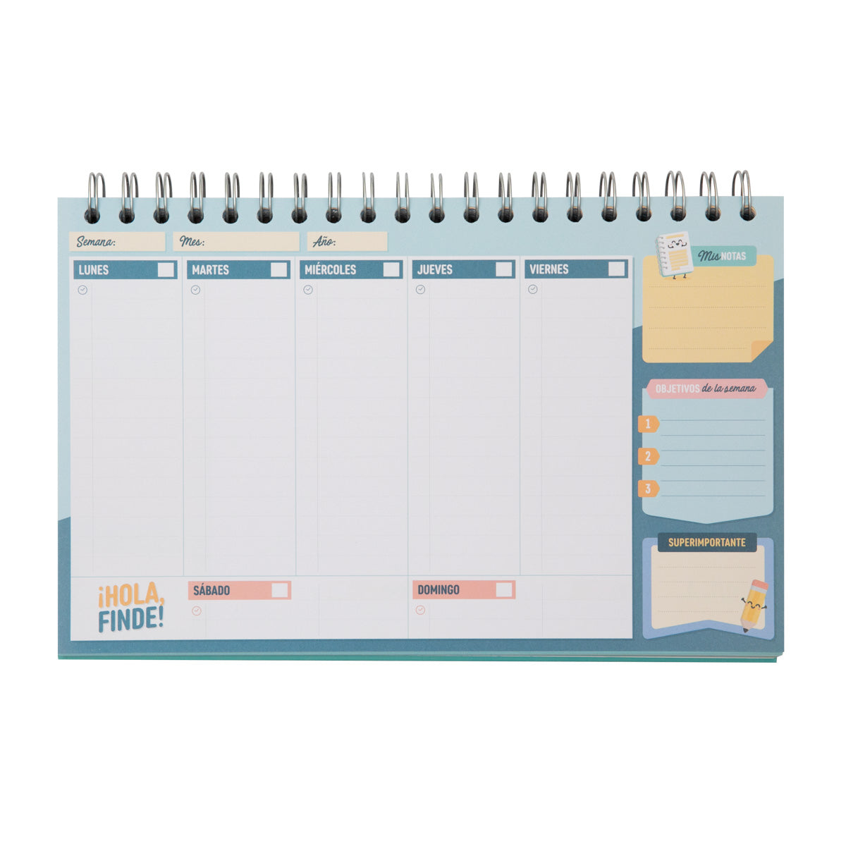 Planificador de organización semanal, apaisado, con tapa dura y encuadernación en espiral. En su interior podrás encontrar un total de 192 páginas de papel de 90 gr., en las que se alternan 8 diseños diferentes. Además, incluye 4 hojas de fantásticas pegatinas.
