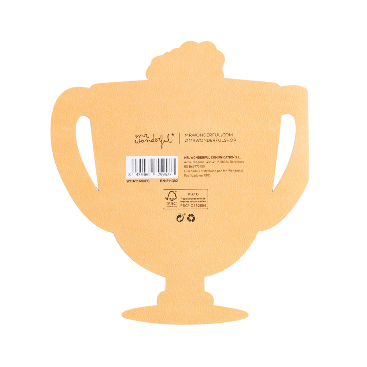Tu padre es el campeón de campeones y te encantaría regalarle un trofeo enorme, porque se lo ha ganado a pulso. El equipo de diseño de Mr. Wonderful ha querido echarte un cable creando esta postal para padres con forma de trofeo, para que tú la personalices escribiendo con tu boli favorito lo que quieras decirle a tu gran héroe. Siempre te acompaña en los momentos importantes de tu vida y si tuvieras que contar la cantidad de veces que acudes a él, tendrías que inventar nuevos números. Con él vives grandes momentos y te conoce mejor que nadie. Cuando te ve entrar por la puerta ya sabe cómo te ha ido el día. Te apetece mucho darle gracias por estar ahí desde que llegaste al mundo y gritar bien fuerte: “¡Qué suerte tengo yo de tener un padre como tú!”. Pues acabas de encontrar una forma muy original de decírselo y estamos seguros de que le va a hacer una ilusión tremenda abrir el sobre y descubrir esta sorpresa. ¡Esto sí que no se lo espera! Puedes acompañarla con lo que te apetezca. Desde una corbata hasta un descapotable, sabes que todo será muy bien recibido, ¡porque tienes un padre requetemajo!