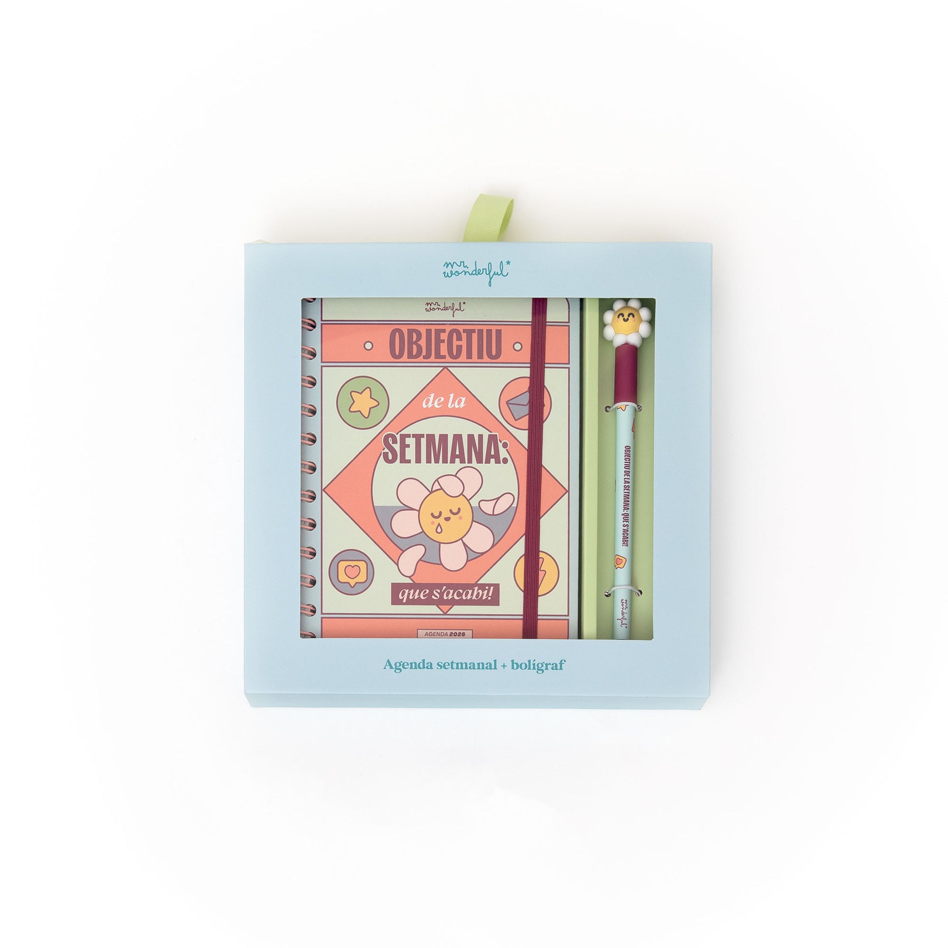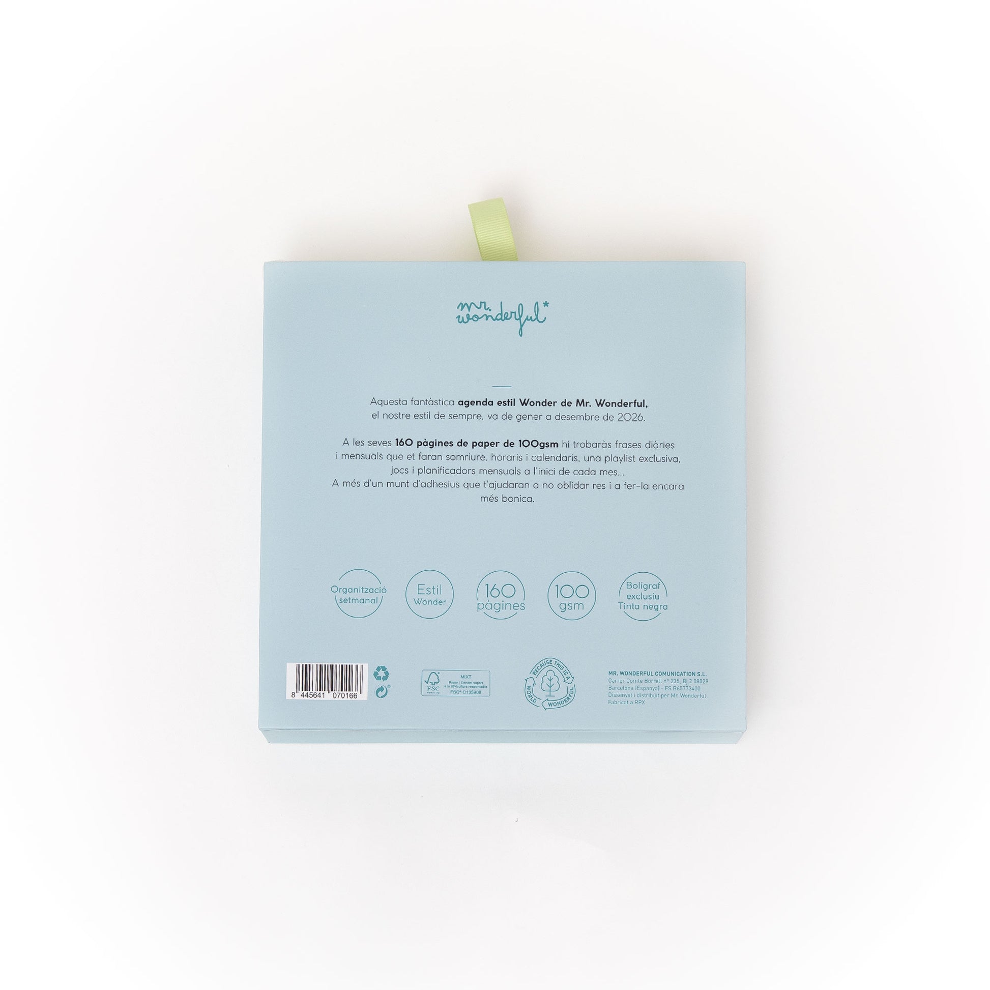 Set composat per una agenda petita d'estil Wonder de Mr. Wonderful, amb organització setmanal, que va de gener a desembre de 2026, y un bonic bolígraf exclusiu a conjunt amb tinta negra.