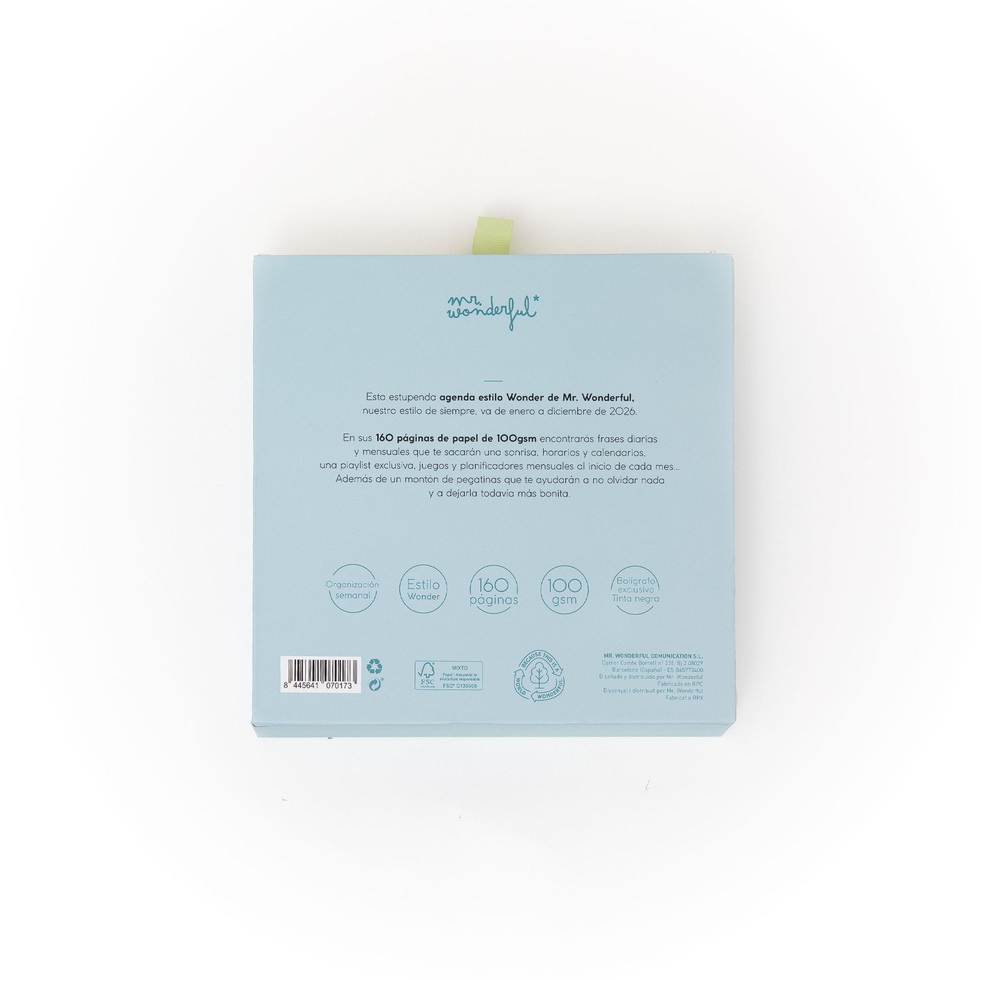 Set compuesto por una agenda pequeña de estilo Wonder de Mr. Wonderful, con organización semanal, que va de enero a diciembre de 2026, y un bonito bolígrafo exclusivo a conjunto con tinta negra.