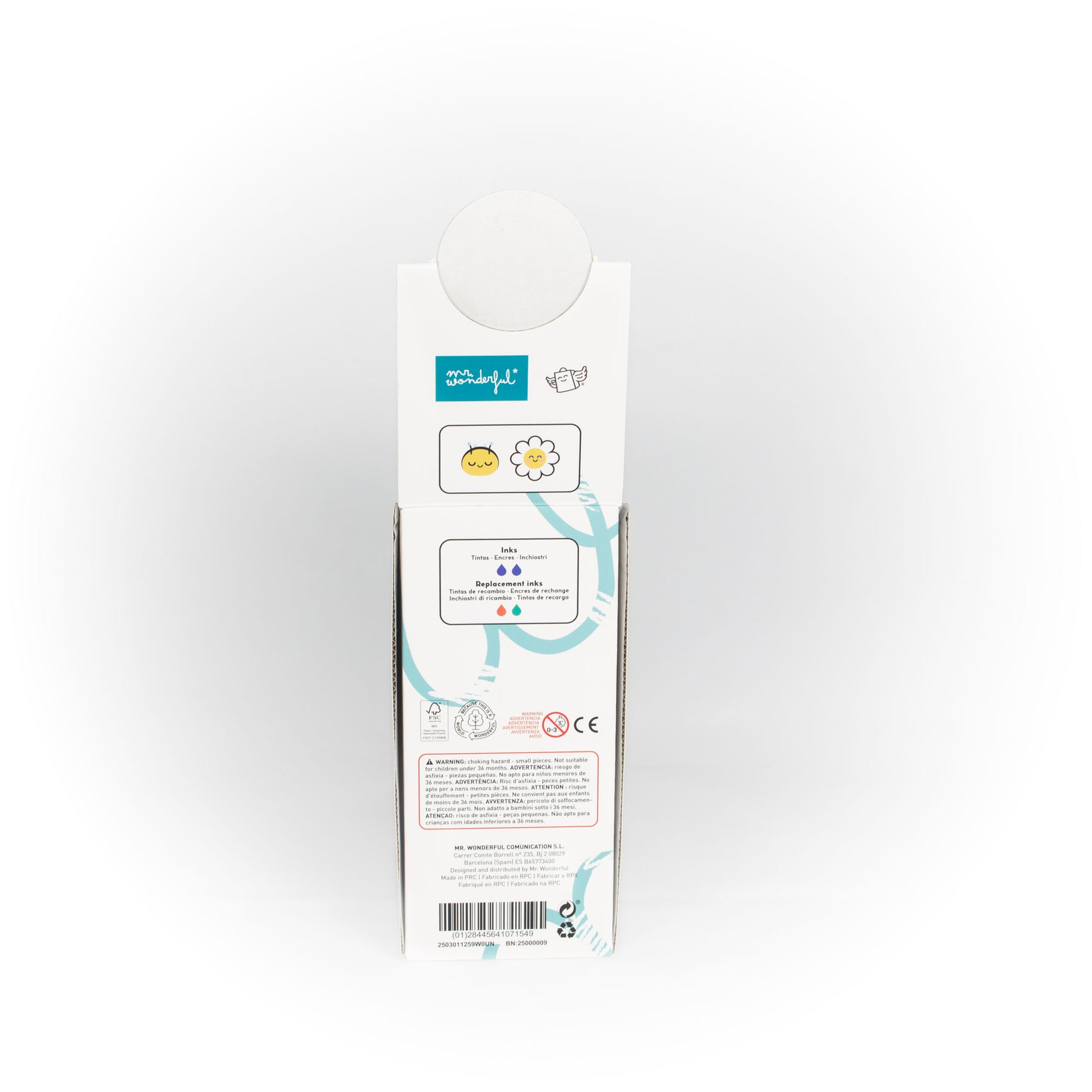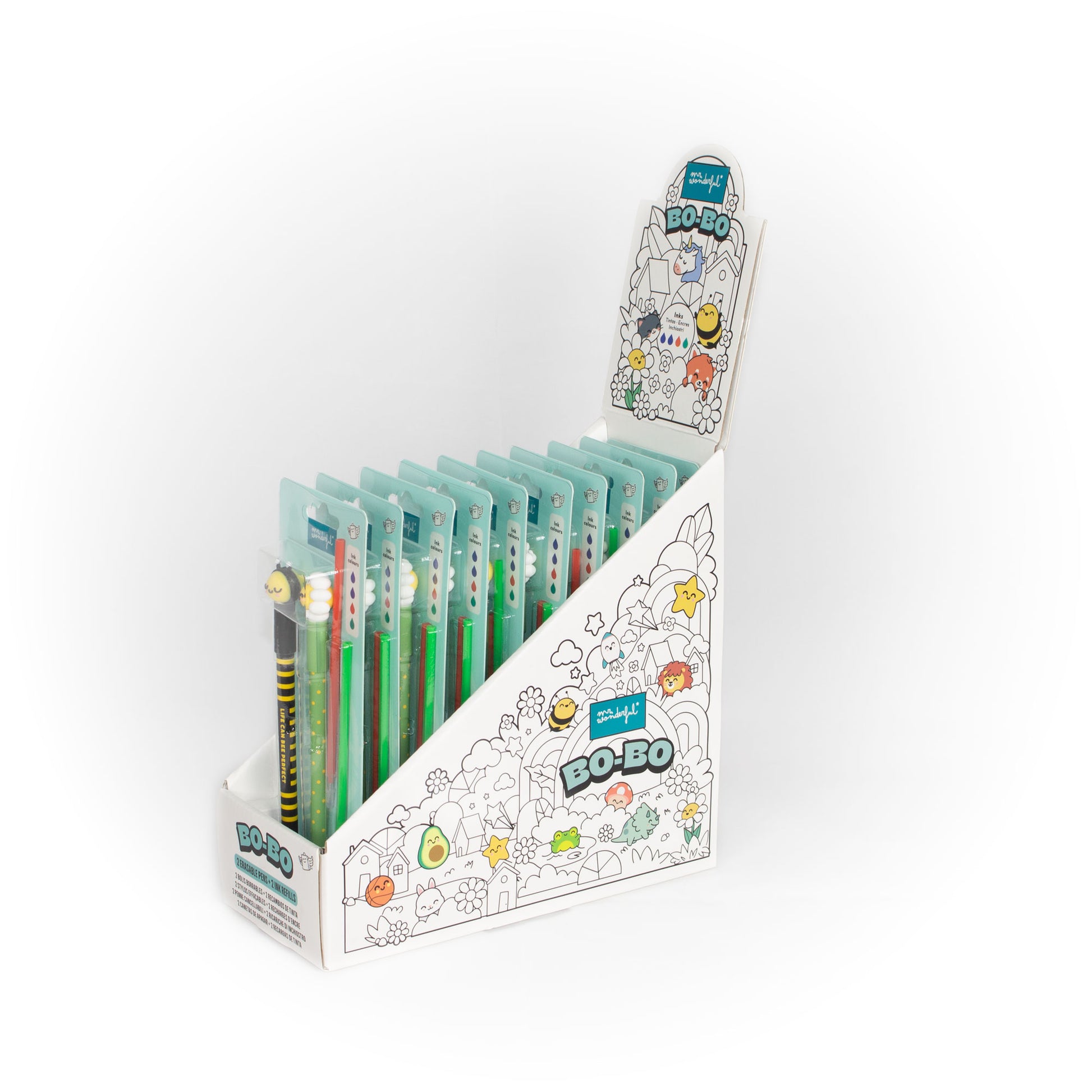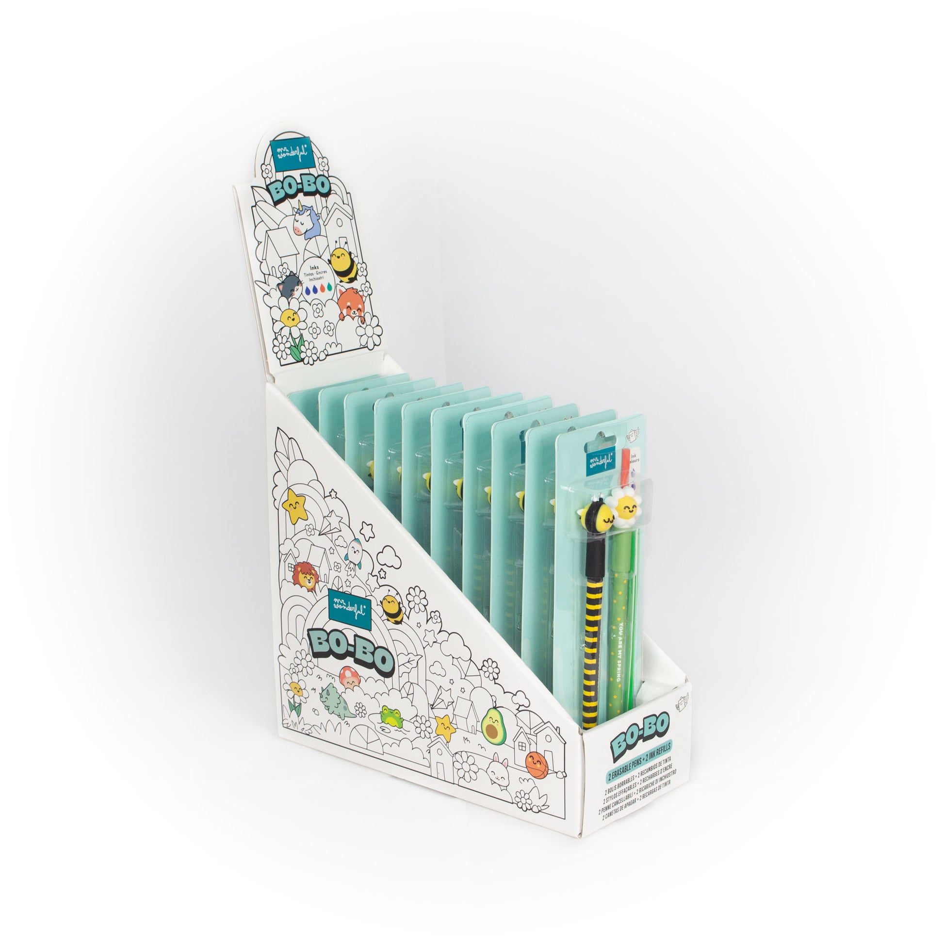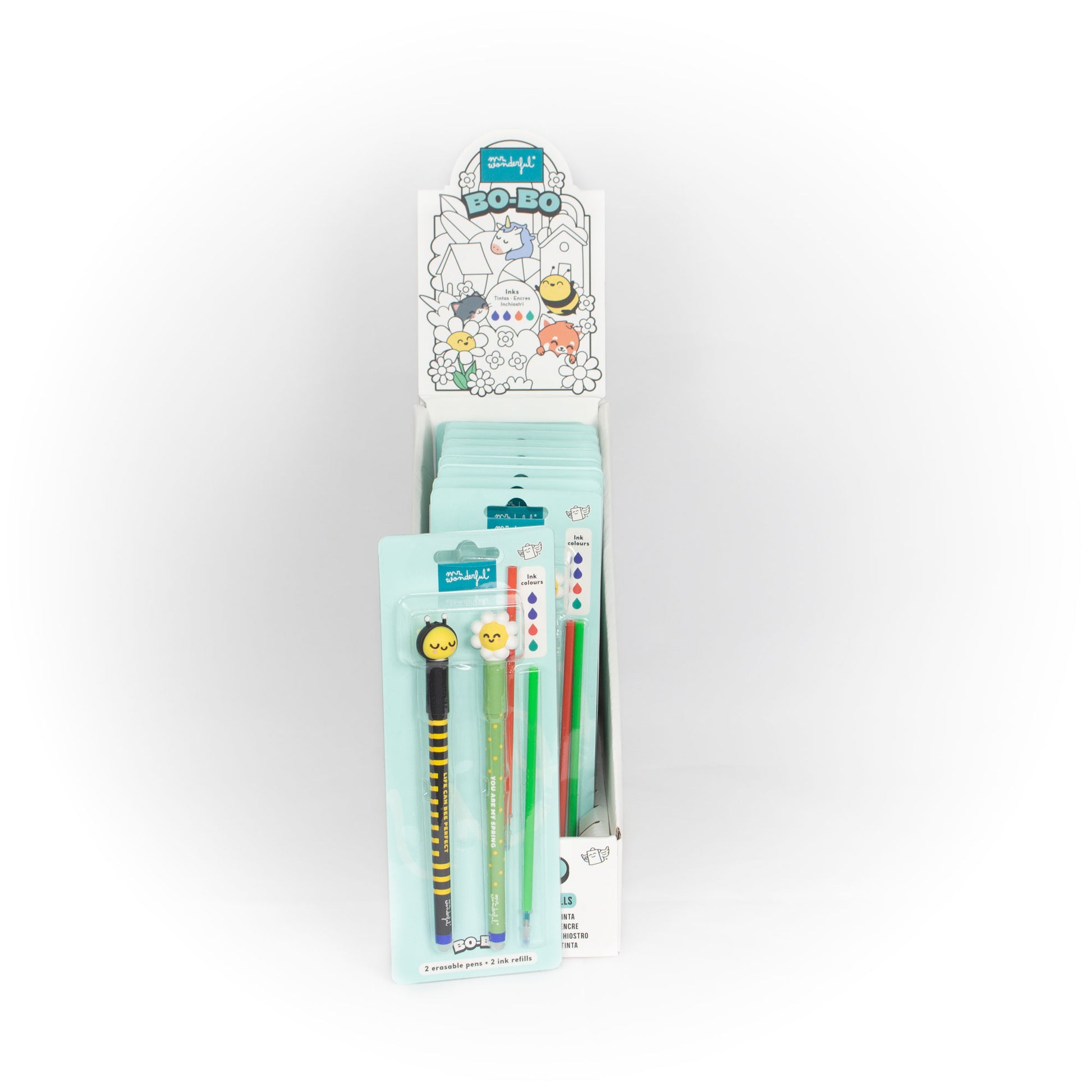 Set compuesto por un bolígrafo borrable Bo-Bo con una divertida abeja Mr. Wonderful en uno de sus extremos y otro con una no menos divertida Margarita, ambos con tinta azul. El set también incluye 2 recambios de tinta para ellos, de colores naranja y verde.