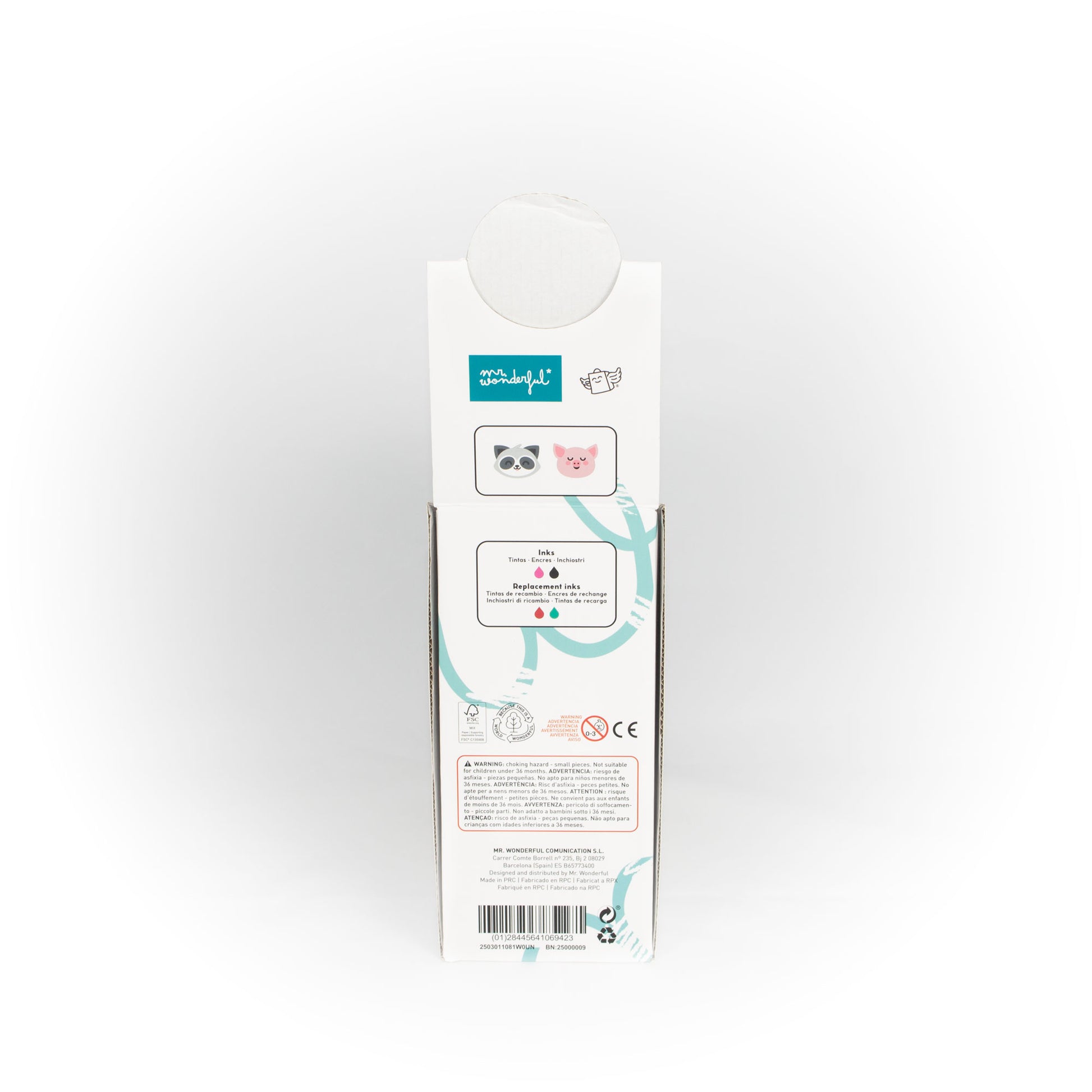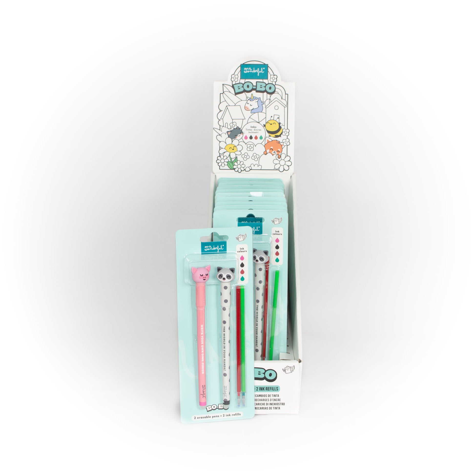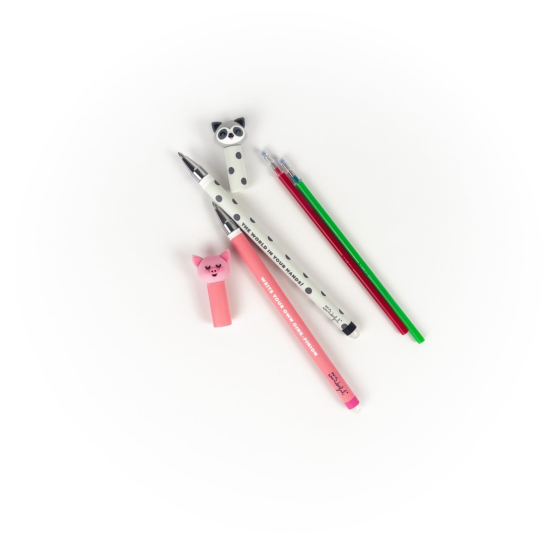 Set compuesto por dos bolígrafos borrables Bo-Bo, con un divertido cerdito (tinta rosa) y un gracioso mapache (tinta negra) Mr. Wonderful respectivamente en uno de sus extremos y 2 recambios de tinta para los mismos, de colores rojo y verde.