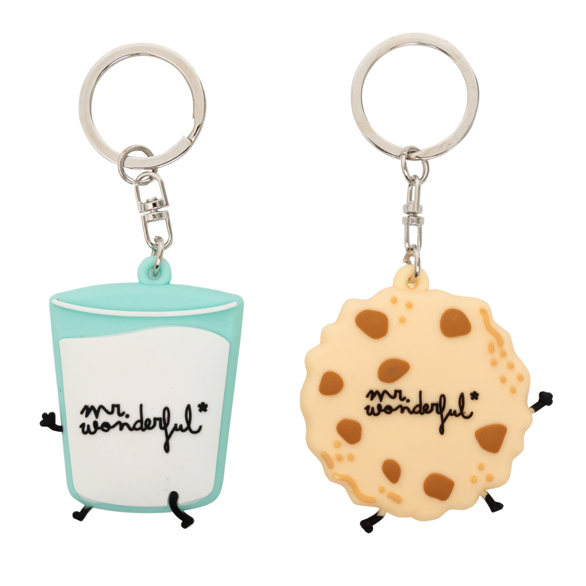 Set de 2 llaveros realizados en caucho, con forma de leche y galleta.