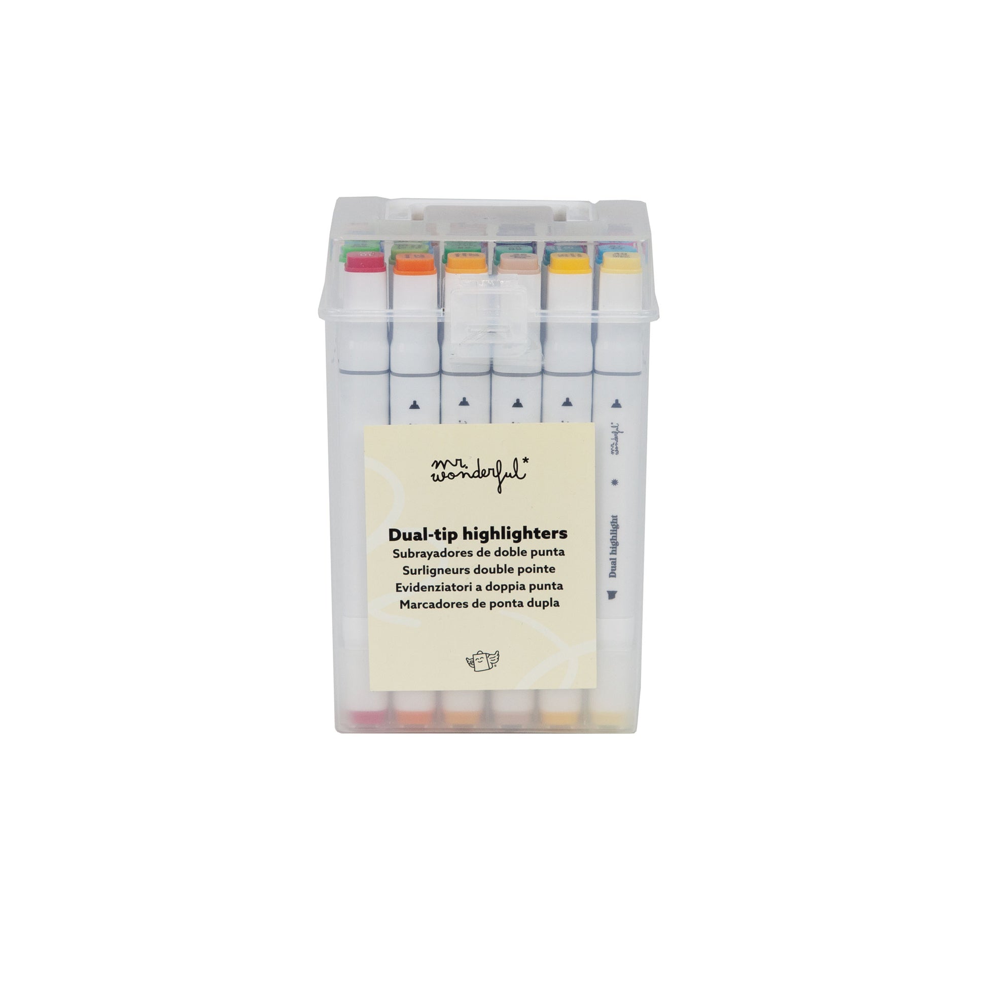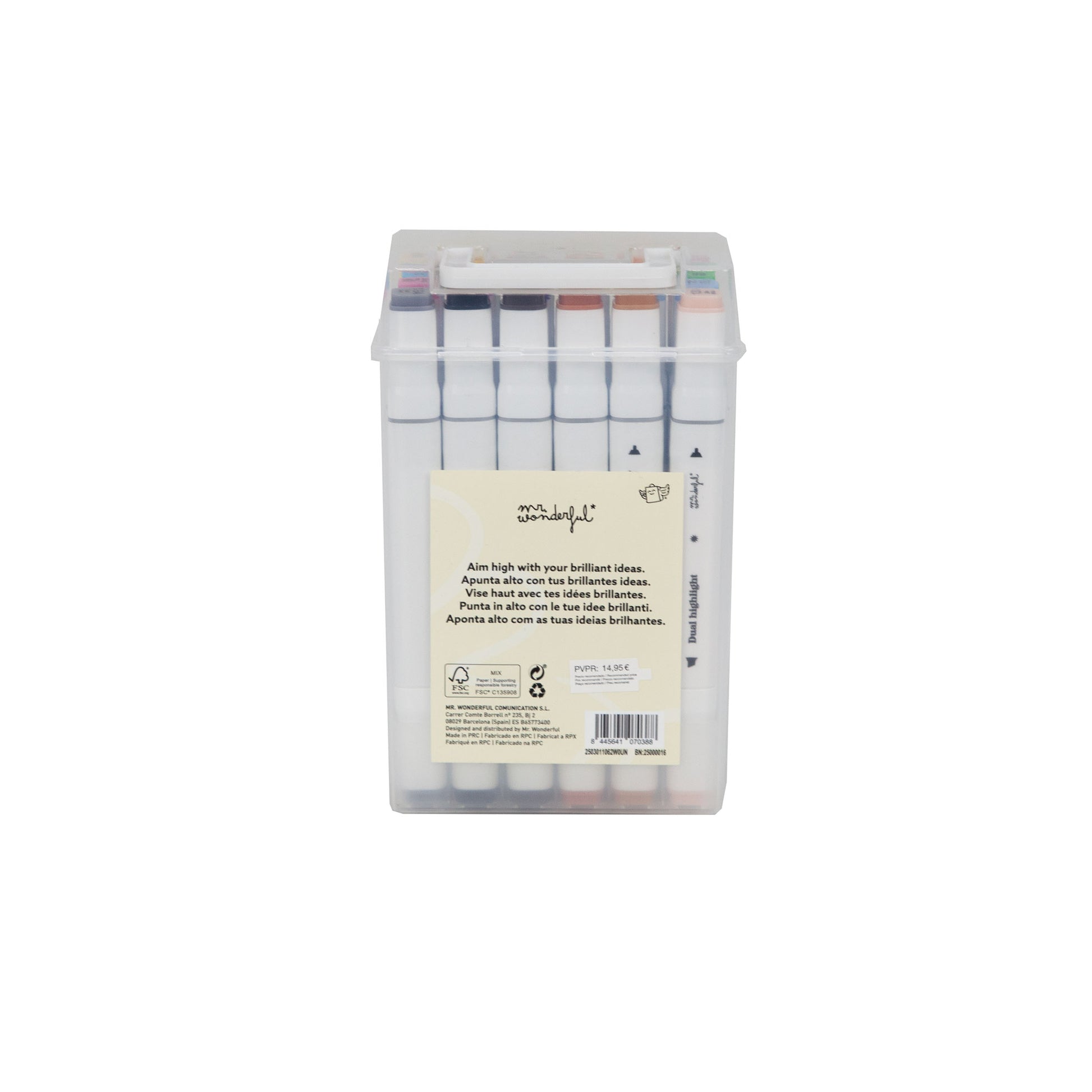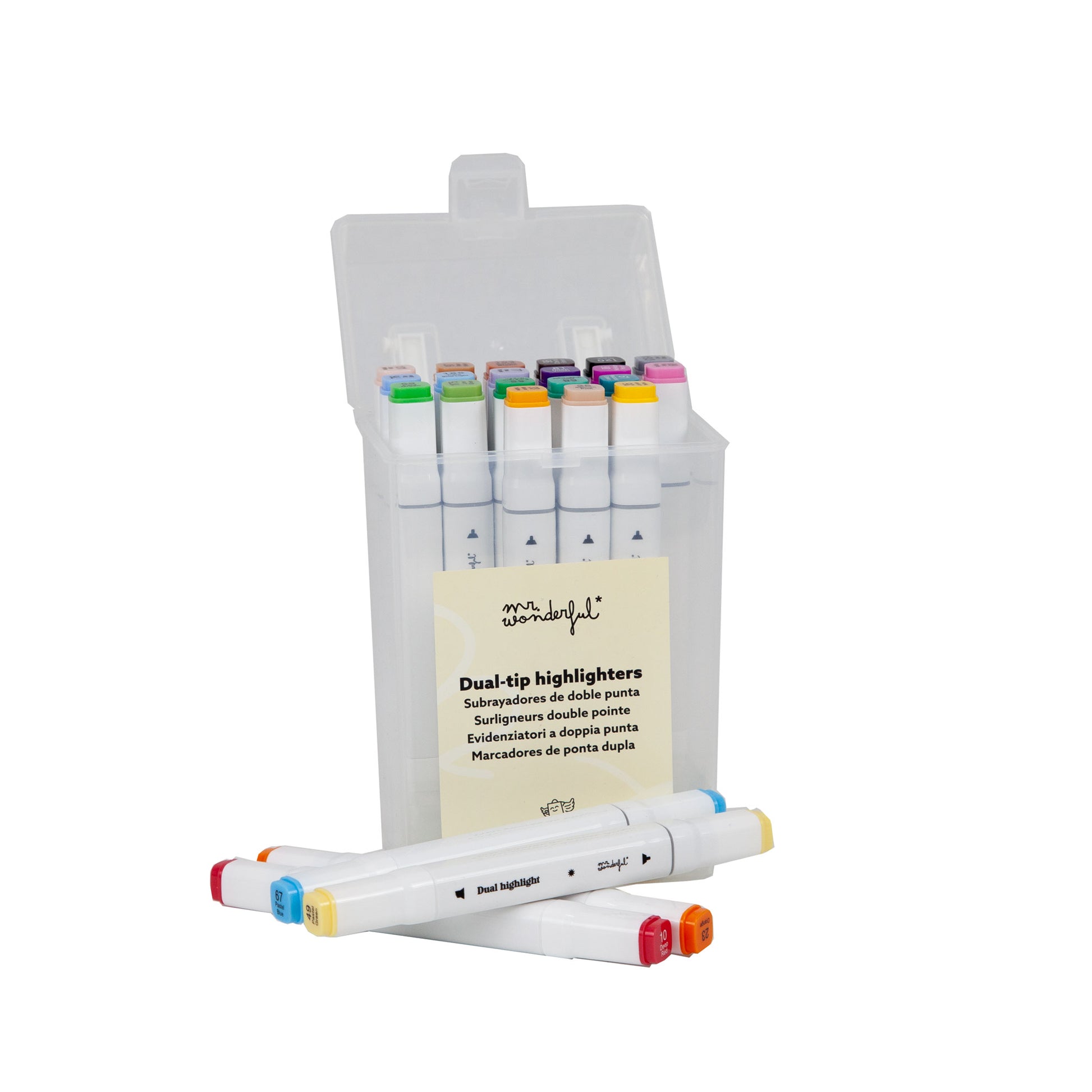 Set presentado en una cajita de plástico transparente con 24 rotuladores de colores y de doble punta en su interior. Una de las puntas es fina, para poder escribir, y la otra está pensada para subrayar o destacar partes del texto escrito.