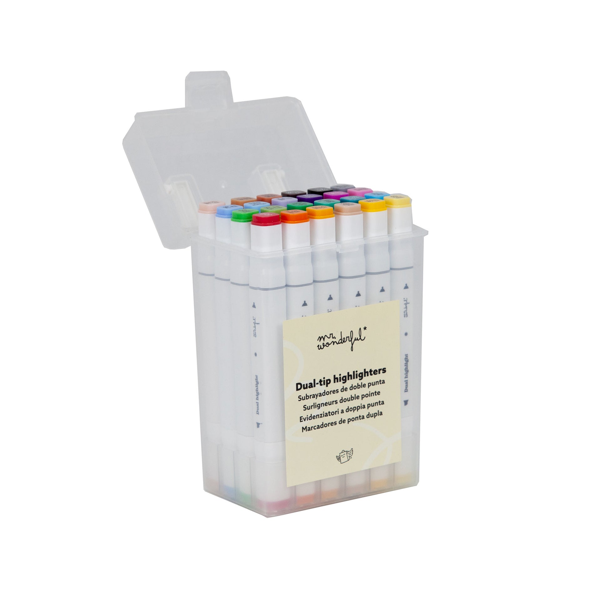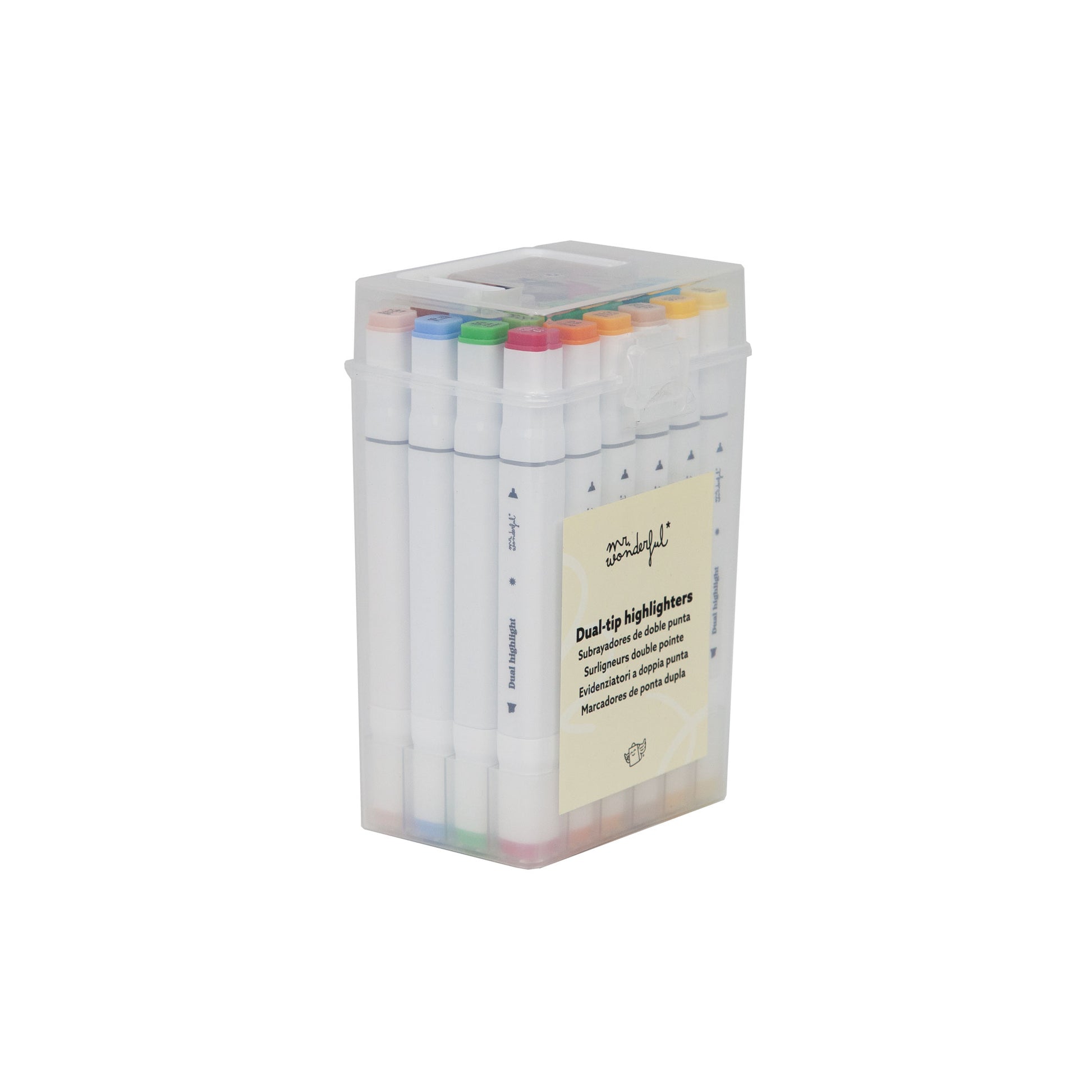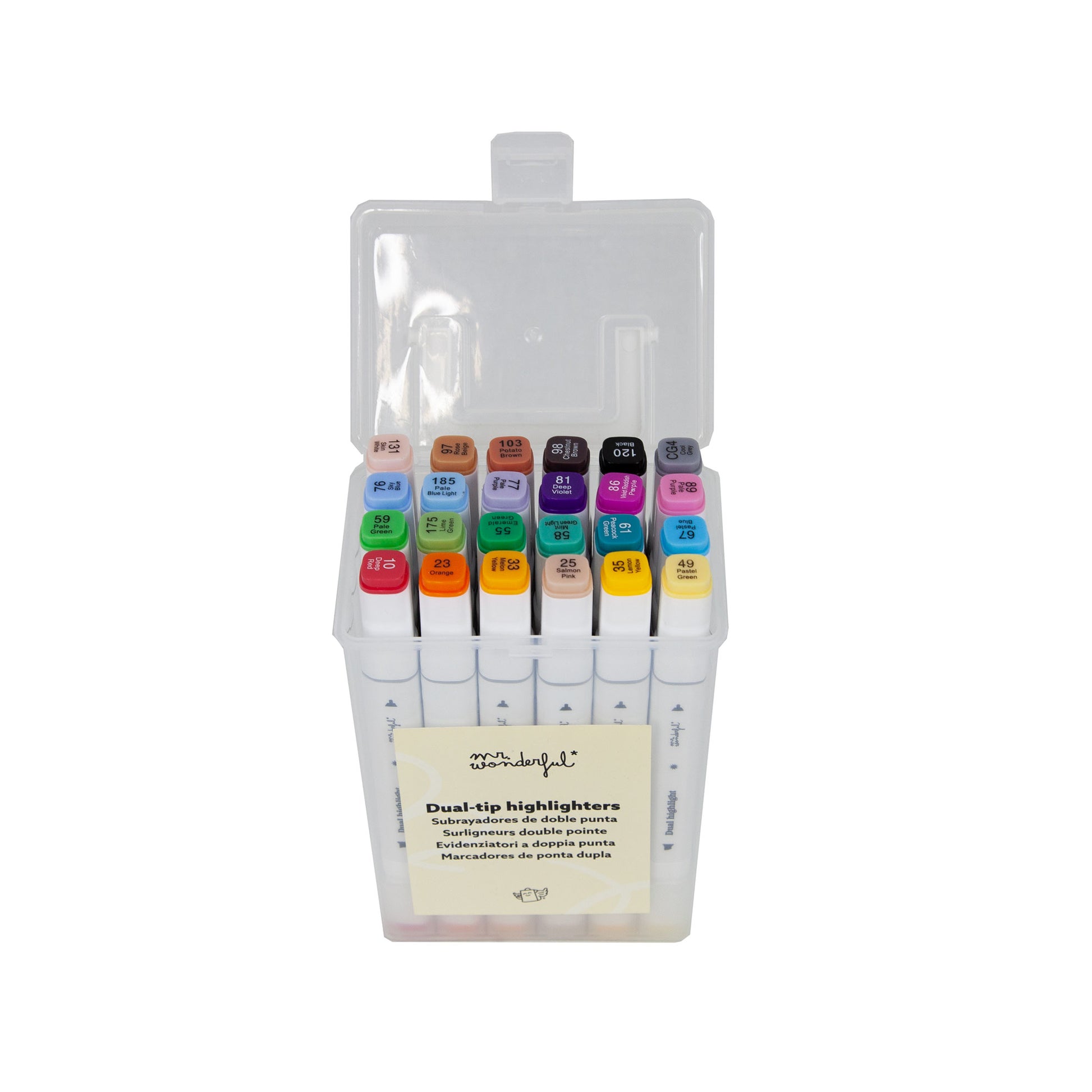 Set presentado en una cajita de plástico transparente con 24 rotuladores de colores y de doble punta en su interior. Una de las puntas es fina, para poder escribir, y la otra está pensada para subrayar o destacar partes del texto escrito.