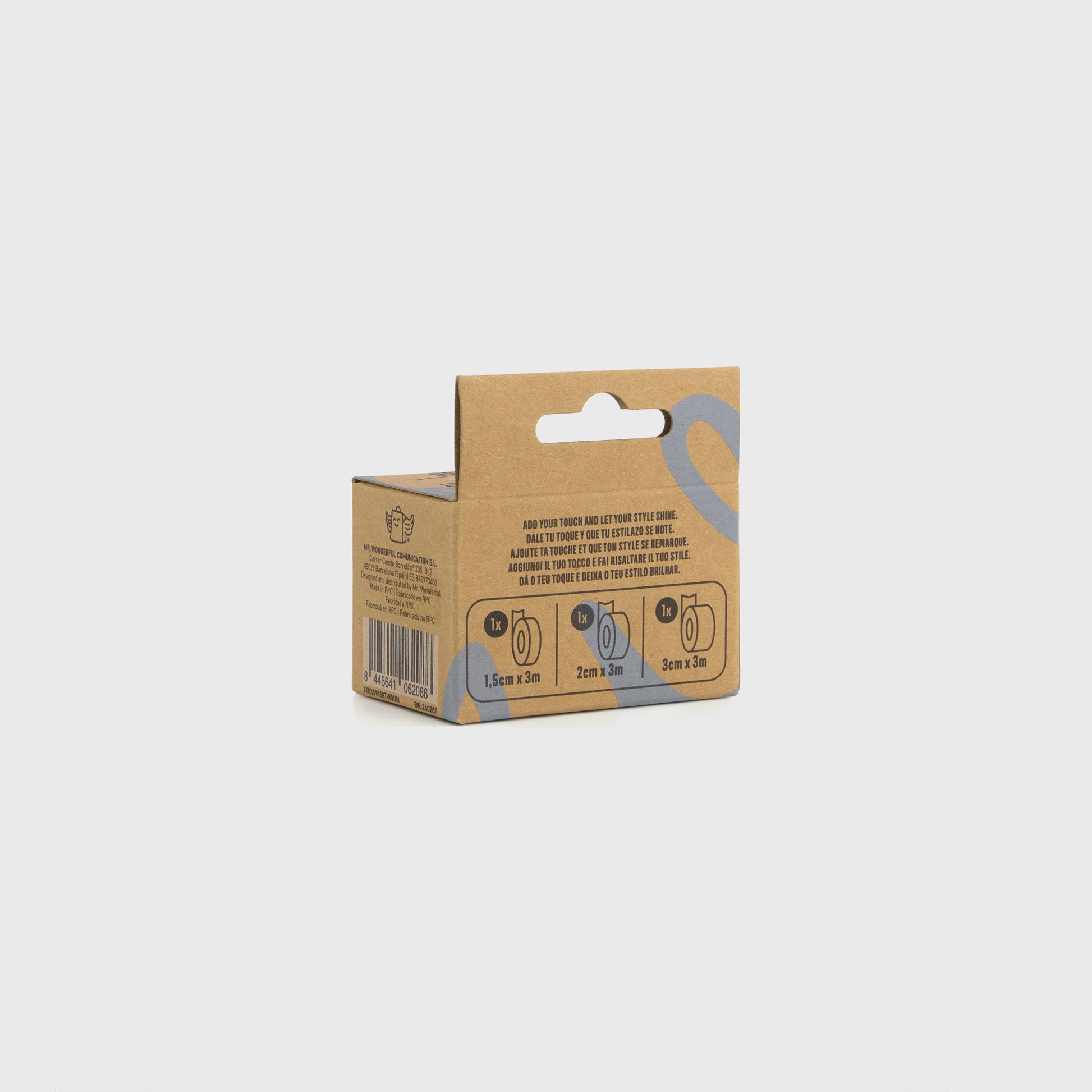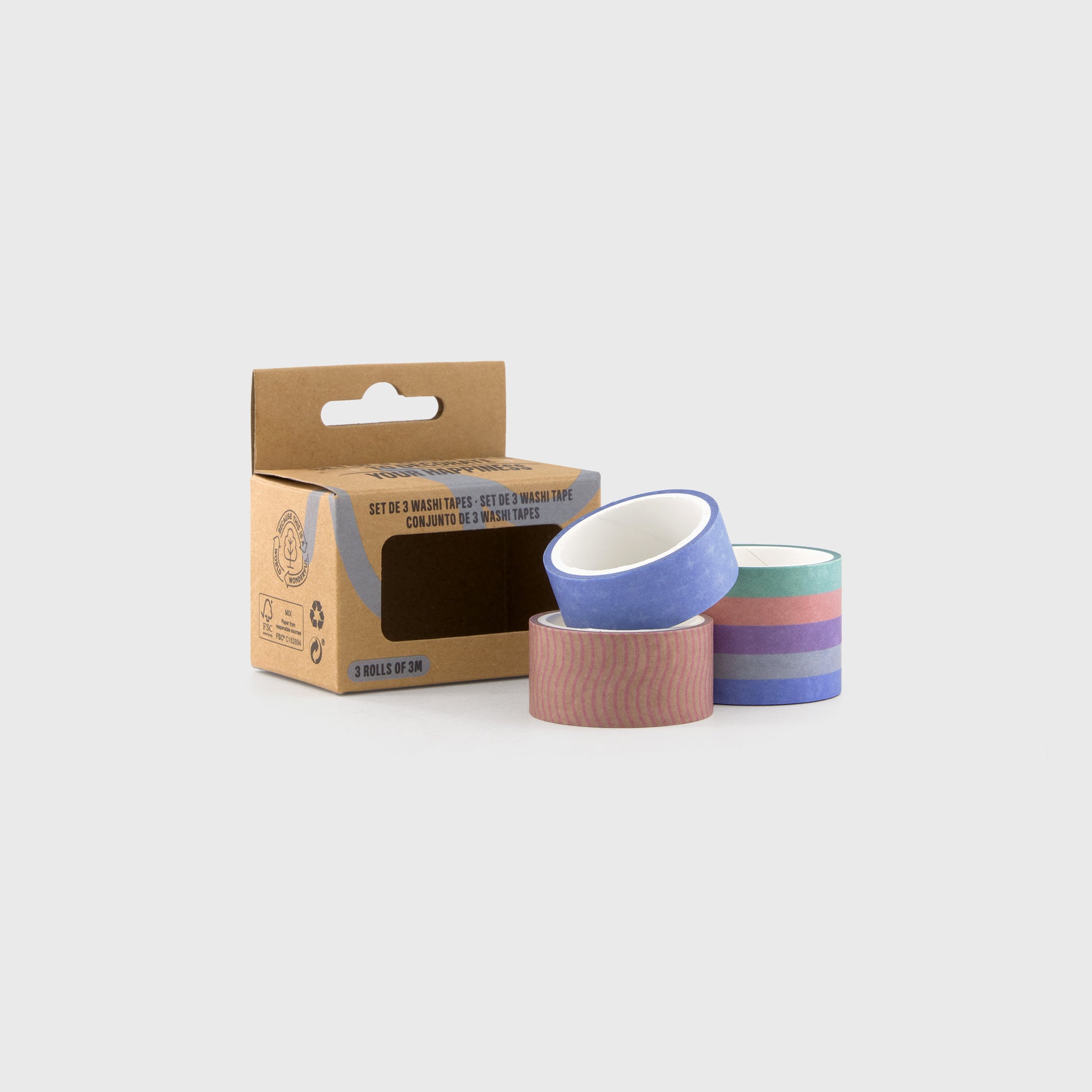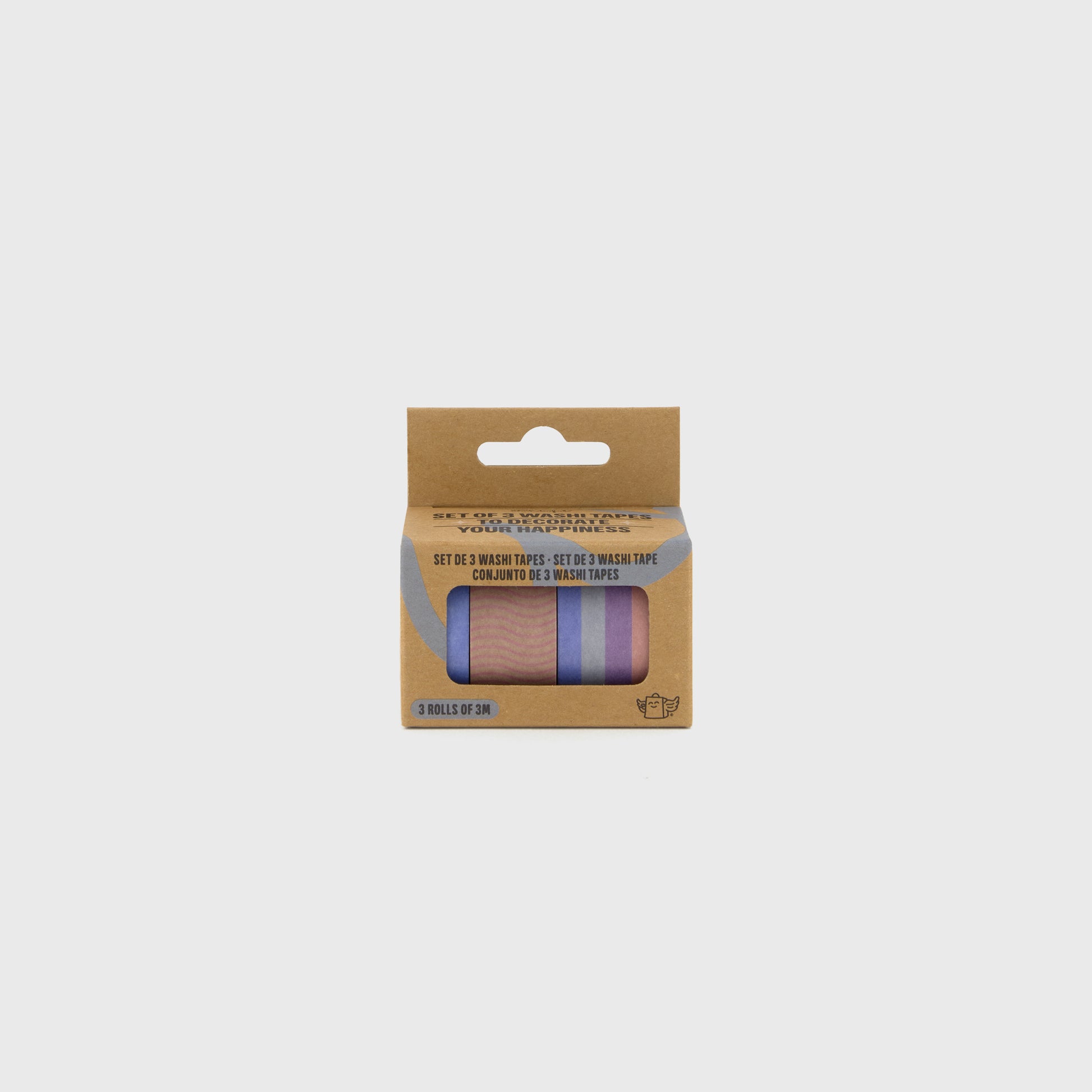 Set de 3 rollos de celo de papel decorado (washi tape), con estampados diseñados por nosotros. El set cuenta con: