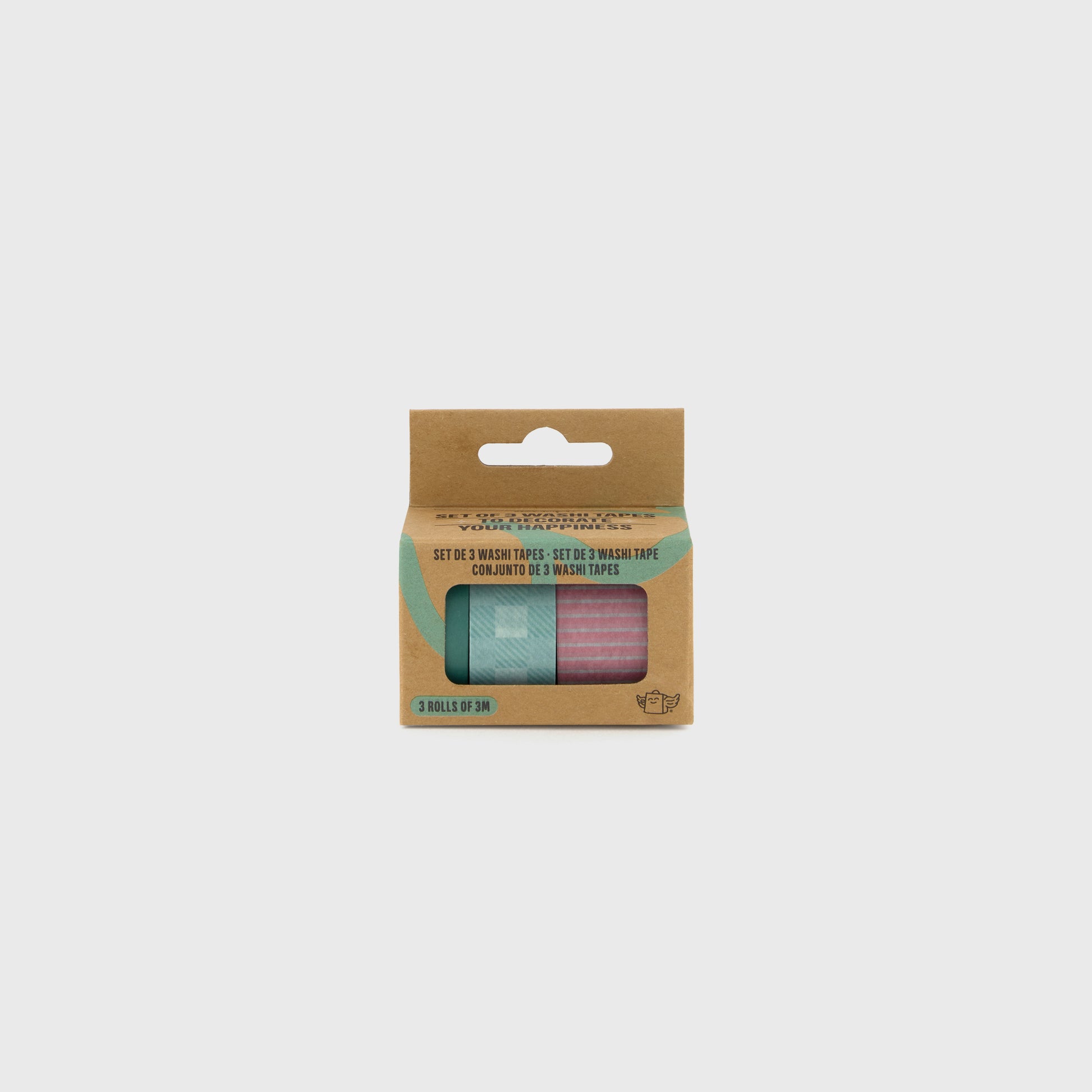 Set de 3 rollos de celo de papel decorado (washi tape), con estampados diseñados por nosotros. El set cuenta con: