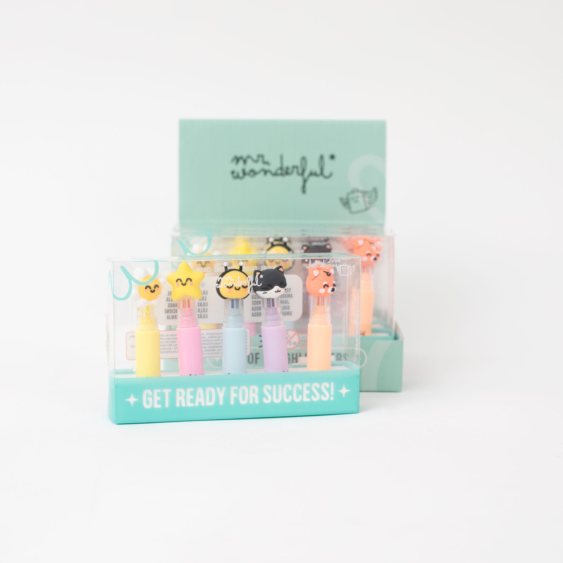 Set de 5 subrayadores en tonos pastel, cada uno de ellos con un tapón en forma de uno de nuestros personajes Mr. Wonderful. Se presentan en un bonito estuche transparente.